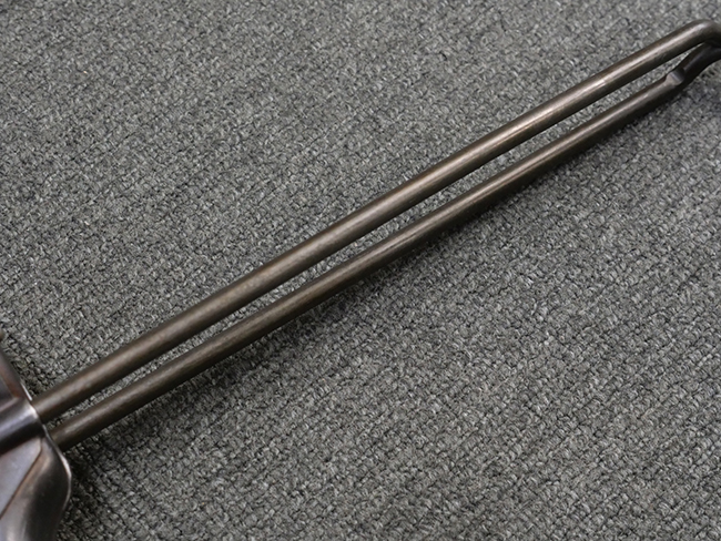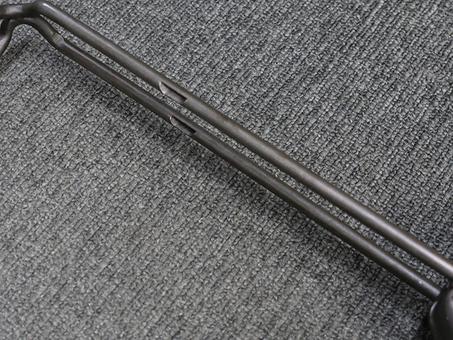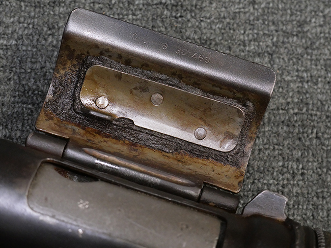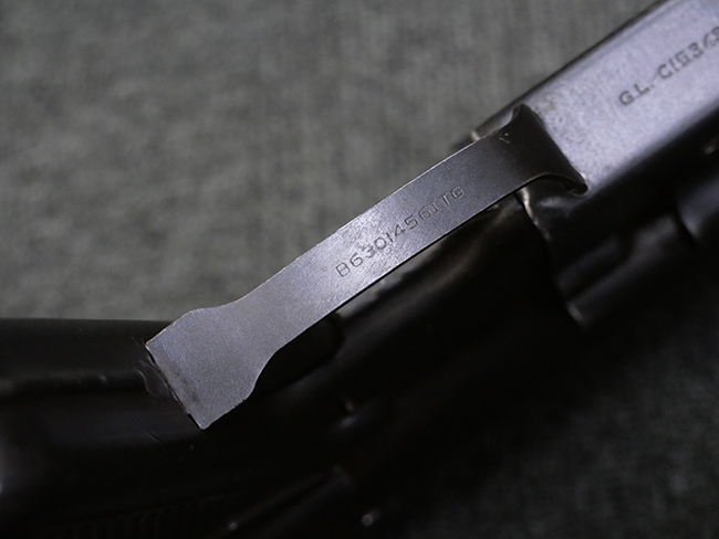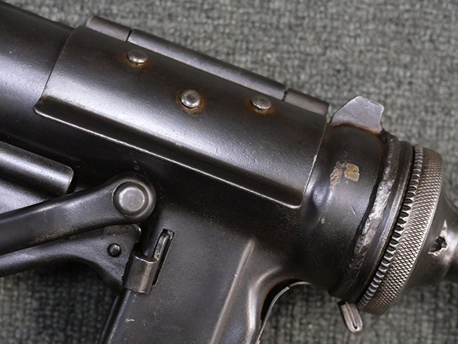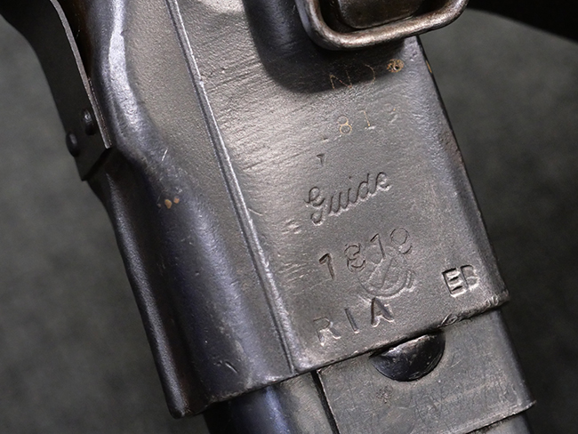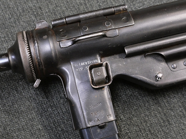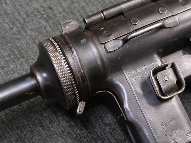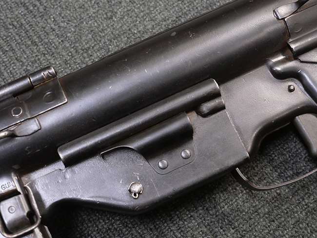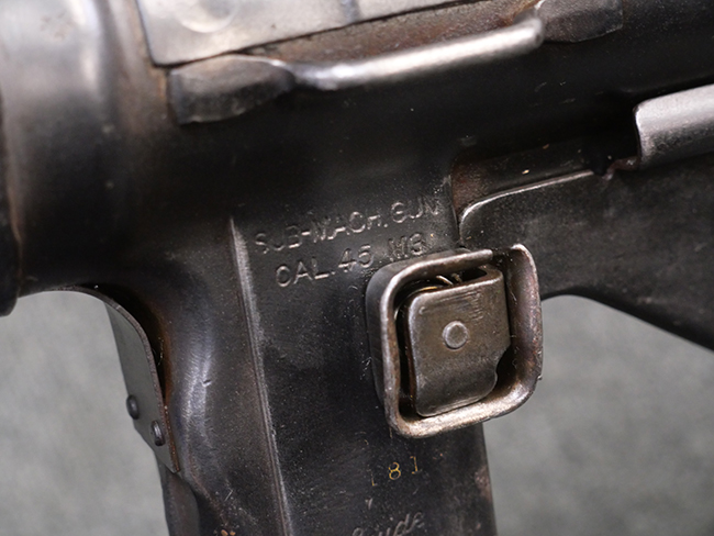 本品はマガジン・キャッチにガードが装備されており、リア・サイト両側が強化されていない仕様のM3 短機関銃です。 ワイヤー・ストックはマガジン・ローダー機能の無いオリジナルのM3タイプの物が付いています。 本品のマガジン・ハウジング左側面には、一部薄くなっているものの「SUB-MACH GUN CAL.45 M3」のモデル名刻印の他、シリアルNo.やガイドランプのメーカー刻印、米国武器省 (Ordnance Department) の検査刻印である「クロス・キャノン」の刻印が入っています。 シリアルNo.の下にはロックアイランド造兵廠にて再整備が行われたことを示す「RIA」の刻印と、1946年~58年にロック・アイランド造兵廠で検査官を担当していたErnest Blindのイニシャルである「EB」の刻印が見られます。 その他、トリガー・ガード下部には「B・301456ITG」の刻印が入っており、ハウジング・アッセンブリー下部には「G.L. C 153432」の刻印が打刻されています。