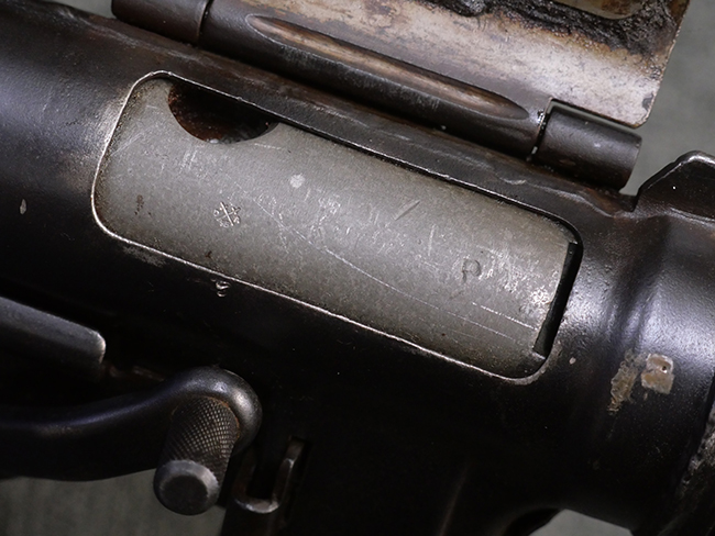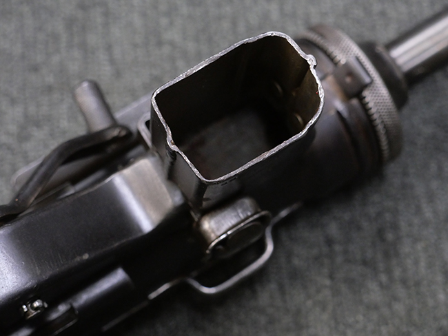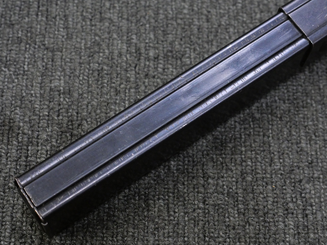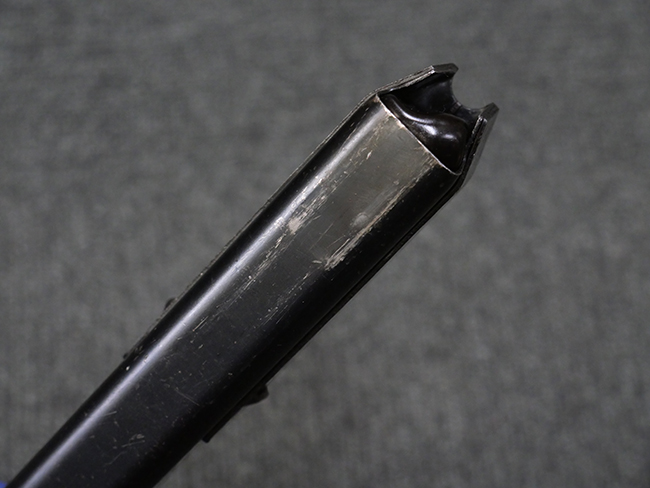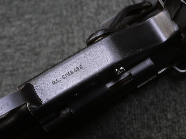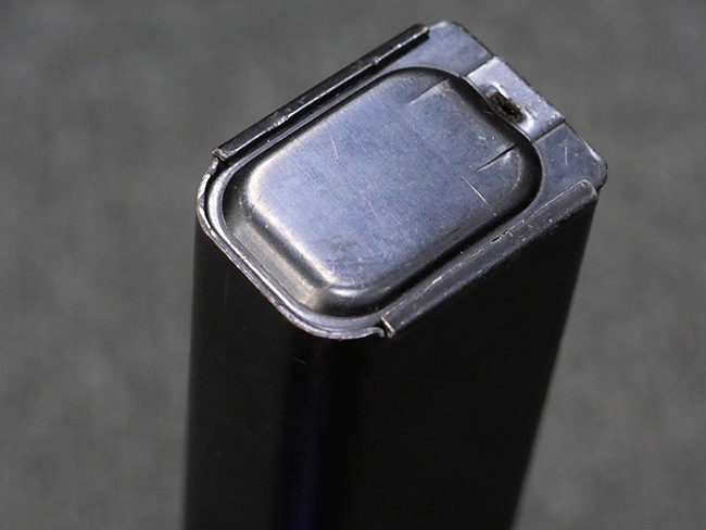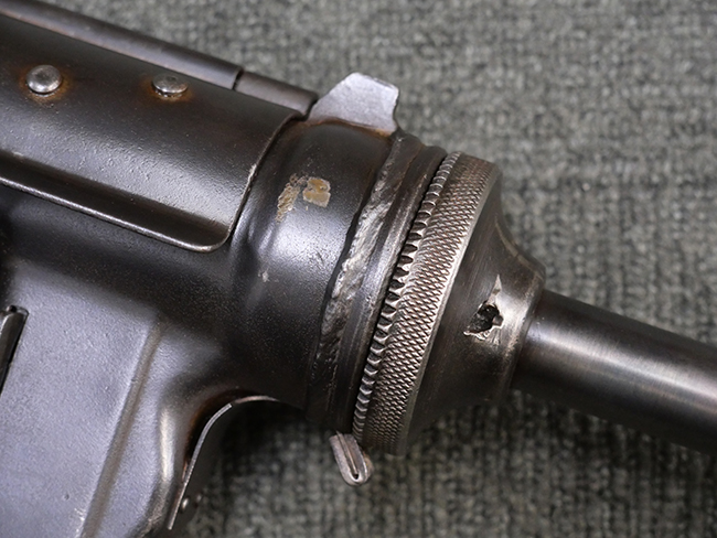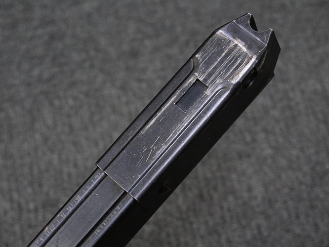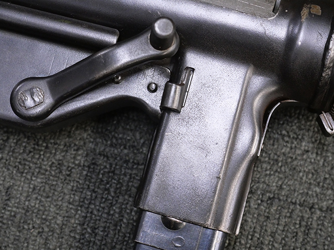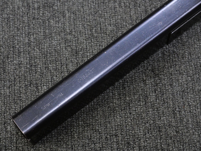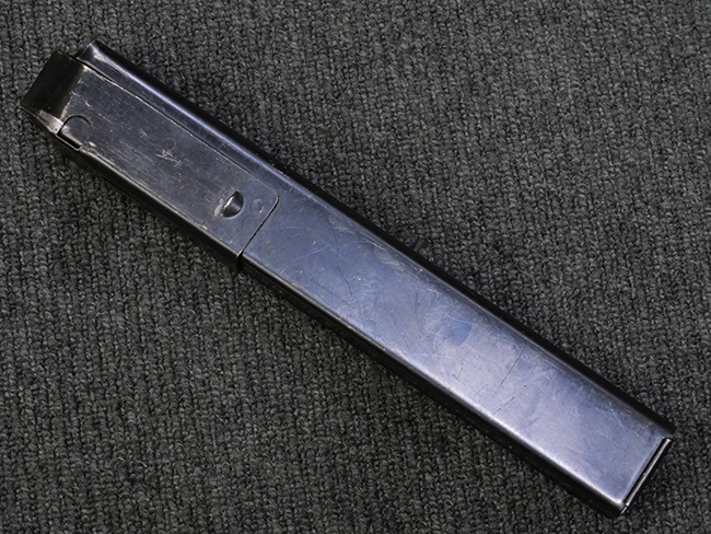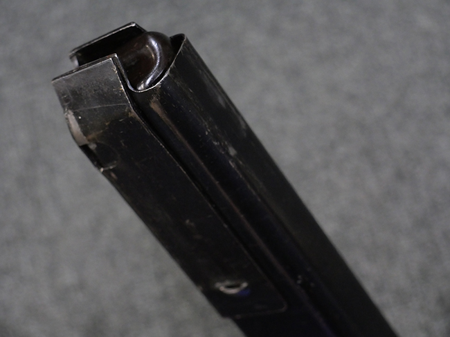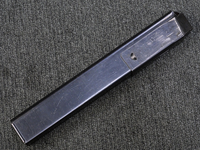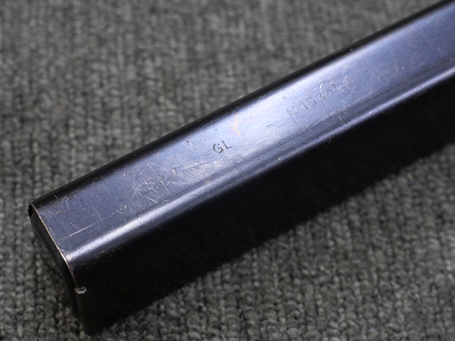 本品は全体に若干の使用感が見られ、打ち傷や擦れ、経年による表面仕上げの褪色の他、一部に金属の地肌が表れている箇所が見られるものの、目立った欠損等は見られず、概ねしっかりとした状態が保たれています。 銃身には細かな表面錆痕が見られるものの、大きな朽ち込み痕等は見られません。 銃身に大きな歪み反りは見られません。 マガジンの着脱やワイヤー・ストックの伸縮、エジェクション・ポート・カバーの開閉については問題なく行う事が可能です。 また、欠品しやすいエジェクション・ポート・カバー内のフェルトについては3割ほどの面積で残っています。 付属の30連マガジンには「SPW GL C-153427」の刻印が入っており、若干の小傷や擦れは見られるものの、目立った変形等は見られず、ブルー仕上げも比較的良好に残っています。 尚、マガジン・スプリングは入っています。