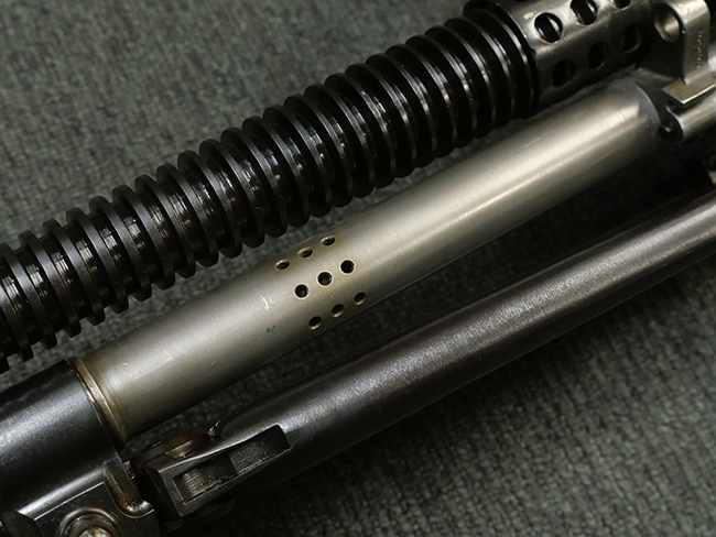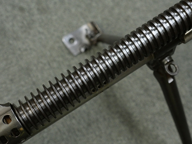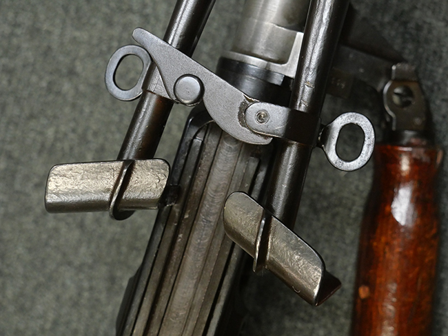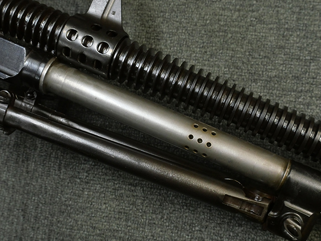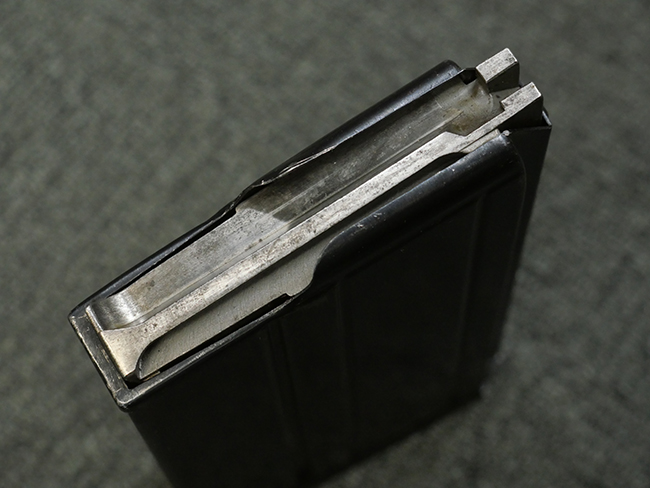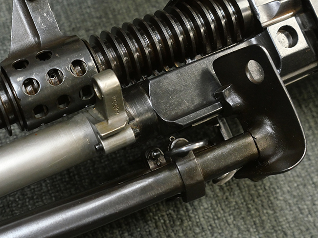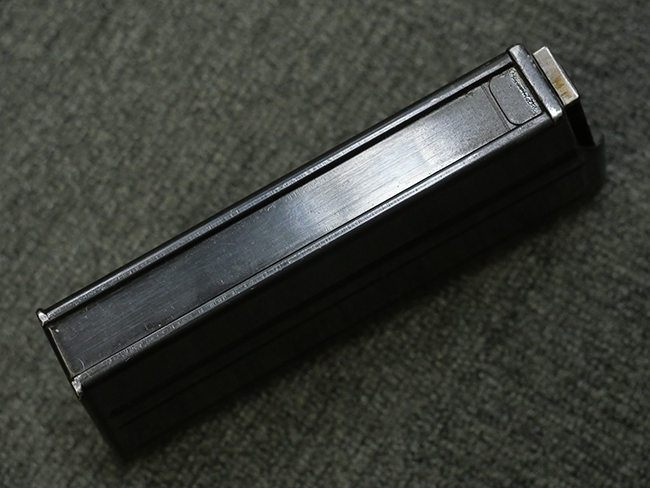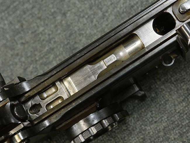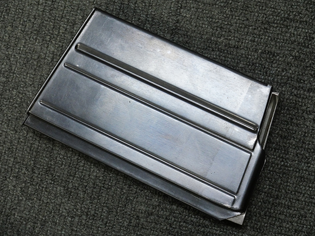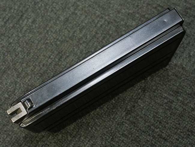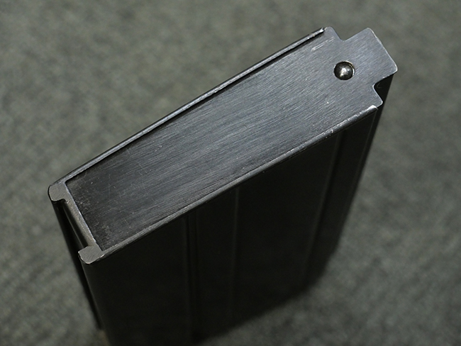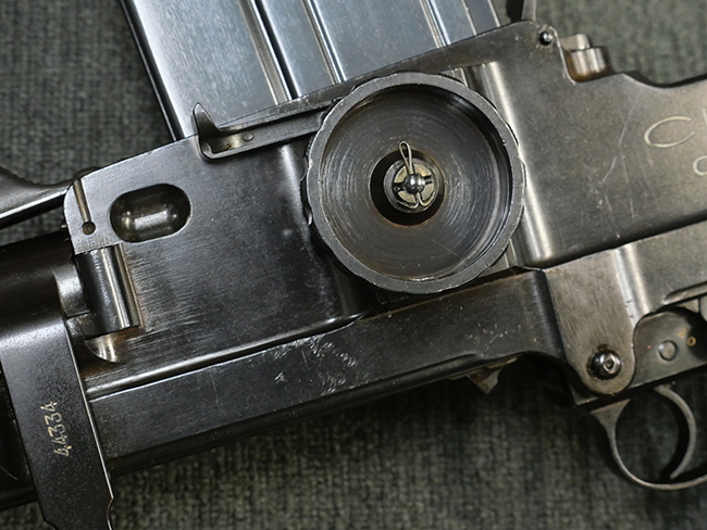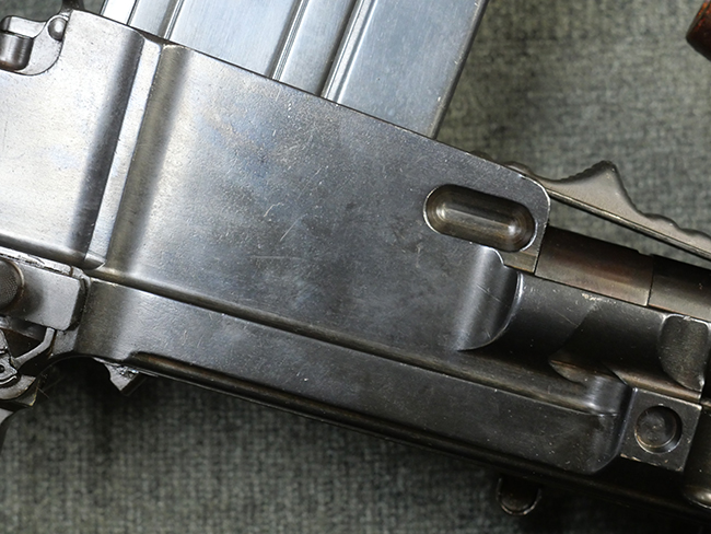 ダイヤル式リア・サイトの調整やマガジンの着脱、マガジン挿入孔及び排莢孔カバーの開閉、キャリング・ハンドルの角度変更、ショルダー・レストの展開、二脚の展開/収納操作については問題なく行う事が可能です。 また、セレクター・レバーの切り替えも可能ですが、トリガーとの連動はありません。 付属のマガジンは大きな変形等も見られず、全体に表面仕上げが残った状態が保たれています。 尚、マガジン・スプリングは入っています。