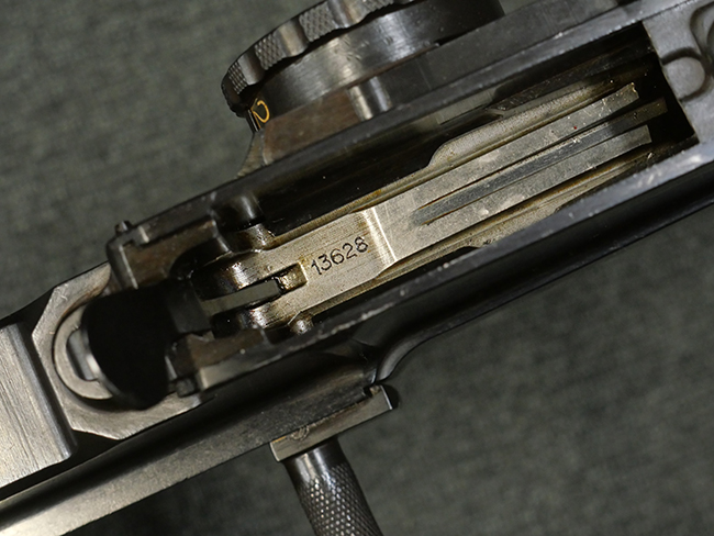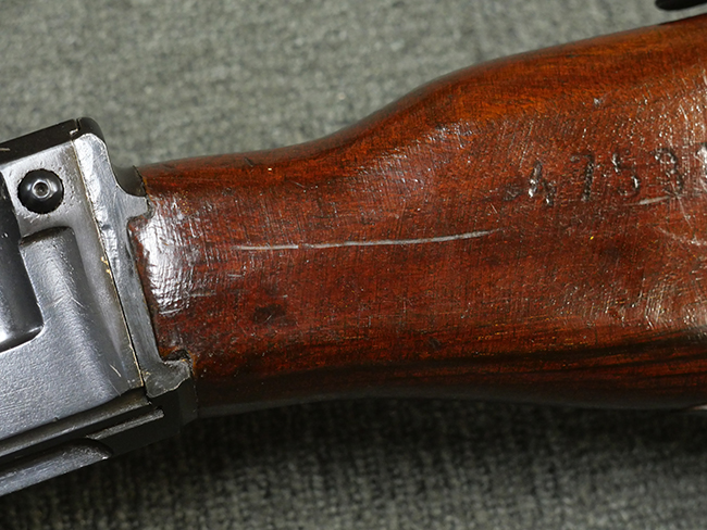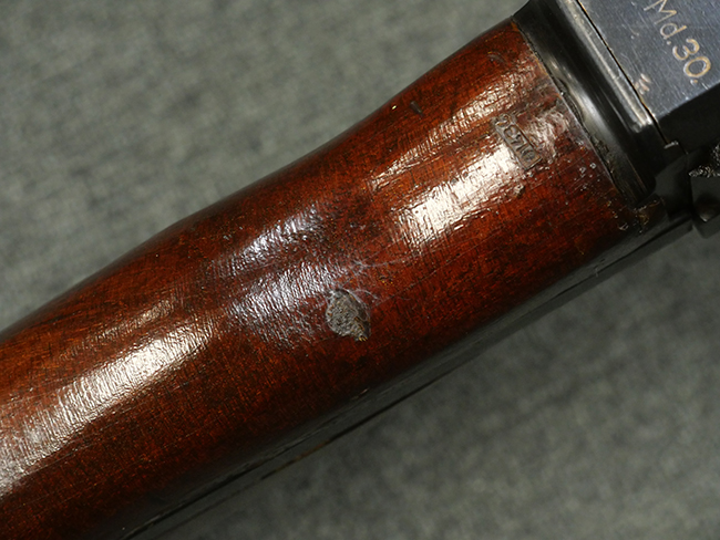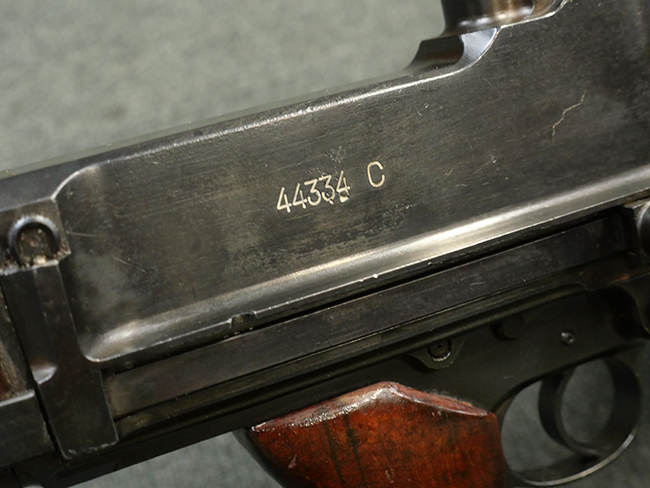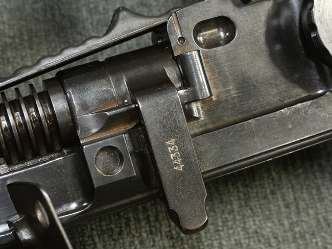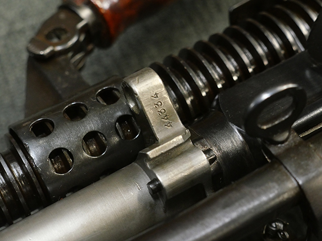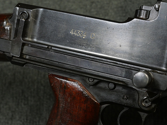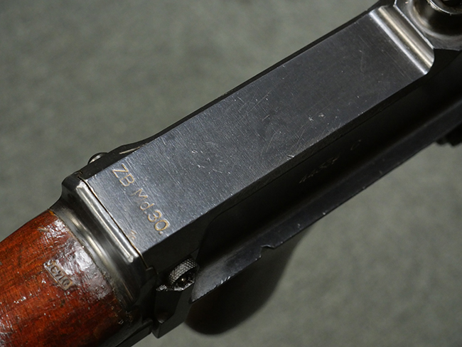 本品のレシーバー右側面にはシリアルNo.44334Cが確認でき、これは銃身交換レバー、ガスチューブ基部でマッチしています。 その他の箇所ではボルトが13628、ストック上面根元に01434、バットストック左面に47531の刻印が見られる他、フラッシュ・ハイダーには電気ペンによる8592の文字が入っています。 レシーバー左側面にはコプサ・ミカ (Uzinele Metallurgice Copsa Mica si Cugir)で生産されたことを示す「CMC CUGIR」の刻印が打刻されており、ルーマニアで生産された個体となっています。 レシーバー上面にはモデル名の「ZB Md.30.」が確認出来ます。