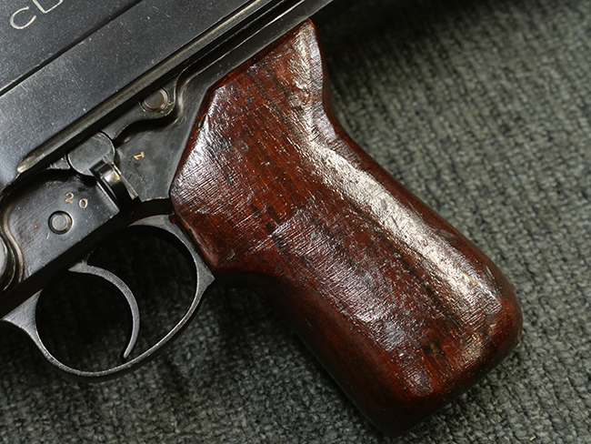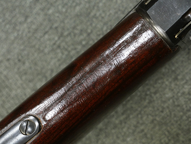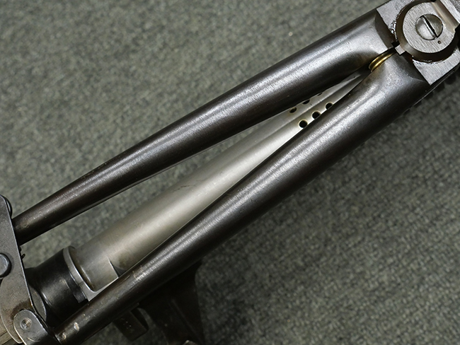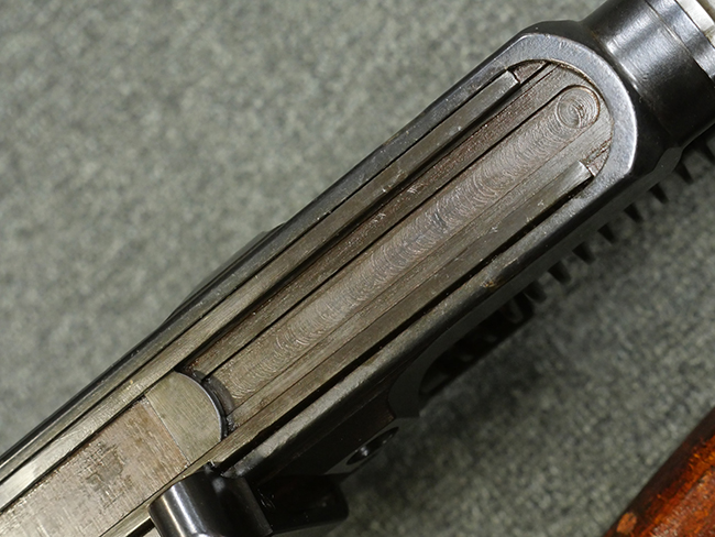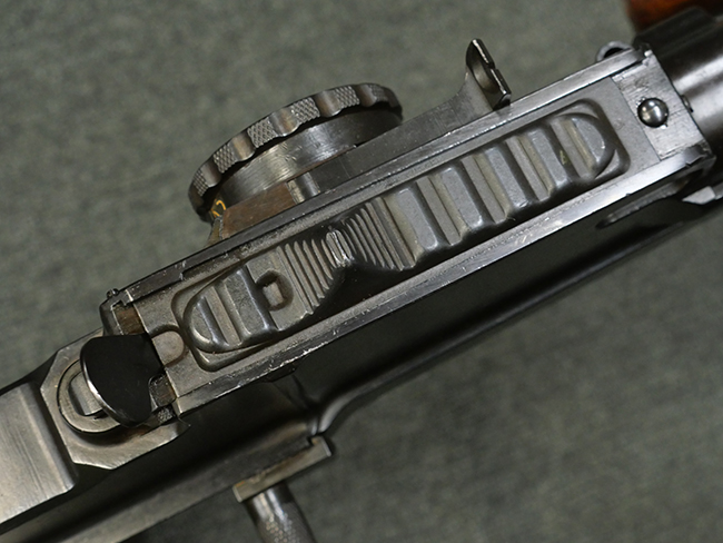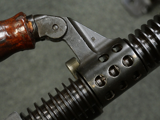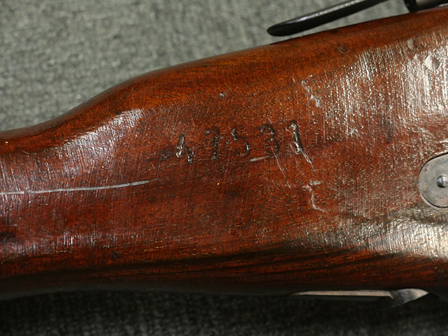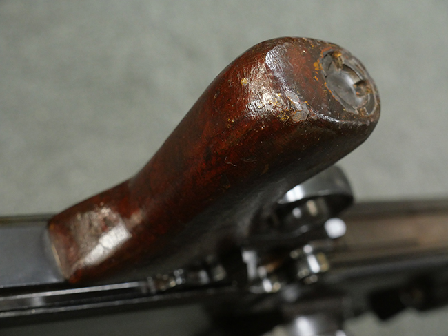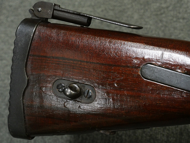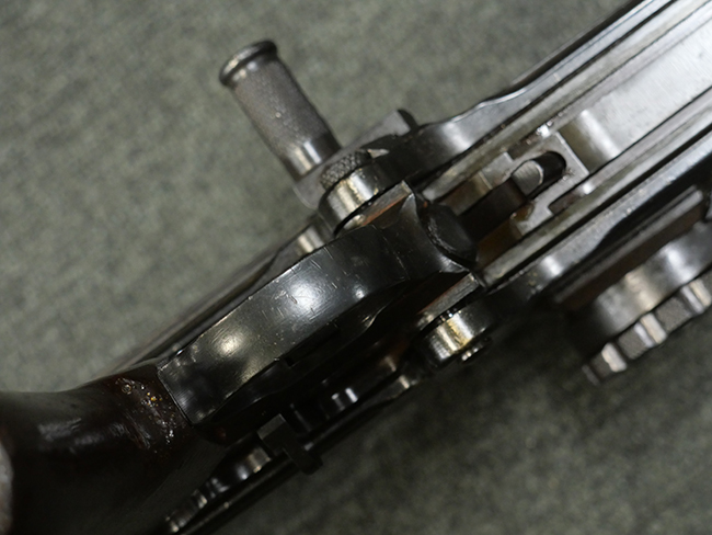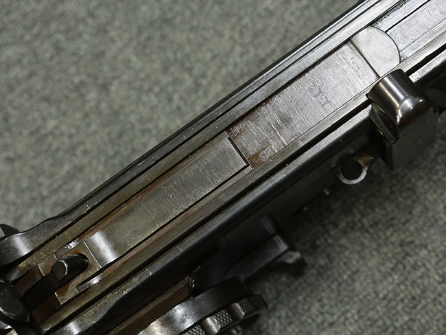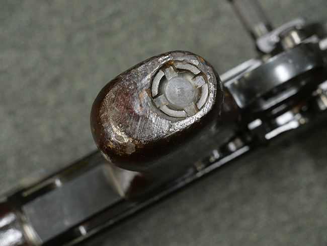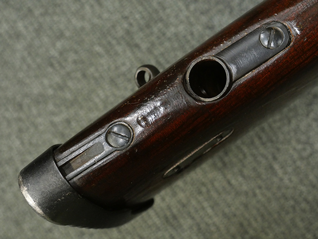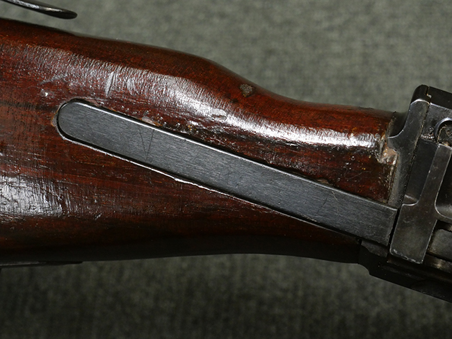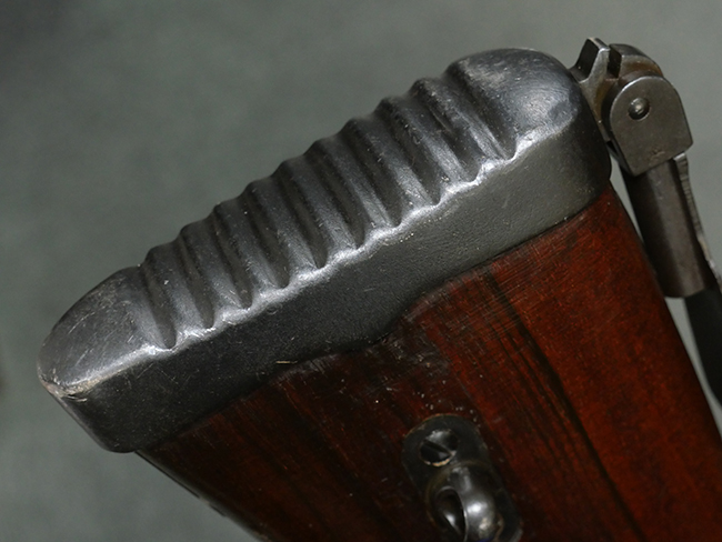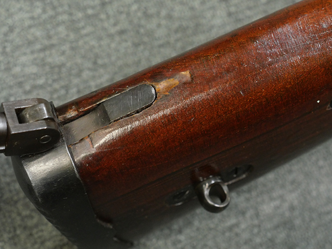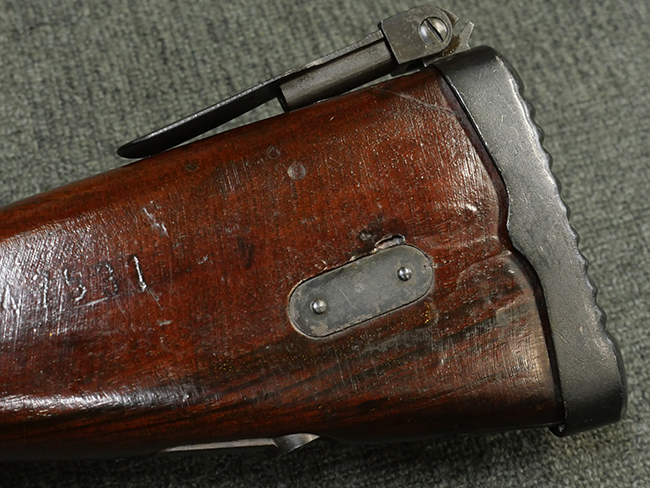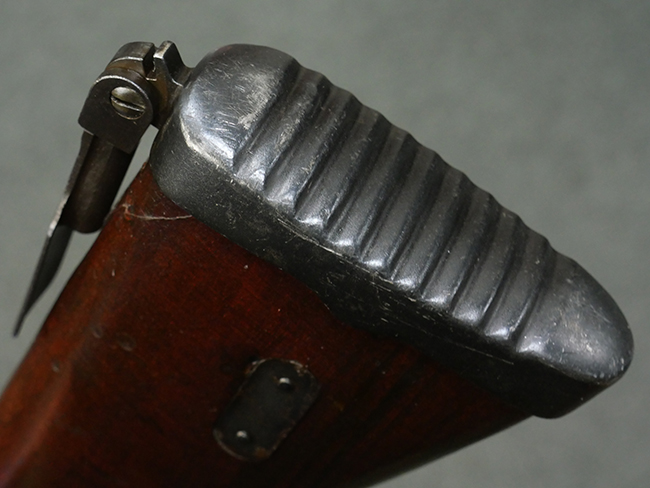 本品の金属部には若干の擦れや小傷、表面錆痕が見られるものの、目立った欠損等は見られず、大部分にブルー仕上げが残った状態が保たれています。 フラッシュ・木部は若干の打ち傷や線傷が見受けられますが、こちらも総じて大きな欠損等の見られない状態が保たれています。 木部は艶のあるニス仕上げとなっており、グリップやストックに比べてキャリング・ハンドルの色合いが僅かに明るい印象ですが、大きな違和感は見られません。 傷み易いバット・プレート部には角部を中心に若干の打ち傷や線傷が見られますが、大きな腐食等は見られません。