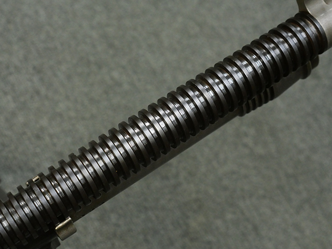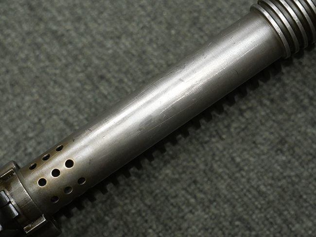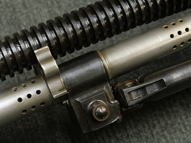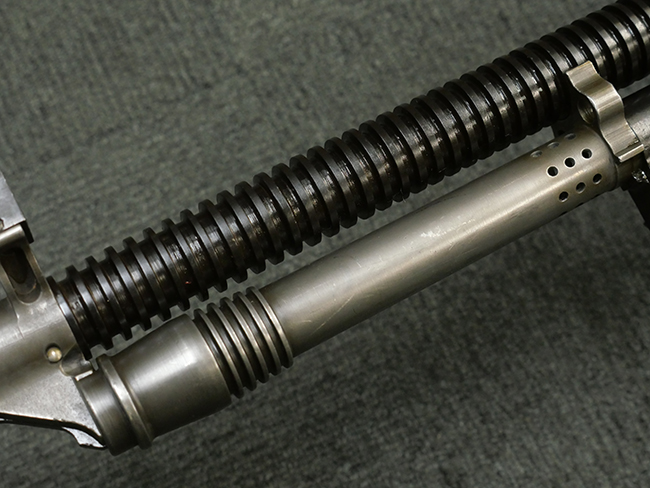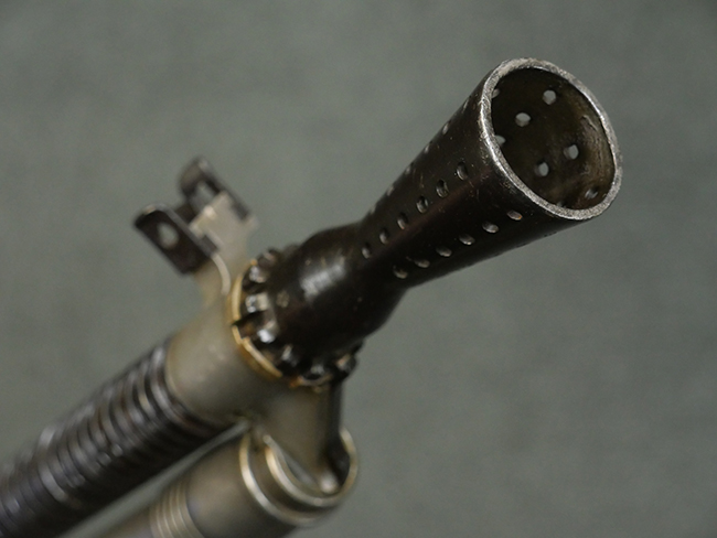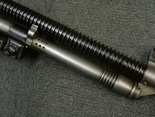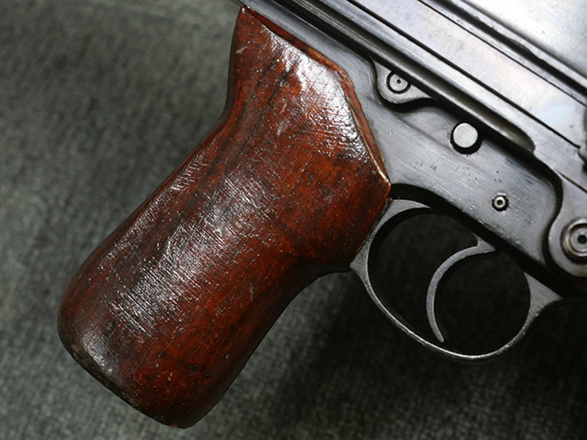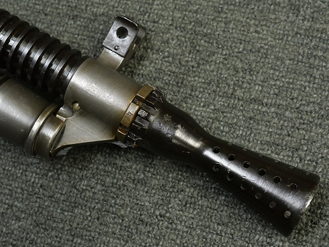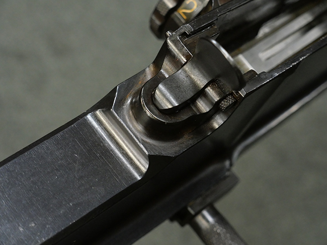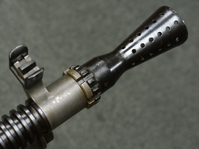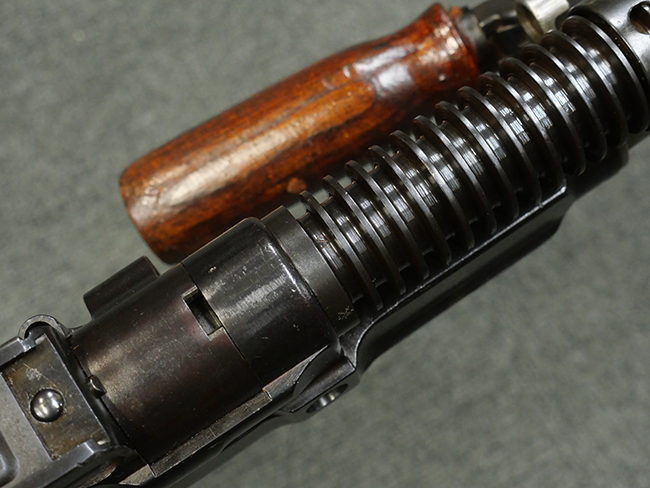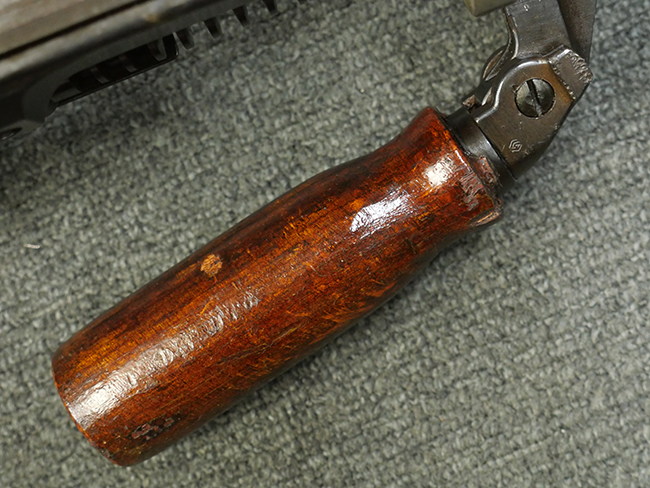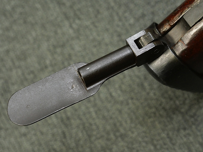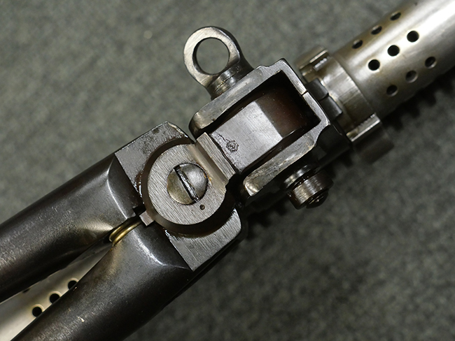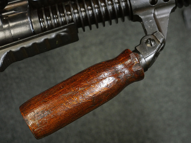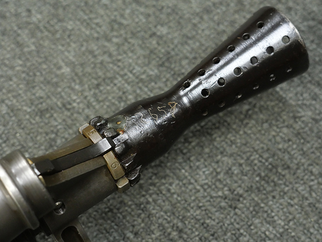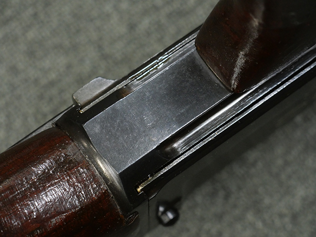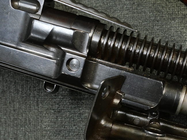 本品の金属部には若干の擦れや小傷、表面錆痕が見られるものの、目立った欠損等は見られず、大部分にブルー仕上げが残った状態が保たれています。 フラッシュ・木部は若干の打ち傷や線傷が見受けられますが、こちらも総じて大きな欠損等の見られない状態が保たれています。 木部は艶のあるニス仕上げとなっており、グリップやストックに比べてキャリング・ハンドルの色合いが僅かに明るい印象ですが、大きな違和感は見られません。 傷み易いバット・プレート部には角部を中心に若干の打ち傷や線傷が見られますが、大きな腐食等は見られません。