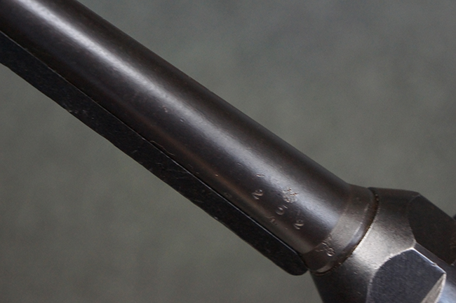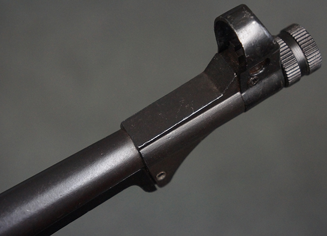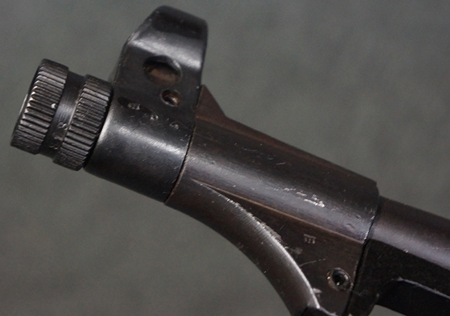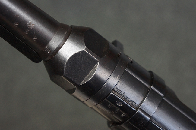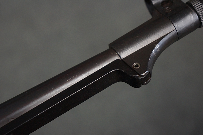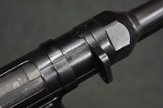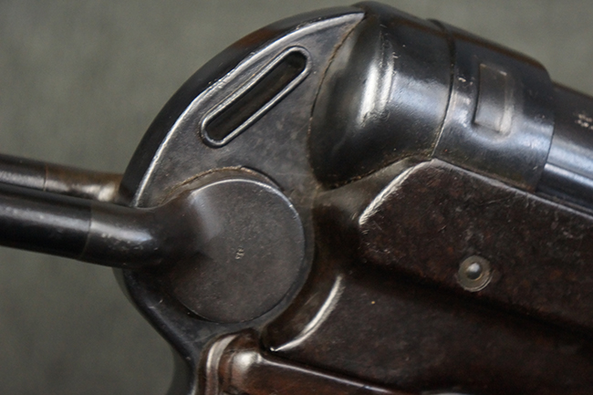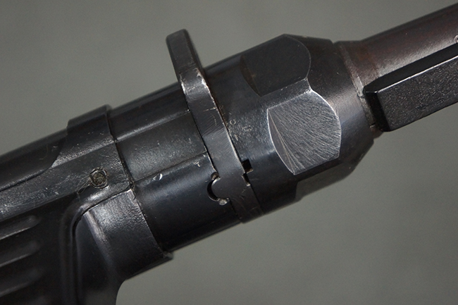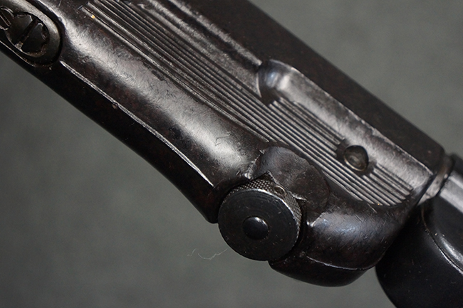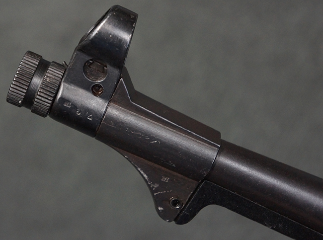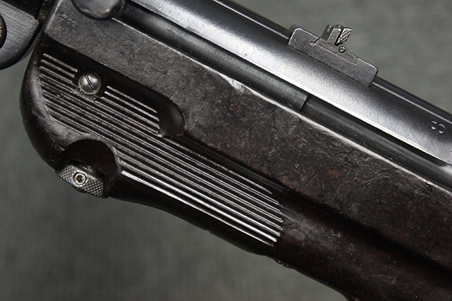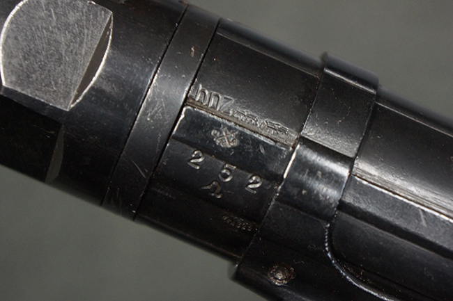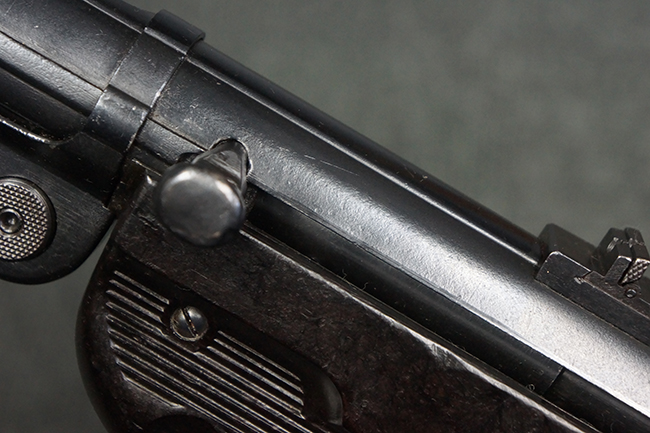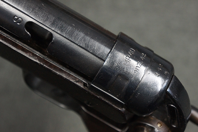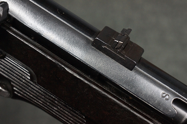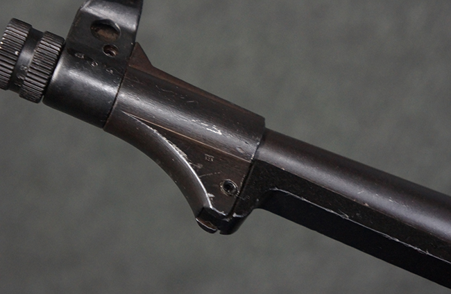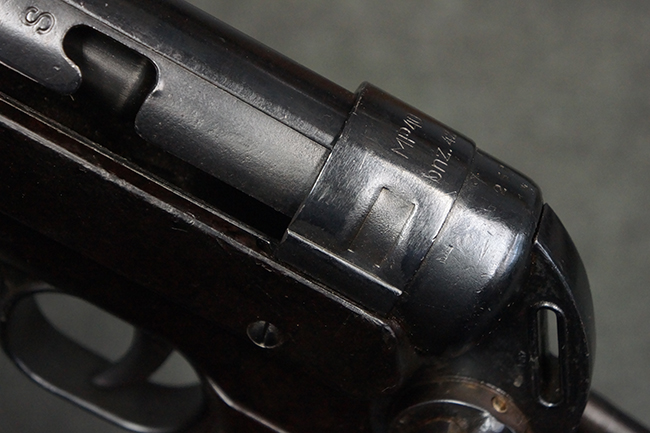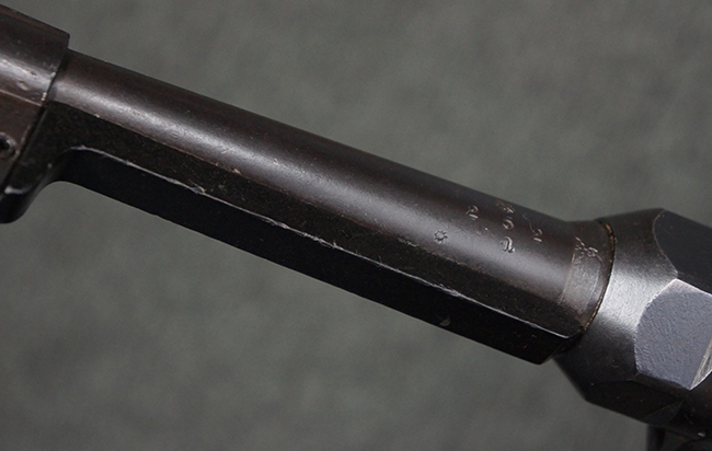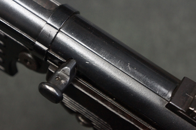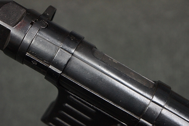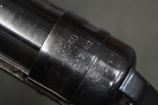 本品のレシーバー・エンド・キャップ上面には「MP40」のモデル名及び1942年ステアー社製を示す「bnz. 42」の刻印が入っています。 マガジン・ハウジングは両面に5本の強化リブが追加されたタイプとなっています。 シリアルNo.はアッパー・レシーバー、銃身、リア・サイト、ロア・レシーバー、グリップ・フレーム、折り畳みストックが252でマッチしており、フロント・サイト・ガードが54、リコイル・スプリング・チューブが942となっています。 グリップ・フレームは下部の溶接がない一体成形でトリガー・ガードは従来と同様のタイプ、マズル・リングは後期型の中央に溝のあるH型、バレル・ナットは六角型のタイプ、バレル・レストは樹脂製となっており、コッキング・ハンドルは1942年半ば以降に本格的に導入されたボルト・セーフティ機能を備えた2ピース・タイプが装備されています。