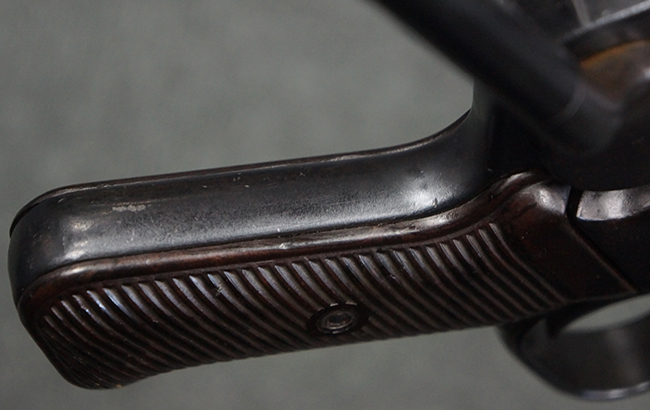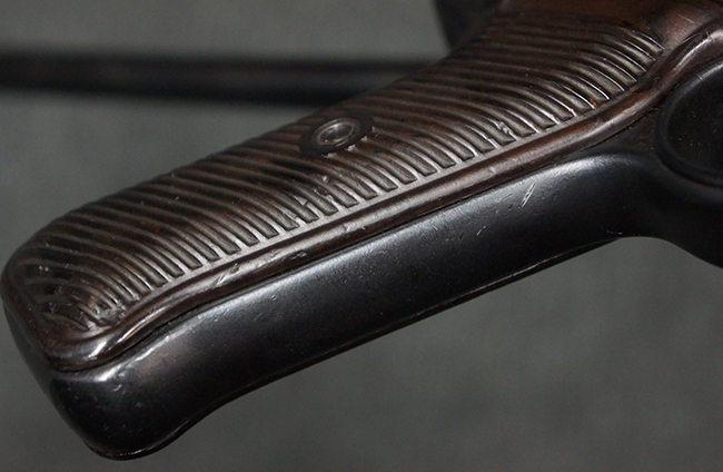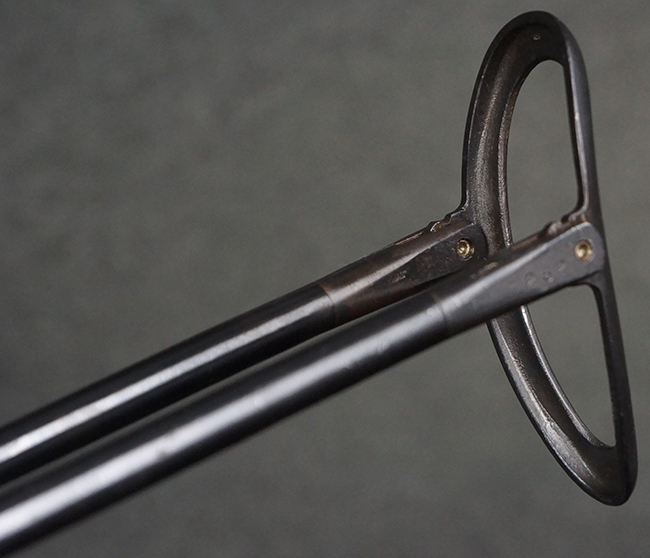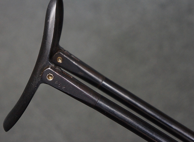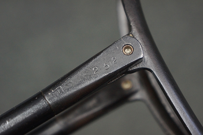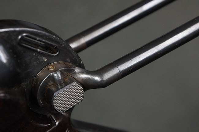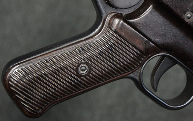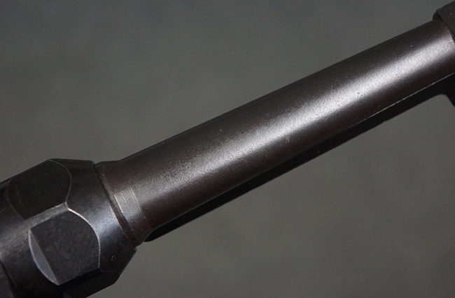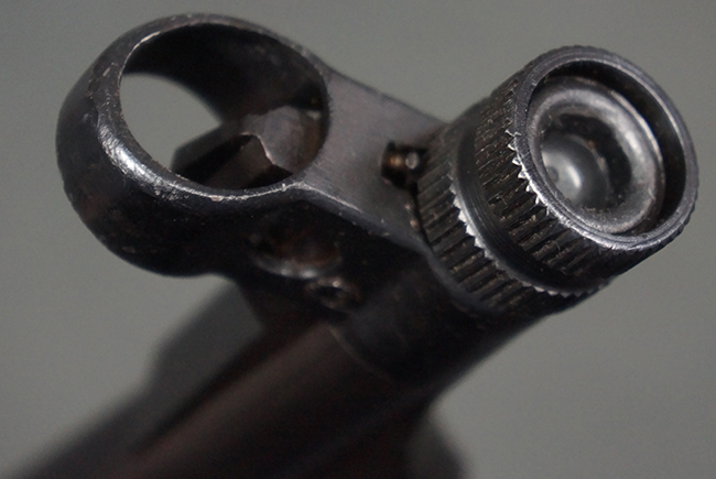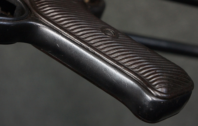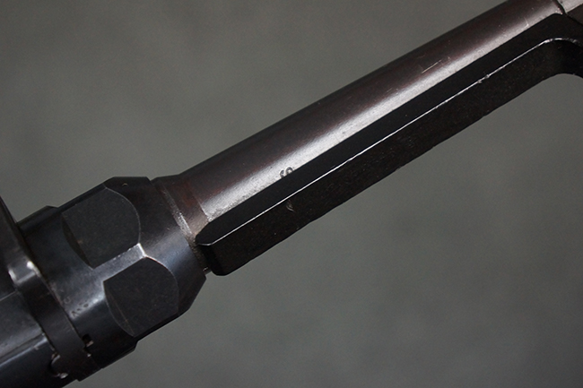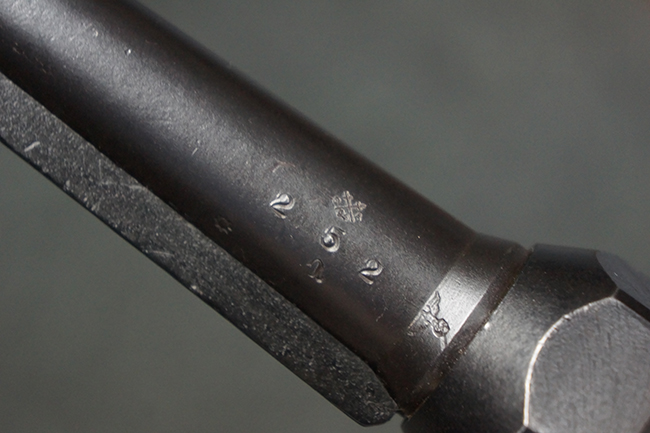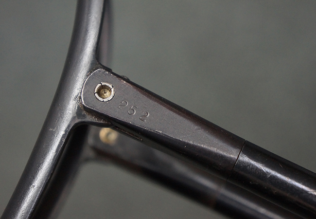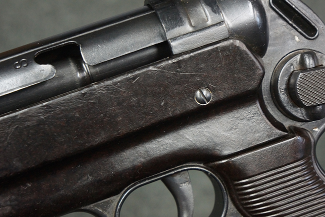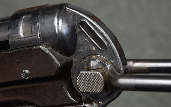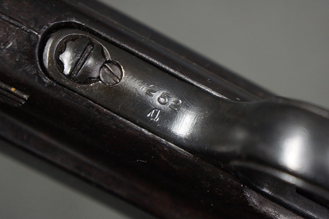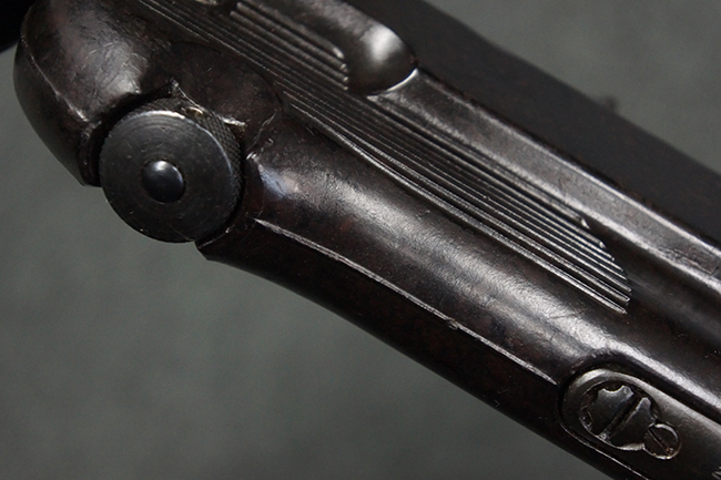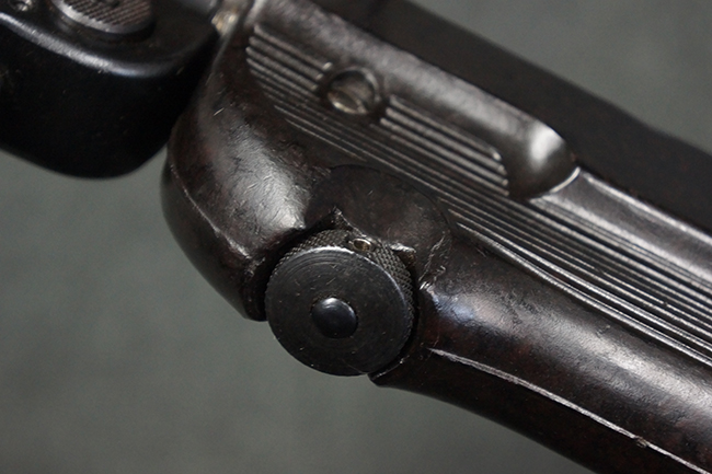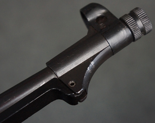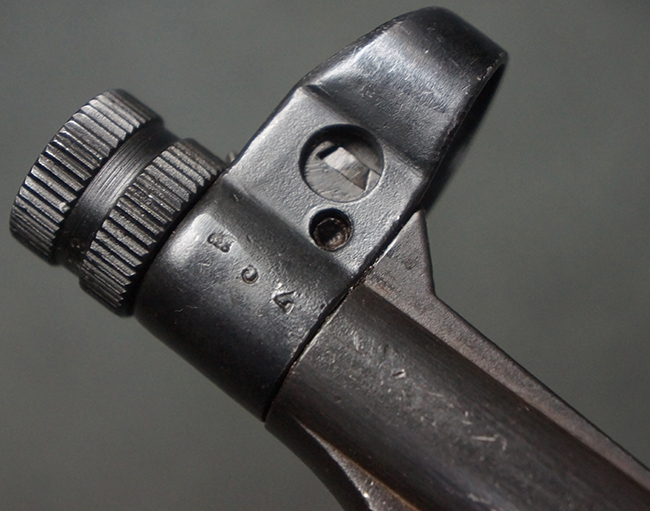 本品のレシーバー・エンド・キャップ上面には「MP40」のモデル名及び1942年ステアー社製を示す「bnz. 42」の刻印が入っています。 マガジン・ハウジングは両面に5本の強化リブが追加されたタイプとなっています。 シリアルNo.はアッパー・レシーバー、銃身、リア・サイト、ロア・レシーバー、グリップ・フレーム、折り畳みストックが252でマッチしており、フロント・サイト・ガードが54、リコイル・スプリング・チューブが942となっています。 グリップ・フレームは下部の溶接がない一体成形でトリガー・ガードは従来と同様のタイプ、マズル・リングは後期型の中央に溝のあるH型、バレル・ナットは六角型のタイプ、バレル・レストは樹脂製となっており、コッキング・ハンドルは1942年半ば以降に本格的に導入されたボルト・セーフティ機能を備えた2ピース・タイプが装備されています。