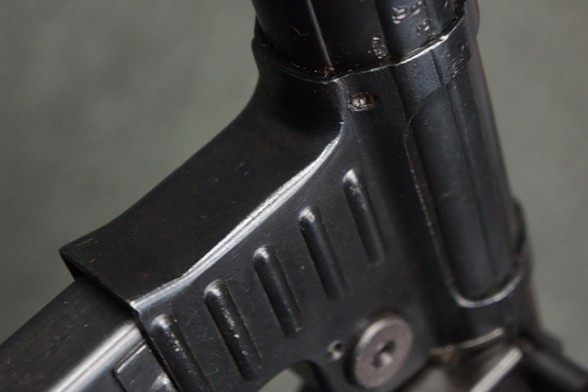 1943~1944年頃にステアー社で製造されたMP40短機関銃の最終型では、レシーバー・エンド・キャップとロア・レシーバーをプレスにより一体成型しているのが特徴です。 このタイプでは、プレスにより鋼板を折り込む方法でロア・レシーバー全体を成形しており、エンド・キャップ上面からロア・レシーバーの外縁部にかけて補強板のように見える板状の継ぎ目が見られます。 バレル・レストは1943年にエルマ社で製造されたタイプと同様にプレス製となっています。