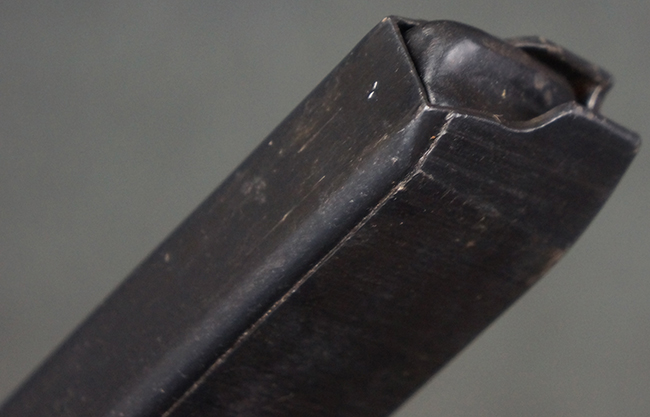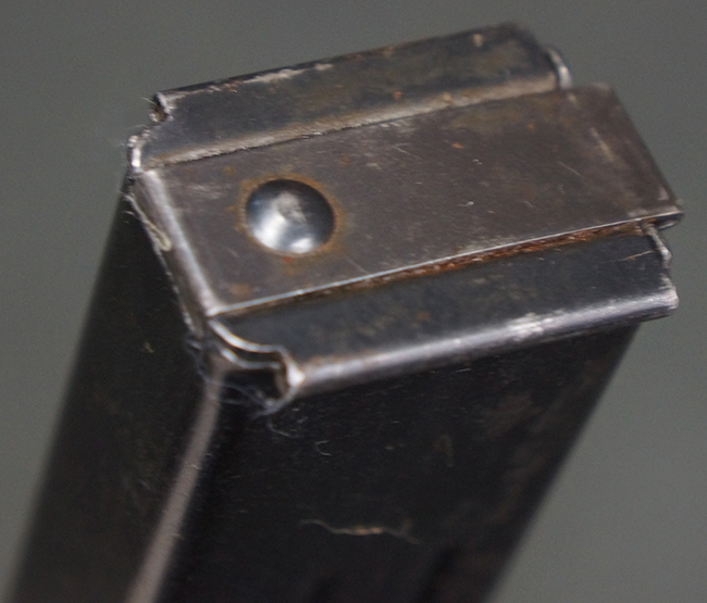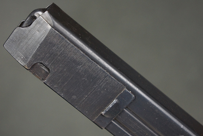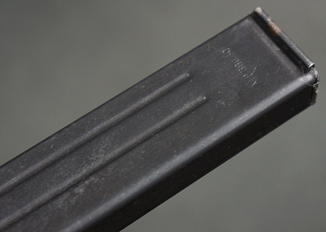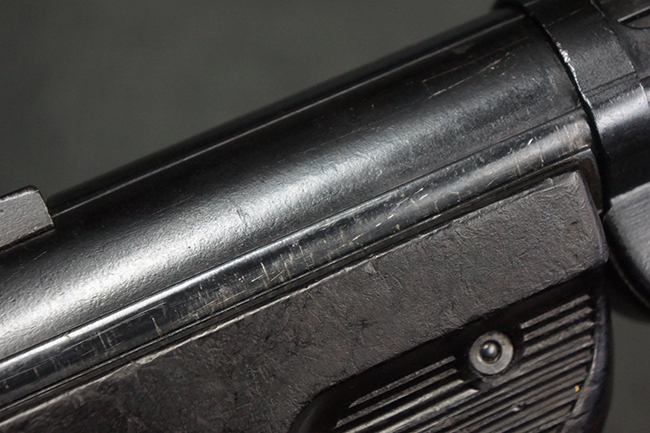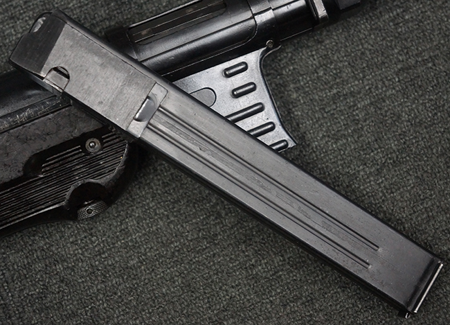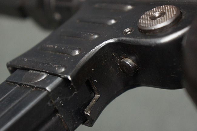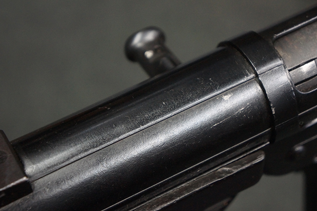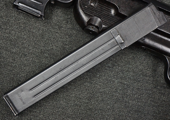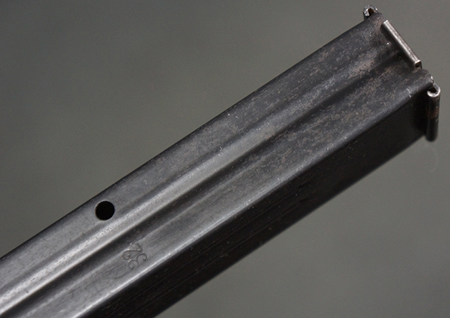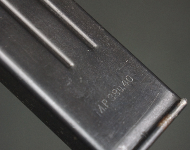 本品の機関部や銃身といった金属部は若干の打ち傷や擦れの他、一部に表面錆痕が見られるものの、現状目立った欠損等は見受けられず、オリジナルのブルー仕上げも比較的残っています。 樹脂製のハンドガードやグリップ・パネル、バレル・レストについても、やや打ち傷や線傷は見られるものの、大きな破損等は見られず、比較的良好な状態が保たれています。 アッパー・レシーバーとロア・レシーバーの取り付けについては目立ったがたつきなどは見られません。 マガジンの着脱やリア・サイトの切り替え、ストックの展開・折り畳み操作については問題なく行う事が可能です。 マガジンは取り付け時に前後に若干の遊びが見られますが、固定自体はしっかりとしています。 ストックは展開時及び折り畳み時にやや遊びが見られますが、MP40としては平均的なレベルです。 付属のマガジンには「M.P.38 u 40」及びステアー社で1942年に製造された事を示す「kur 42」の刻印が入っており、やや小傷や擦れ、若干の表面錆痕が見られるものの、大きな凹みや変形は見られず、概ねしっかりとした状態が保たれています。 尚、マガジン・スプリングは入っています。
