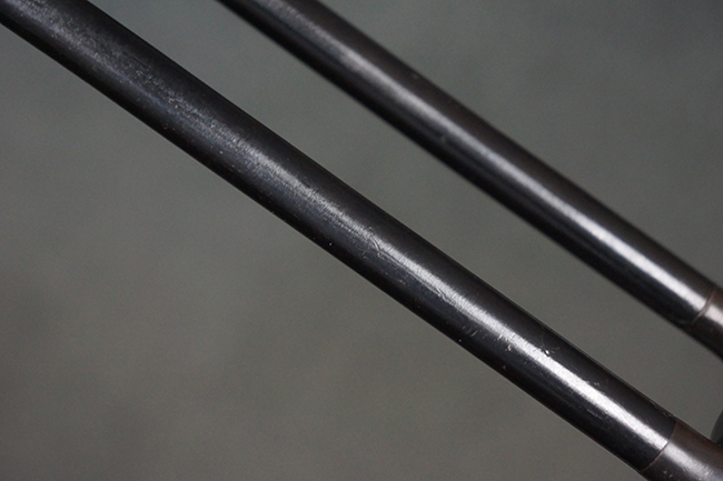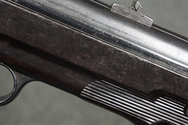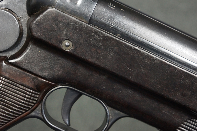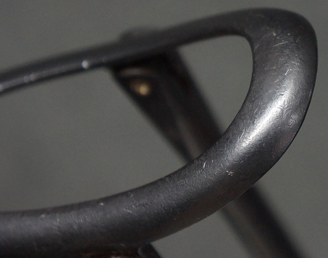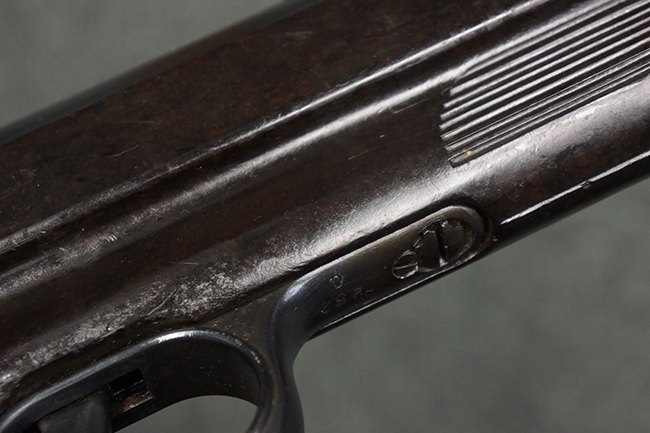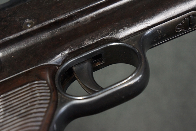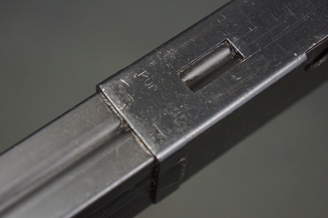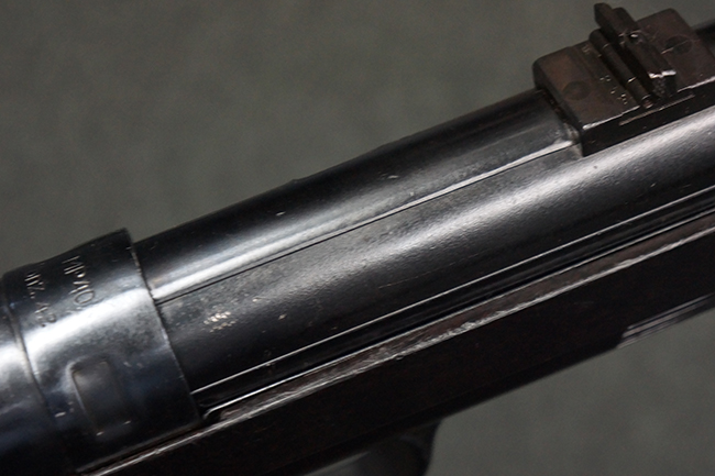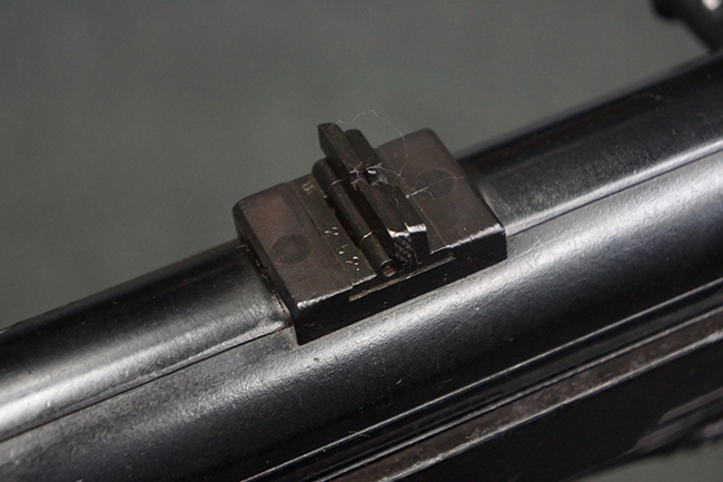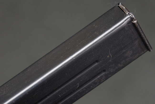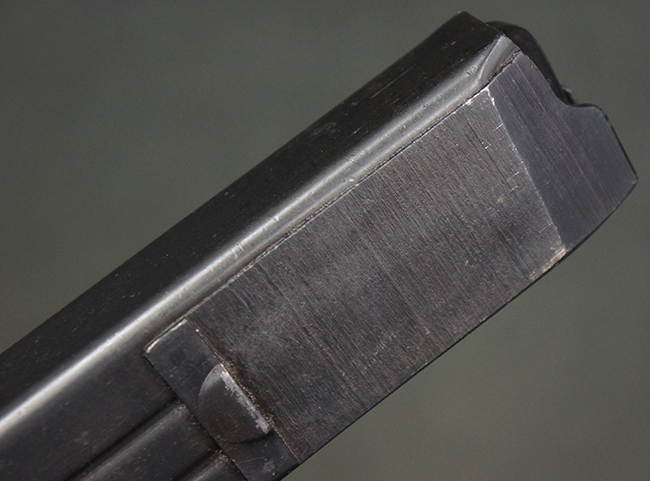 本品の機関部や銃身といった金属部は若干の打ち傷や擦れの他、一部に表面錆痕が見られるものの、現状目立った欠損等は見受けられず、オリジナルのブルー仕上げも比較的残っています。 樹脂製のハンドガードやグリップ・パネル、バレル・レストについても、やや打ち傷や線傷は見られるものの、大きな破損等は見られず、比較的良好な状態が保たれています。 アッパー・レシーバーとロア・レシーバーの取り付けについては目立ったがたつきなどは見られません。 マガジンの着脱やリア・サイトの切り替え、ストックの展開・折り畳み操作については問題なく行う事が可能です。 マガジンは取り付け時に前後に若干の遊びが見られますが、固定自体はしっかりとしています。 ストックは展開時及び折り畳み時にやや遊びが見られますが、MP40としては平均的なレベルです。 付属のマガジンには「M.P.38 u 40」及びステアー社で1942年に製造された事を示す「kur 42」の刻印が入っており、やや小傷や擦れ、若干の表面錆痕が見られるものの、大きな凹みや変形は見られず、概ねしっかりとした状態が保たれています。 尚、マガジン・スプリングは入っています。
