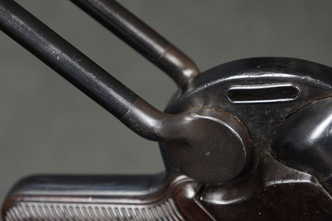 MP38ではレシーバーを無垢の鉄材からの削り出しで製作していた他、グリップ・フレームが鋳造アルミ合金製でしたが、MP40では生産性を向上させるためにレシーバー及びグリップ・フレームに鋼板プレス加工を採用しました。 これにより製造工程が簡略化された他、ドイツ国内で調達が難しかったアルミニウムの節約にも繋がりました。 また、MP38ではマガジンに弾薬を装填した状態で銃を後部から落下させた際に、ボルトが前進位置から跳ね上がって暴発する危険性がありましたが、1940年後半にドイツの銃器設計者ヒューゴ・シュマイザーによってコッキング・ハンドルを内側に押し込む事によりボルトを閉鎖位置で固定するフォワード・ロック・セーフティが開発されました。 このセーフティ機能を備えた新たな2ピース型のコッキング・ハンドルは、1942年半ば以降に製造されたMP40から本格的に装備されるようになりました。