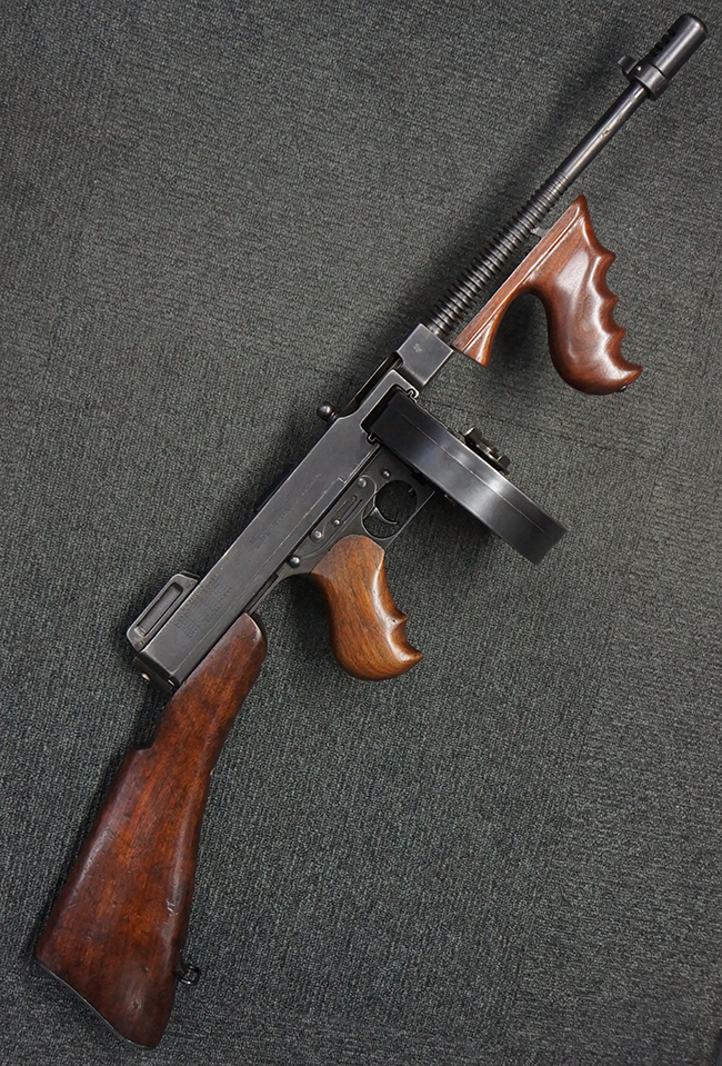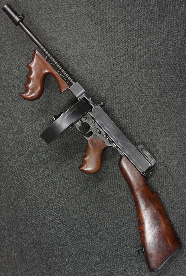 トンプソン短機関銃は元々サブ・マシンガンというジャンルが生まれる前の「個人が携行可能で機関銃のように連射できる武器」というコンセプトから開発が始まりましたが、新たなコンセプトの兵器ゆえ、当初の軍などの評価は決して芳しいものではありませんでした。 そんなトンプソンの最初の有効性を証明したのは軍ではなく、禁酒法時代の景気の良いギャングたちでした。 (この時はM1921とM1927モデルが主であったようです)。 このためオート・オードナンス社とトンプソン短機関銃は一時社会的イメージを落とし、この時期にオート・オードナンス社は経営の最大の危機を迎えたほどです。 ところが皮肉にもギャングたちの使用によりトンプソンの有効性は証明され、連邦捜査局 (FBI) や各地方の治安当局でも、こうした犯罪者に対抗するべくトンプソンM1928短機関銃が採用されました。 それと同じモデルがイギリスでは「トミーガン」の名称でコマンドの象徴と言われました。その後米軍でもニカラグアでの使用で実戦での実績も作り、ついに第二次世界大戦の幕開けと共にトンプソン短機関銃は本格的に各国軍に採用されるようになります。