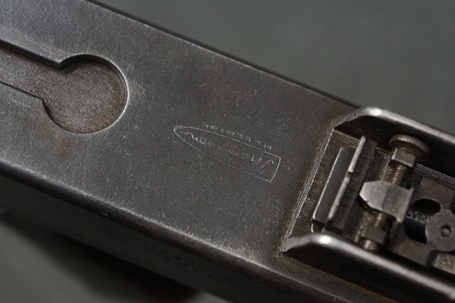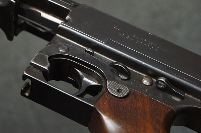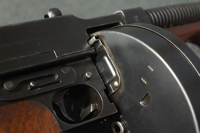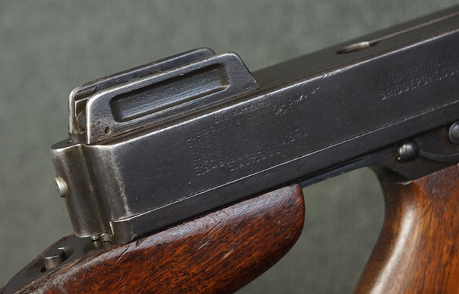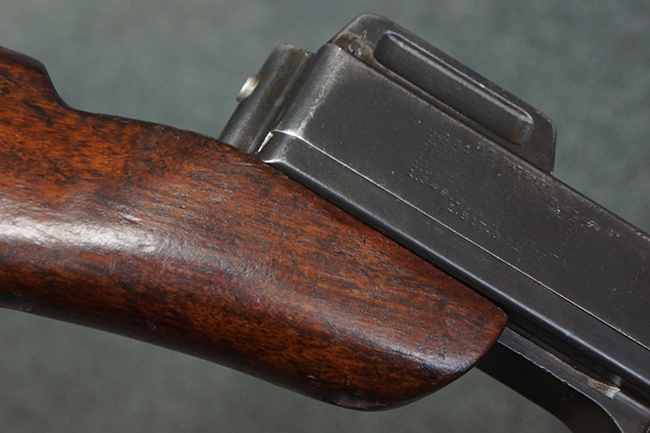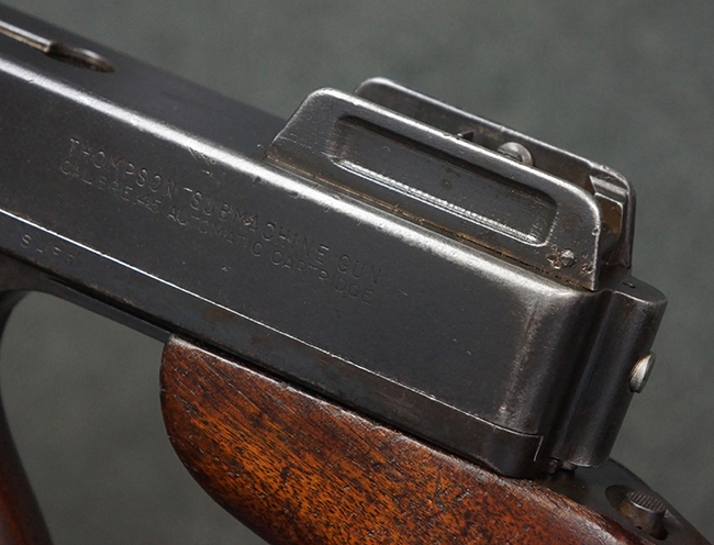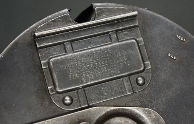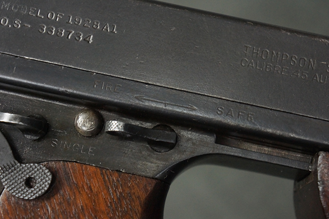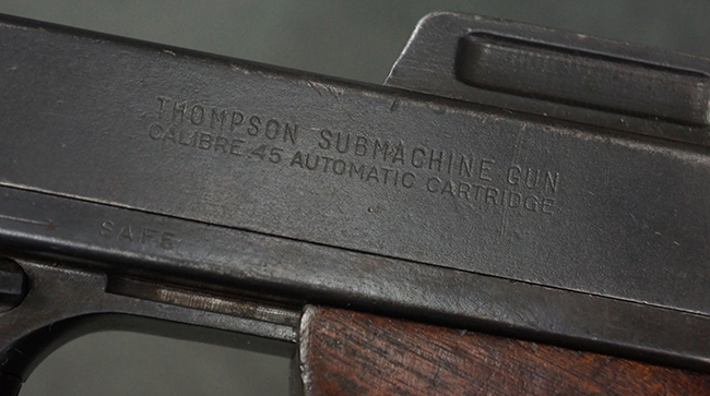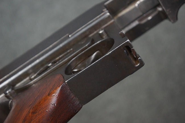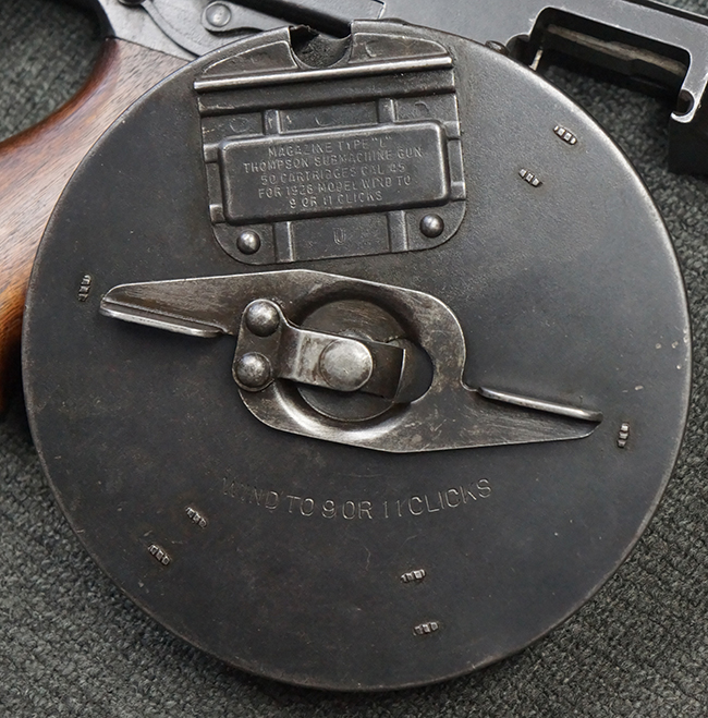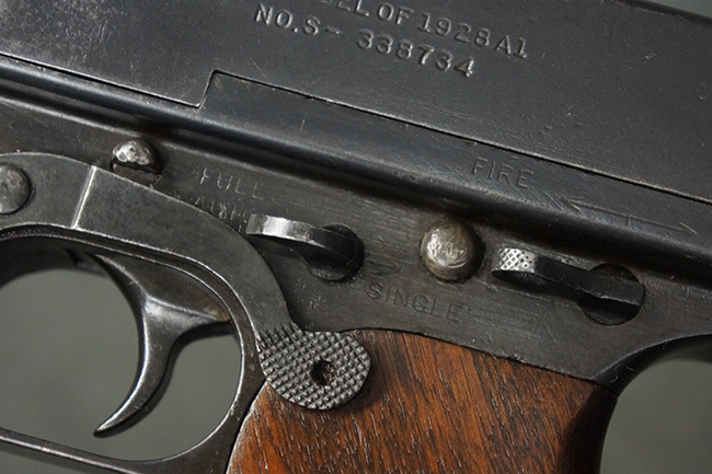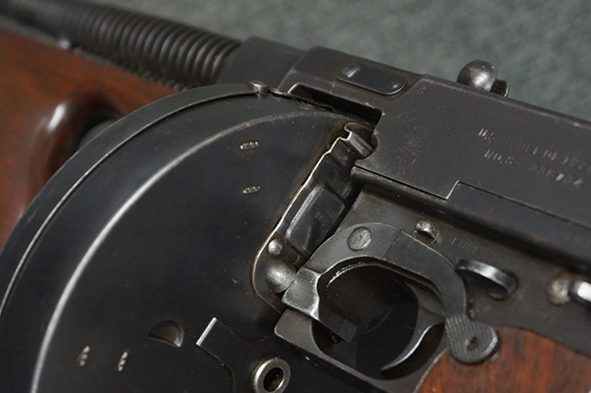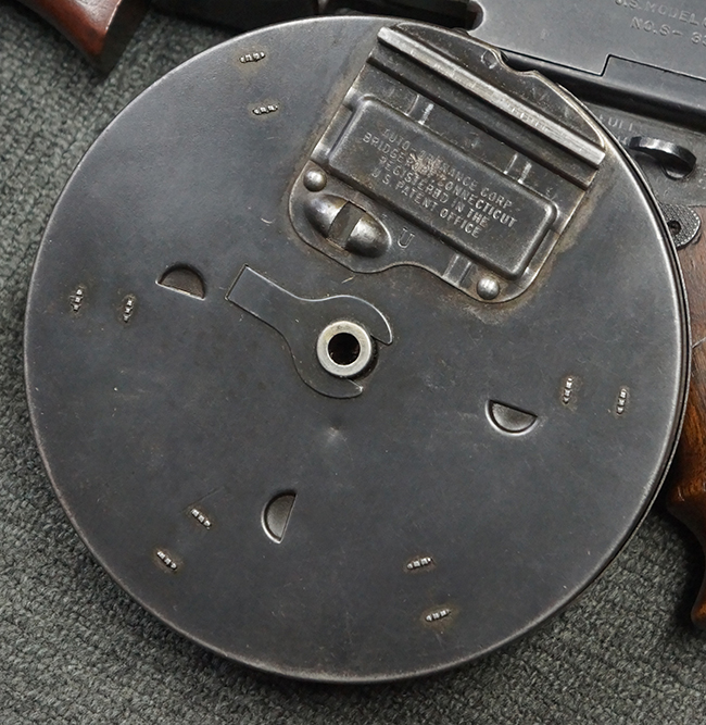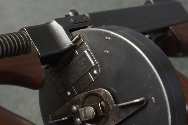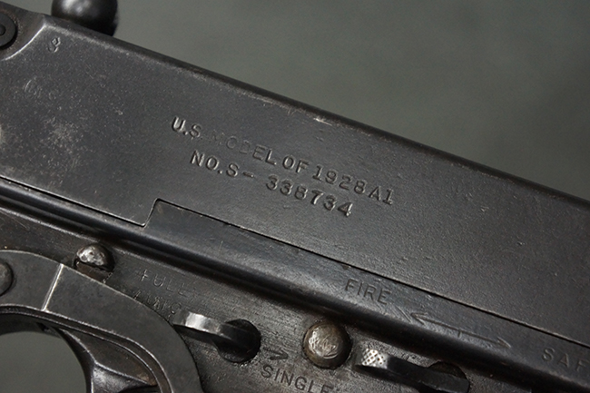 本品のレシーバー左側面にはシリアルNo.の他、「U.S. MODEL 1928 A1」及び「THOMPSON SUBMACHINE GUN CALIBRE .45 AUTOMATIC CARTRIDGE」の刻印が入っています。 また、レシーバー右側面には一部薄くなっていますが、米国のパテント刻印の他、「AUTO-ORDNANCE CORPORATION BRIDGEPORT, CONNECTICUT,U.S.A」の刻印が入っています。 尚、レシーバー上面にはやや薄くなっていますが、トンプソンのロゴが入っています。 ロア・レシーバーのシリアルNo.はアッパー・レシーバーのシリアルNo.とマッチしています。 本品はシリアルがSで始まる事からサベージ社製であることがわかります。 バレル・フィンがあり、Lyman (ライマン) 社製のラダー・サイトが付いた仕様です。 カッツ・コンペンセーター表面の刻印についてもやや薄くなっていますが、確認は可能です。 尚、セレクター及びセーフティはいずれも削り出しタイプの物が取り付けられています。 本品には復刻品のバーティカル・フォア・グリップ及びオリジナルの50連ドラム・マガジンが付属いたします。 尚、ストレート・タイプのハンドガード及び箱型マガジンは付属いたしません。