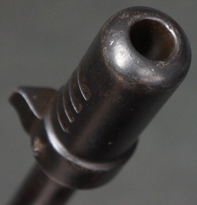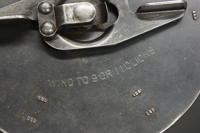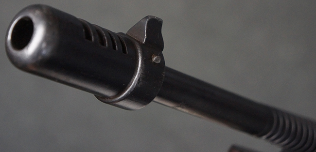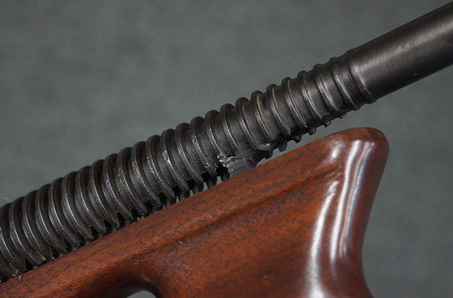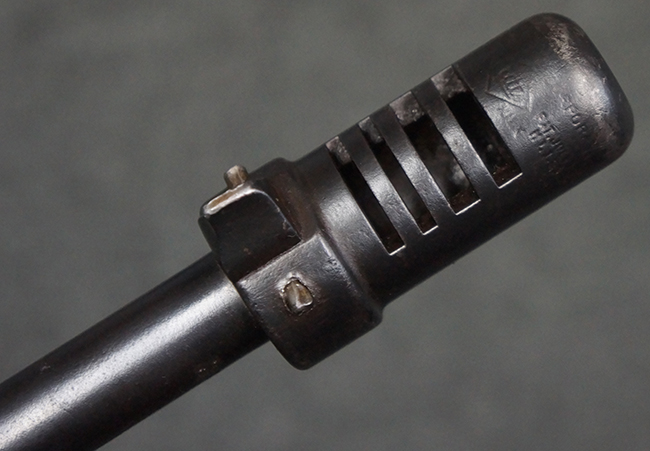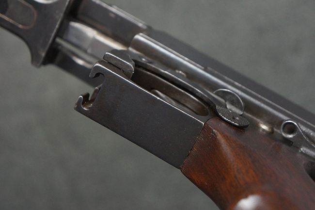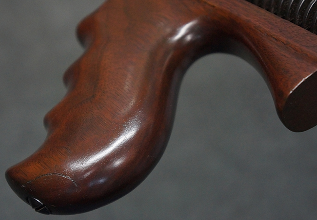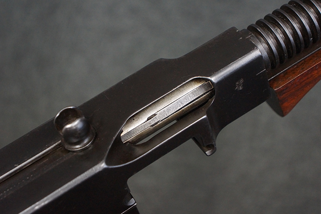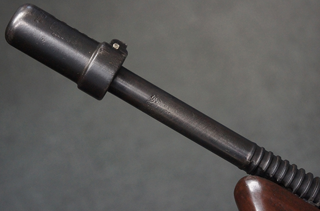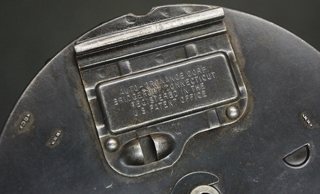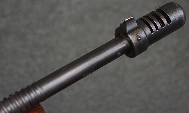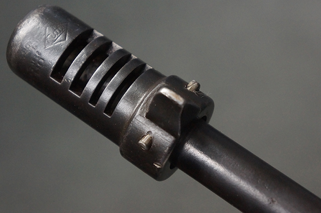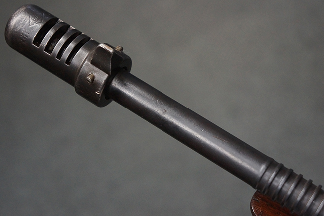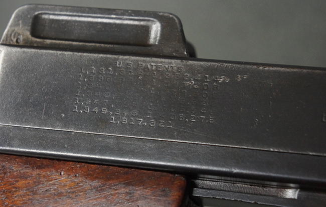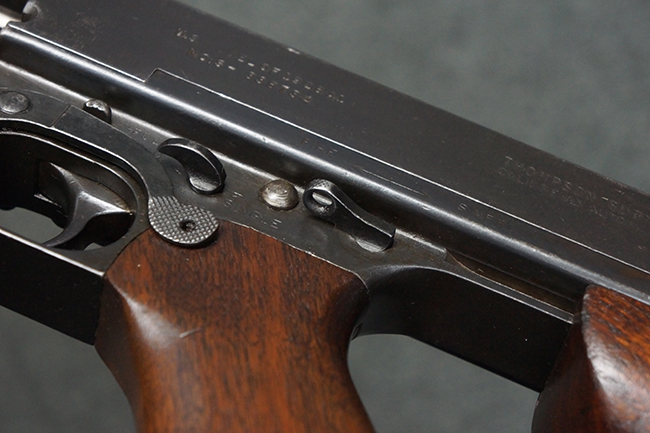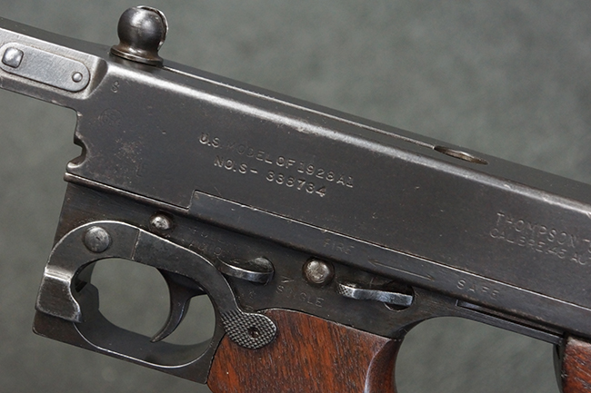 本品のレシーバー左側面にはシリアルNo.の他、「U.S. MODEL 1928 A1」及び「THOMPSON SUBMACHINE GUN CALIBRE .45 AUTOMATIC CARTRIDGE」の刻印が入っています。 また、レシーバー右側面には一部薄くなっていますが、米国のパテント刻印の他、「AUTO-ORDNANCE CORPORATION BRIDGEPORT, CONNECTICUT,U.S.A」の刻印が入っています。 尚、レシーバー上面にはやや薄くなっていますが、トンプソンのロゴが入っています。 ロア・レシーバーのシリアルNo.はアッパー・レシーバーのシリアルNo.とマッチしています。 本品はシリアルがSで始まる事からサベージ社製であることがわかります。 バレル・フィンがあり、Lyman (ライマン) 社製のラダー・サイトが付いた仕様です。 カッツ・コンペンセーター表面の刻印についてもやや薄くなっていますが、確認は可能です。 尚、セレクター及びセーフティはいずれも削り出しタイプの物が取り付けられています。 本品には復刻品のバーティカル・フォア・グリップ及びオリジナルの50連ドラム・マガジンが付属いたします。 尚、ストレート・タイプのハンドガード及び箱型マガジンは付属いたしません。