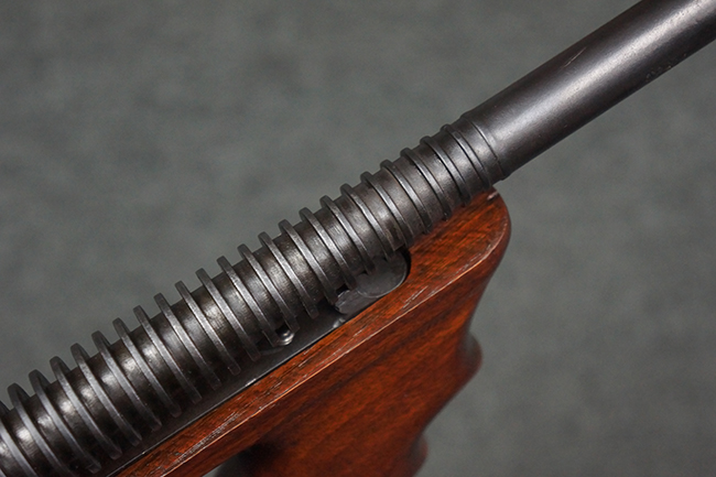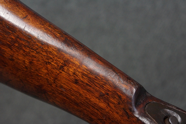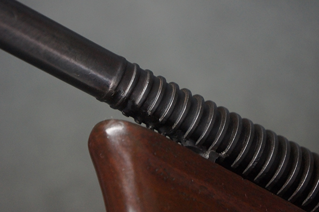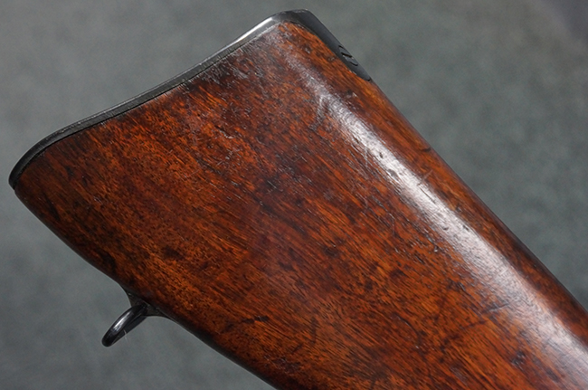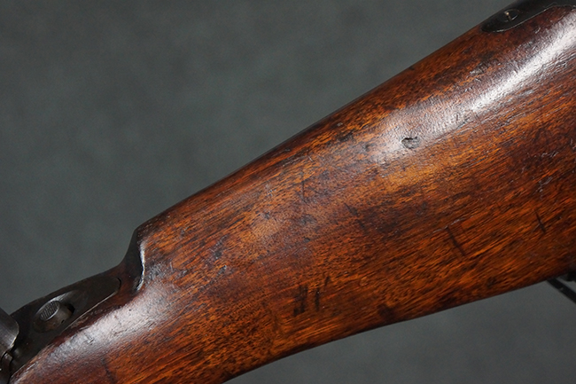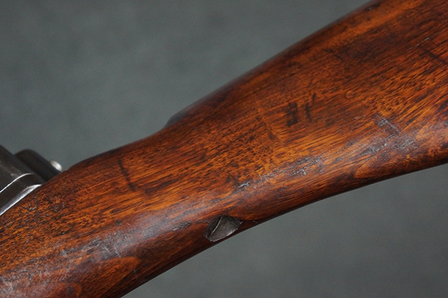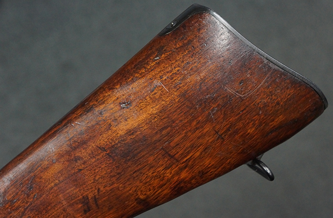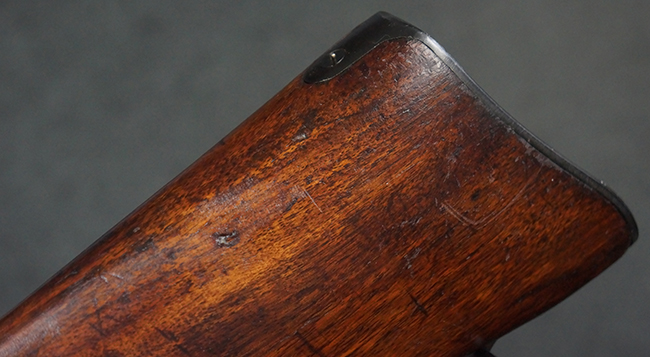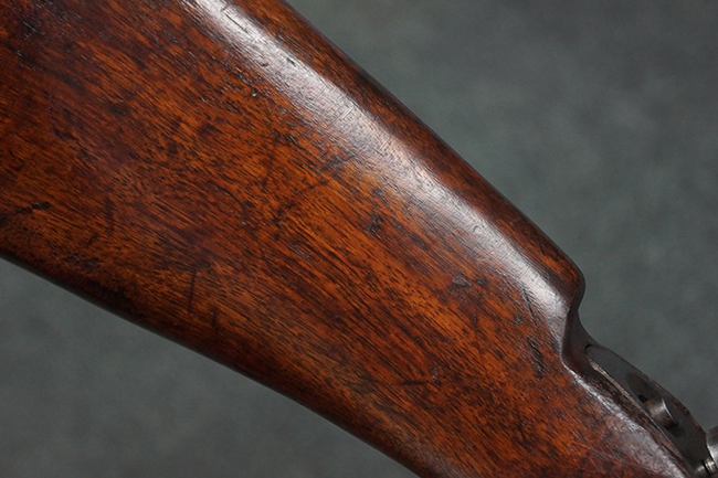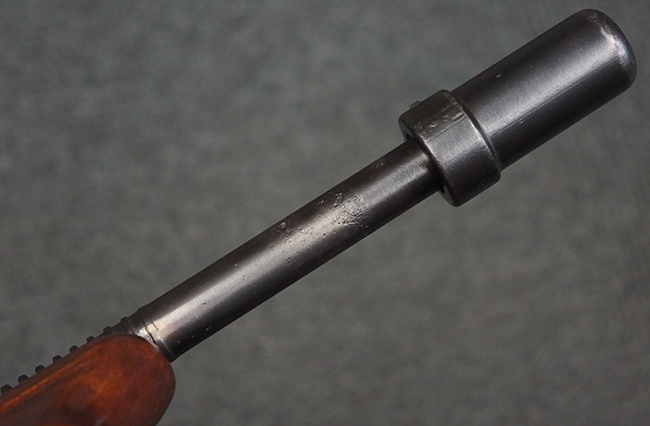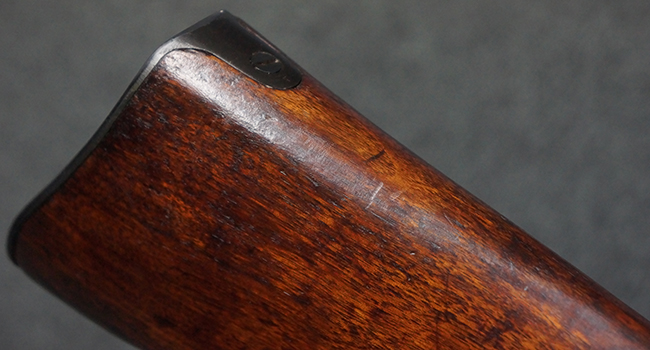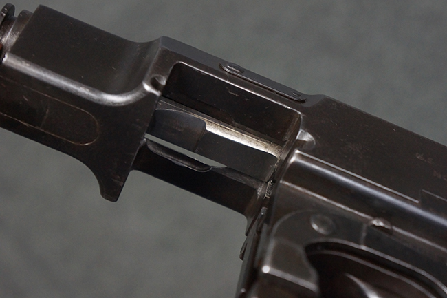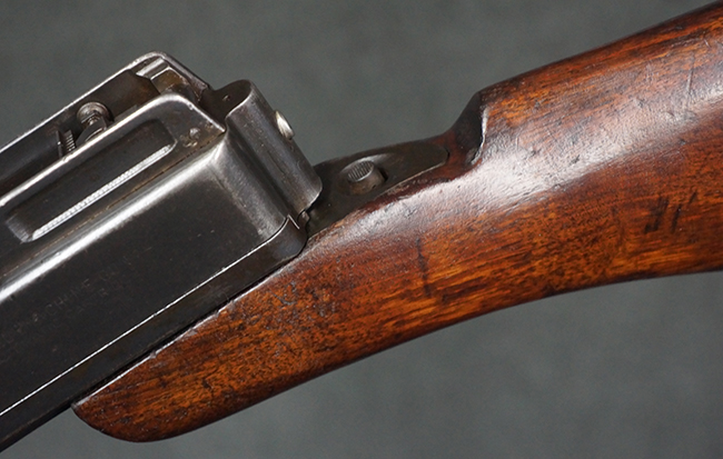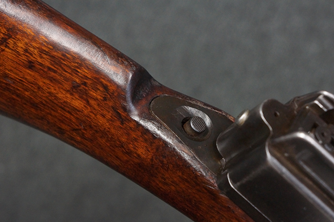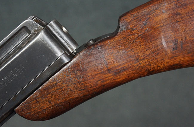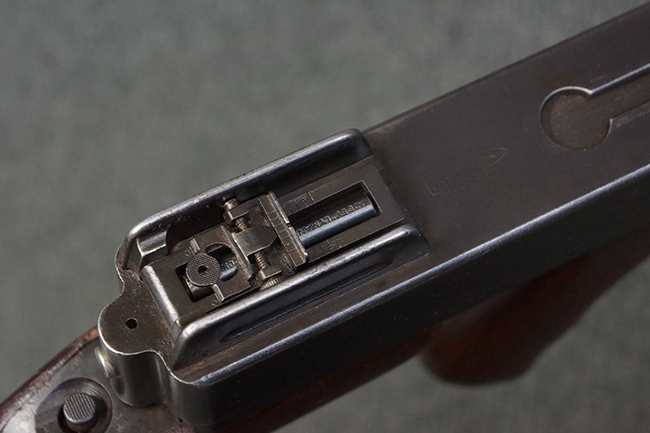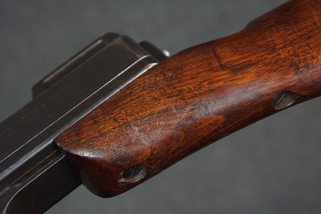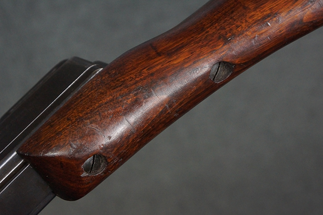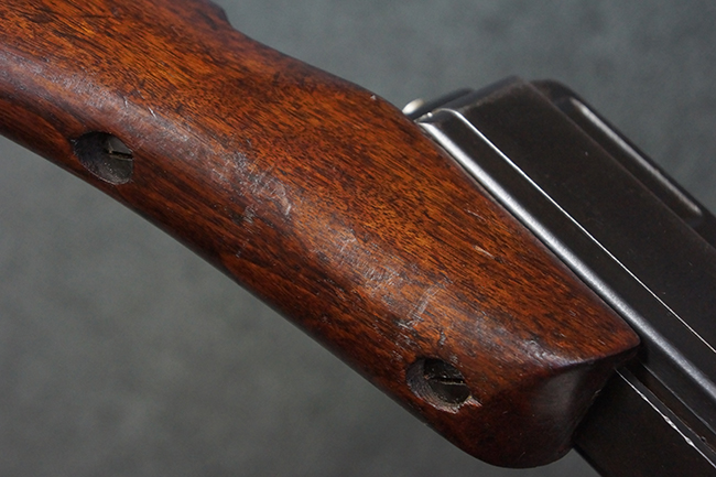 本品は全体にやや使用感が見受けられ、レシーバーや銃身といった金属部については、打ち傷や擦れの他、経年による褪色や表面錆痕が見受けられるものの、全体に目立った欠損等は見られず、概ねしっかりとした状態が保たれています。 木製のグリップやバット・ストックについては、やや打ち傷や線傷が散見されるものの、大きな破損等は見られず、比較的良好な状態が保たれています。 上下レシーバーやバット・ストックの取り付けは、やや遊びが見られますが十分許容レベルで、着脱もスムーズに行う事が可能です。 バット・プレート部は、若干の小傷や擦れ、一部仕上げが落ちて金属の地肌が表れている箇所が見られるものの、目立った変形等は見られず、ストック内コンパートメントの蓋の開閉についても問題なく行う事が可能です。 マガジンの着脱やリア・サイトの起倒・調整についても問題なく行う事が可能です。 トリガーとの連動等は有りませんが、セレクター・レバーの切り替えは可能です。 セーフティ・レバーは加工により固定されています。