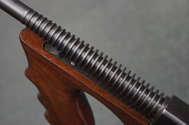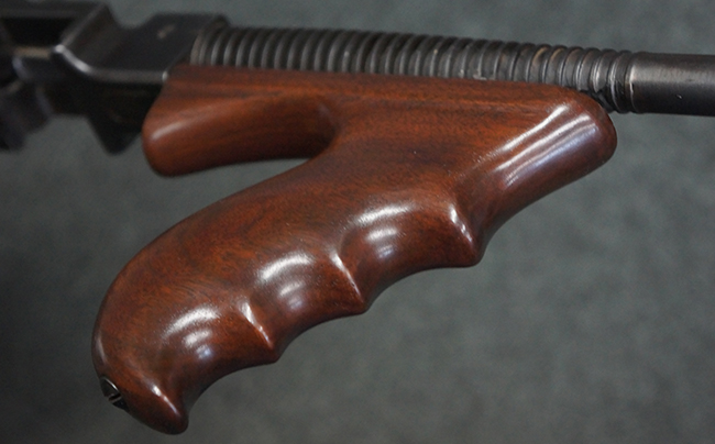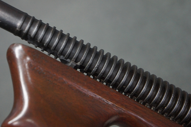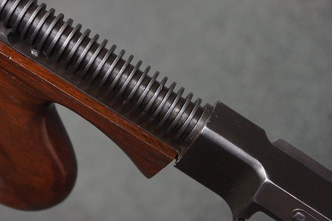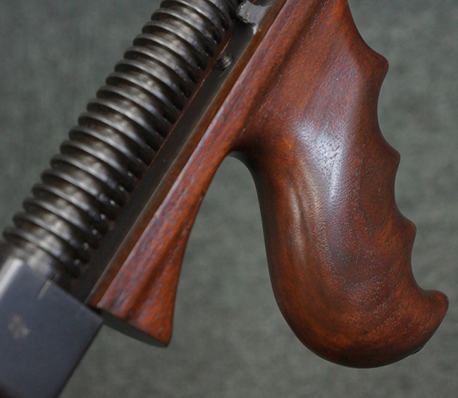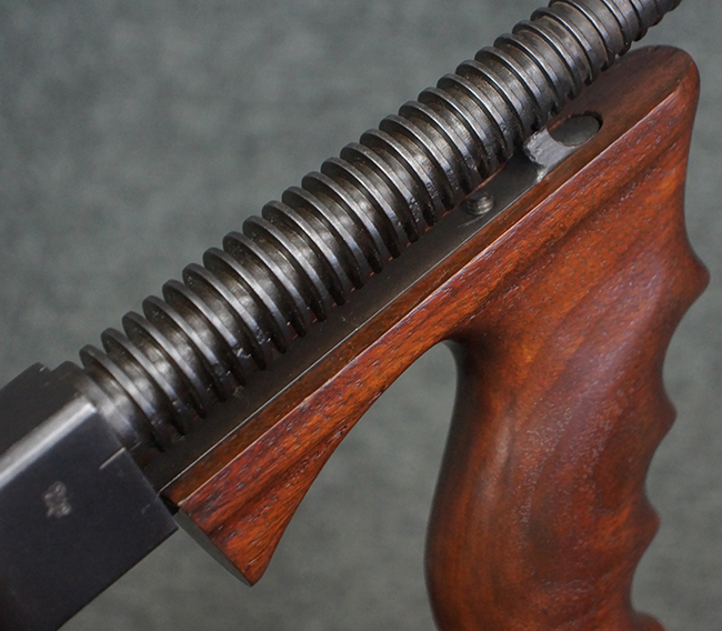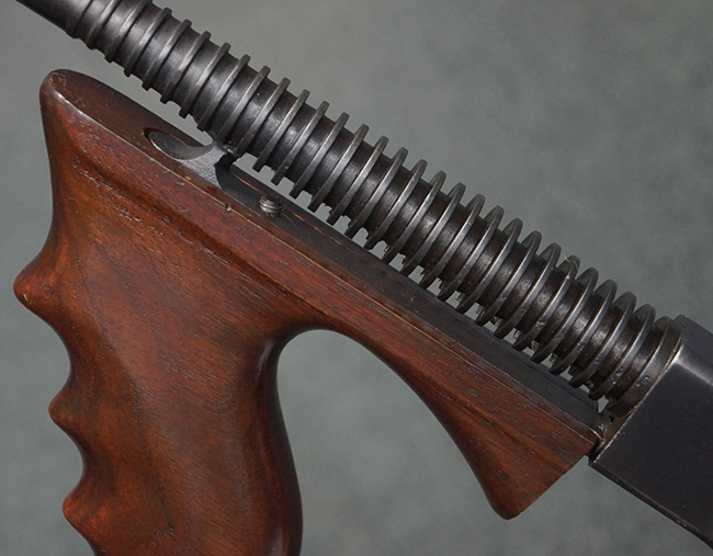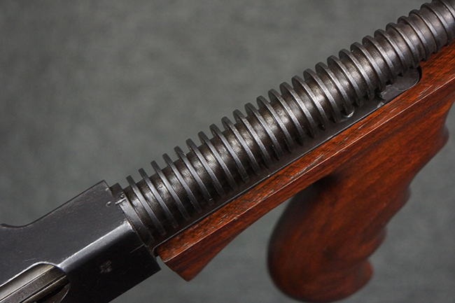 トンプソンM1928A1短機関銃は、米陸軍によってそれまで限定的に調達が行われていたM1928短機関銃を1938年に標準調達品として制式採用したモデルです。 ハンドガードが従来のバーティカル・グリップ付の物からストレート・タイプとなった他、ハンドガード及びストック下部にスリング・スイベルが追加されました。 M1928A1は米国以外にもレンドリース法に基づき各国に供給されました。