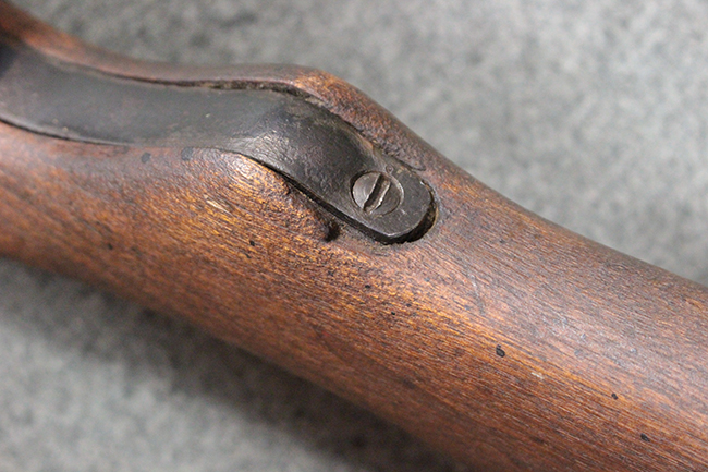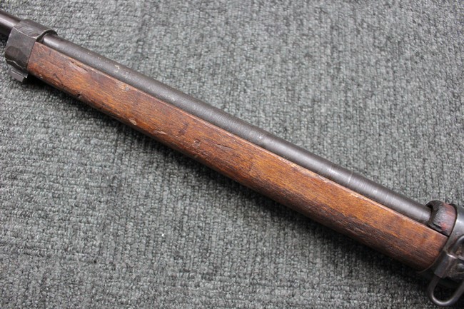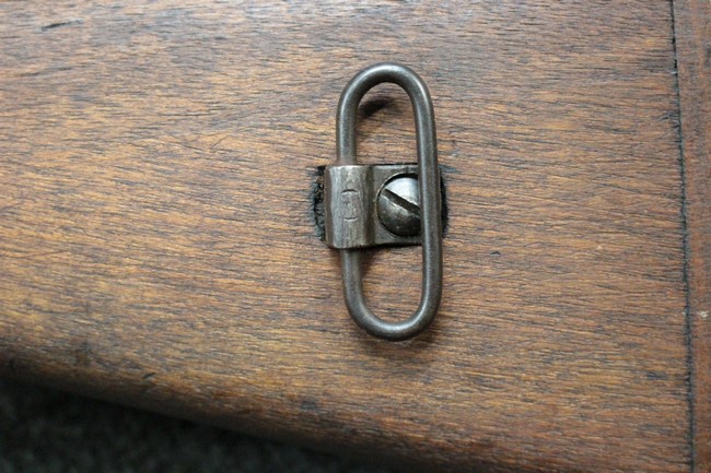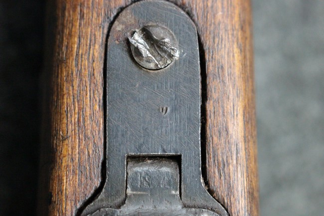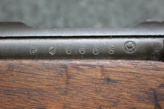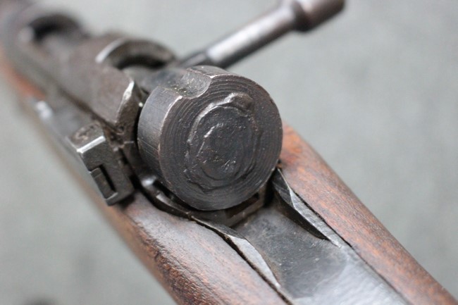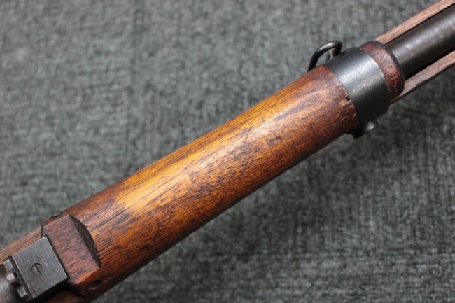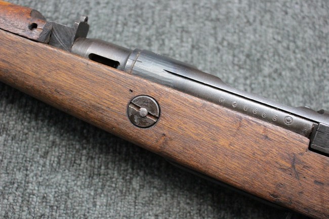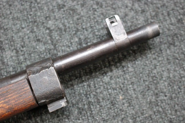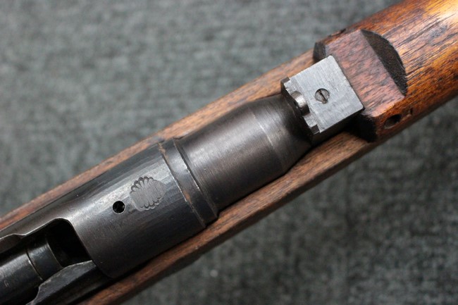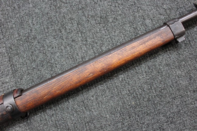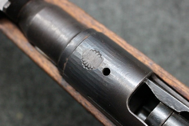 本品は九九式短小銃の末期型 名古屋工廠製です。 名古屋工廠は他の工廠と比べ末期型への移行が早く、12シリーズの生産の内末期型は約4.5シリーズ分あり、照尺などにもバリエーションが有ります。 末期型では基本的に薬室上部の「九九式」の刻印は省略されています。 本品は照尺がピープ・タイプの簡易型となっており、照星のガードが付属しているタイプです。 床尾板については木製となっており、床尾負革止はネジ1本のみで固定されたタイプとなっています。 槓桿 (ボルト・ハンドル) は円筒形のタイプで、安全子は仕上げが簡略化されたタイプとなっています。 本品の機関部左側面にはシリアルNo.の他、名古屋工廠を示す刻印や<チ>のシリーズ名が打刻されています。 <チ>シリーズは1944年 (昭和19年) の6月から9月頃にかけて製造されました。 その他、用心金や照尺基部には「リ」の刻印が小さく入っています。 尚、菊花紋章については輪郭の一部を残して削られています。