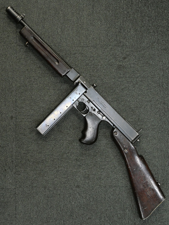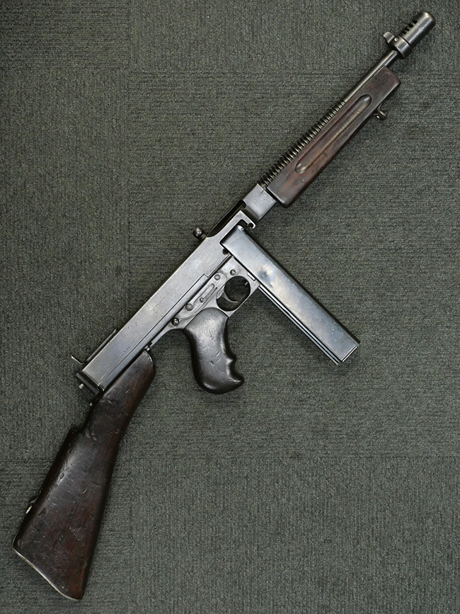 トンプソンM1928A1短機関銃は、米陸軍によってそれまで限定的に調達が行われていたM1928短機関銃を1938年に標準調達品として制式採用したモデルです。 ハンドガードが従来のバーティカル・グリップ付の物からストレート・タイプとなった他、ハンドガード及びストック下部にスリング・スイベルが追加されました。 M1928A1は米国以外にもレンドリース法に基づき各国に供給されました。