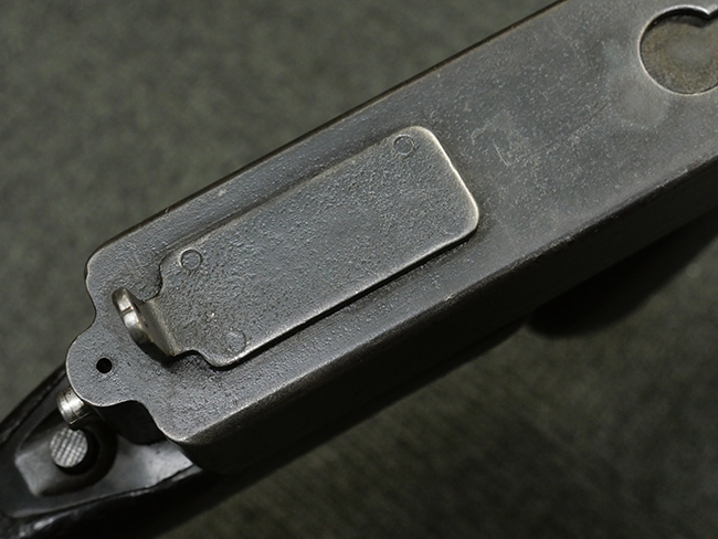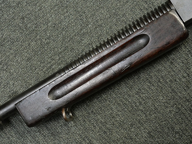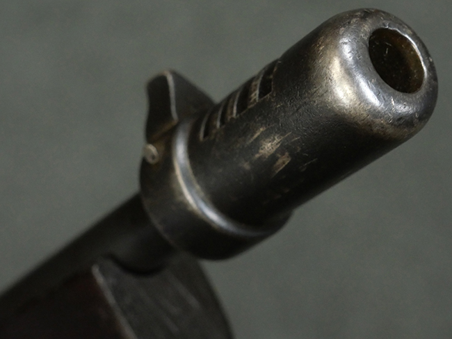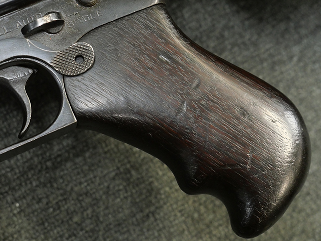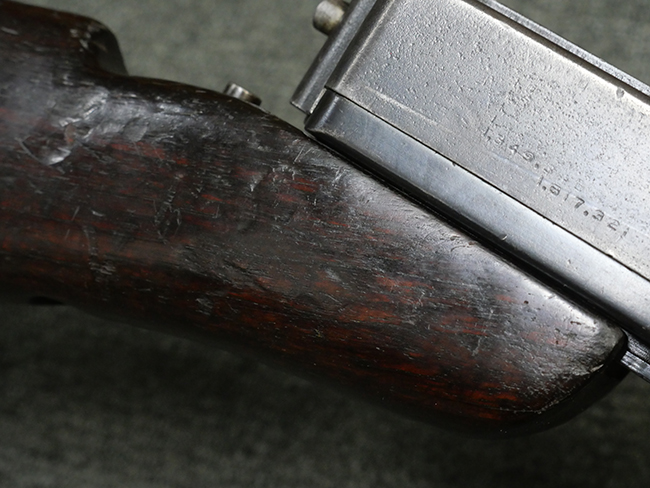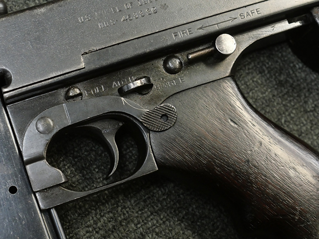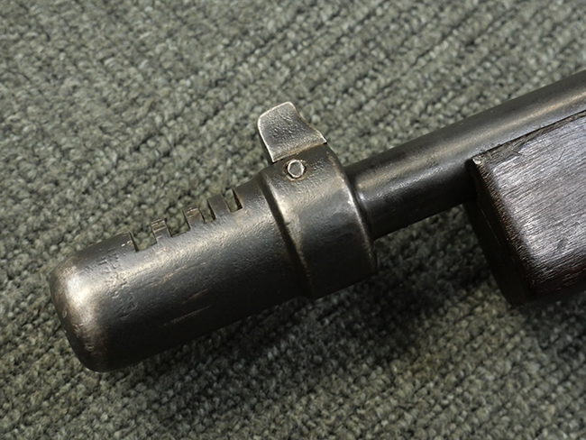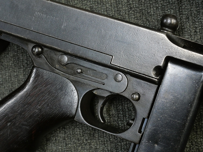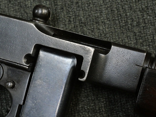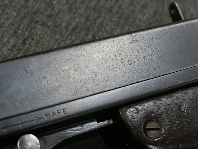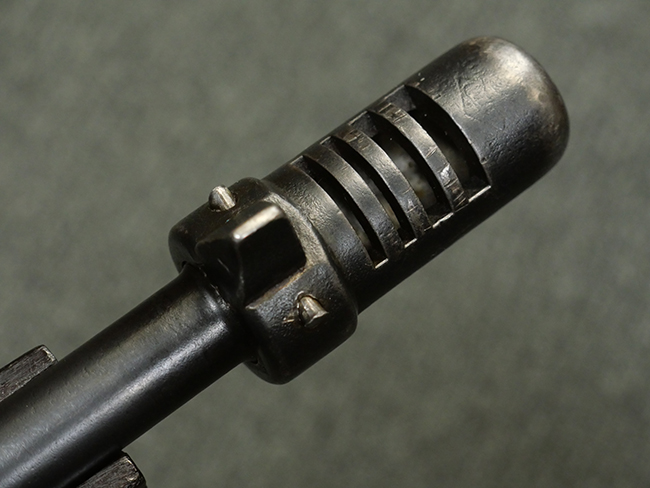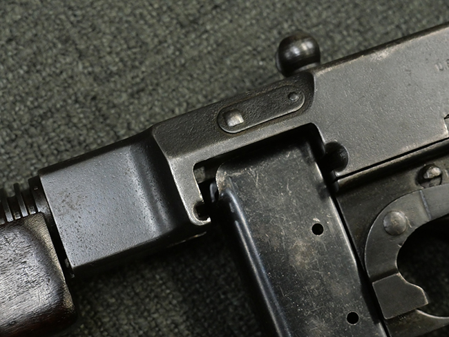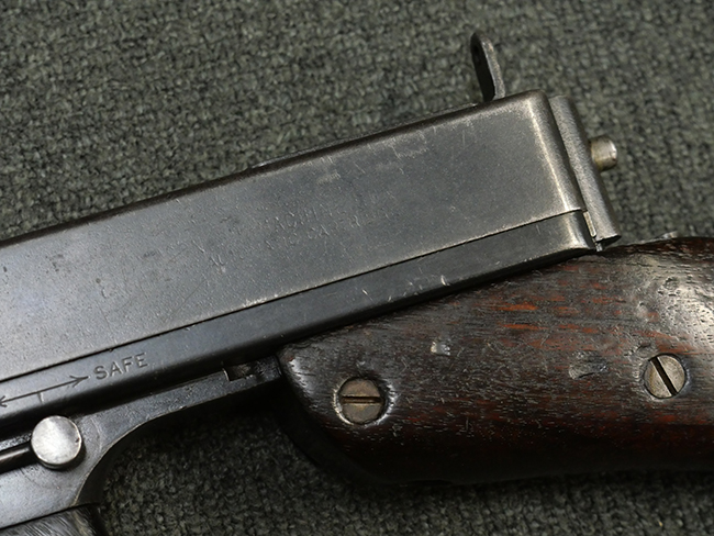 本品はシリアルがSで始まる事から、サベージ社製であることがわかります。 バレル・フィンがあり、プレス製のLyman (ライマン) 社製の固定型簡易サイトが付いた仕様です。 カッツ・コンペンセーター表面の刻印について薄くなっており判読できない状態です。 セレクターは削り出しタイプ、セーフティーはピンタイプが取り付けられています。 尚、ハンドガード後端にはサベージ製を示す「S」の刻印が見られます。 また、ストックのスリング・スイベルはバット・ストック上面に移設されており、元のスイベル取り付け部は木栓で埋められているなど、英軍で使用されたトンプソンに見られる仕様となっています。