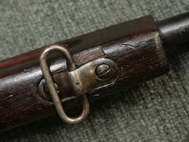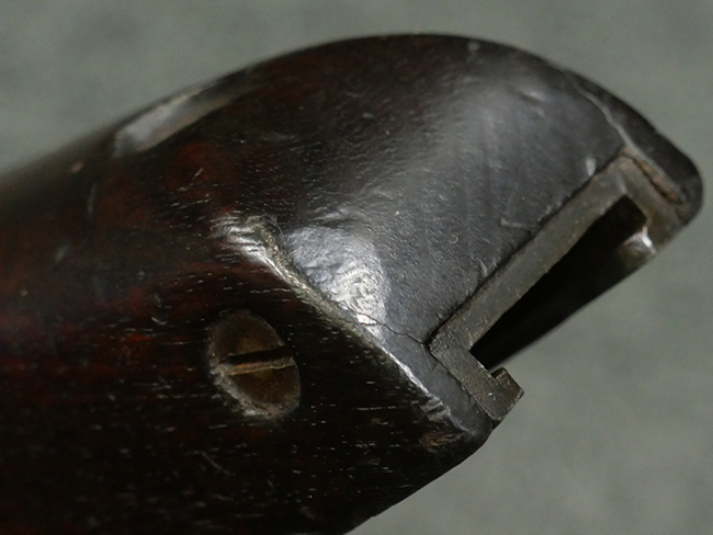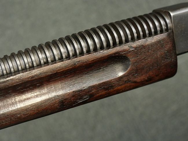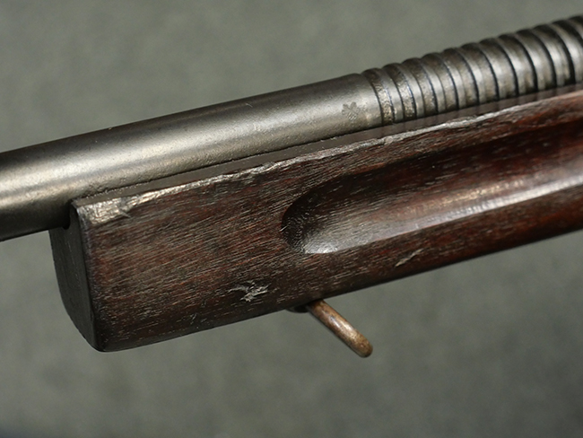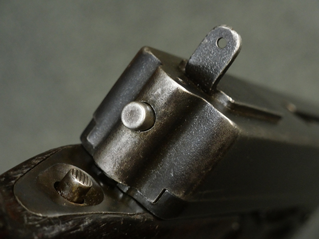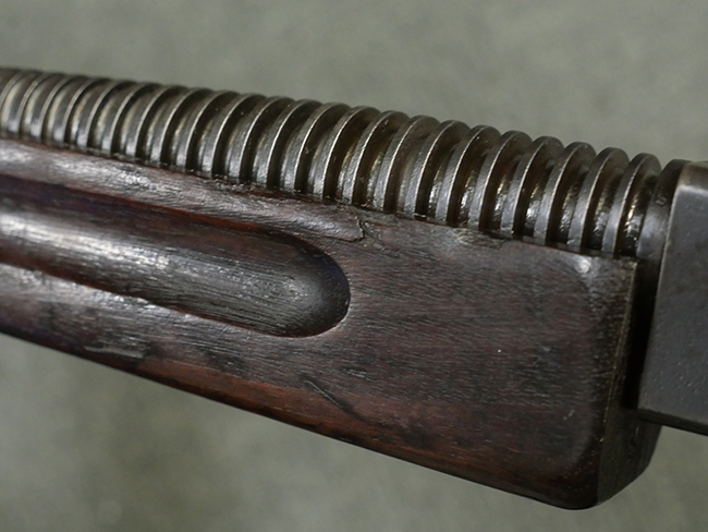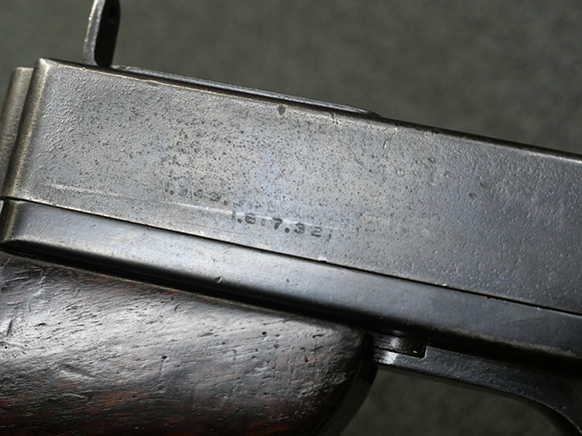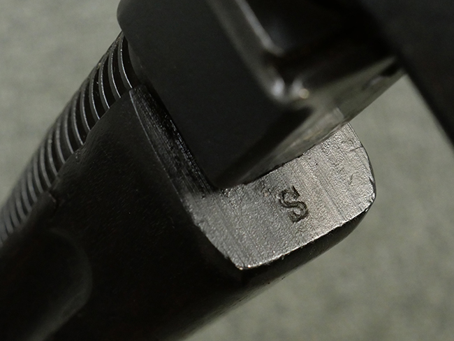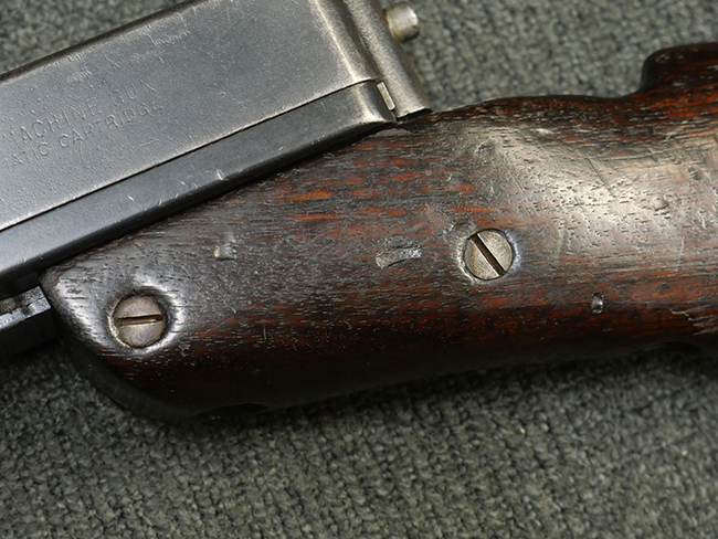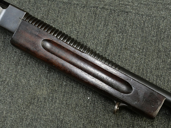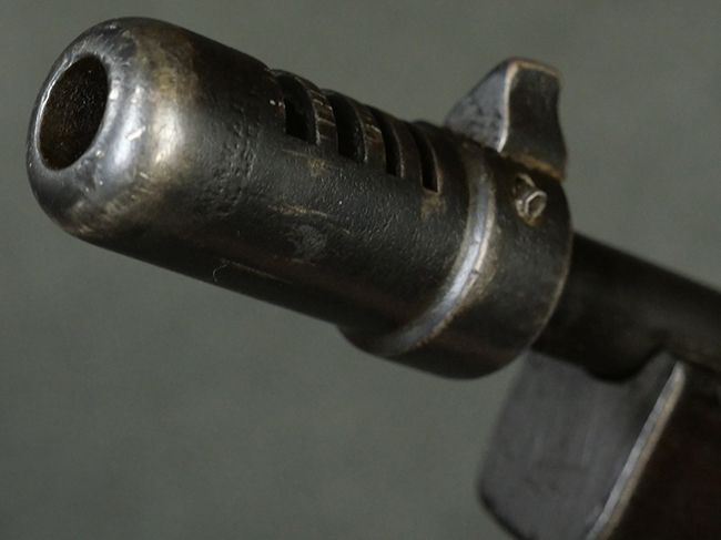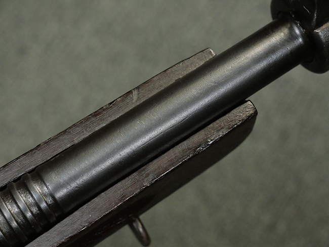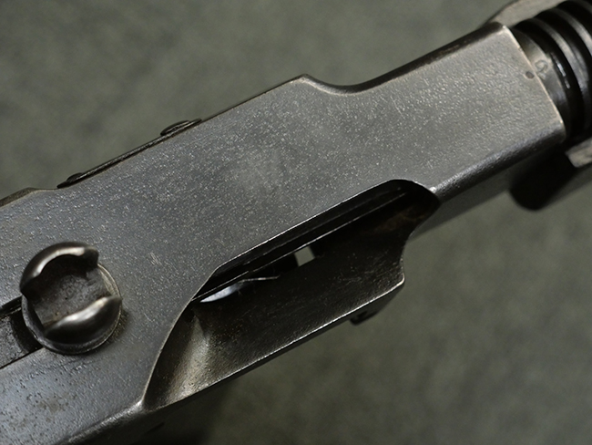 本品はシリアルがSで始まる事から、サベージ社製であることがわかります。 バレル・フィンがあり、プレス製のLyman (ライマン) 社製の固定型簡易サイトが付いた仕様です。 カッツ・コンペンセーター表面の刻印について薄くなっており判読できない状態です。 セレクターは削り出しタイプ、セーフティーはピンタイプが取り付けられています。 尚、ハンドガード後端にはサベージ製を示す「S」の刻印が見られます。 また、ストックのスリング・スイベルはバット・ストック上面に移設されており、元のスイベル取り付け部は木栓で埋められているなど、英軍で使用されたトンプソンに見られる仕様となっています。