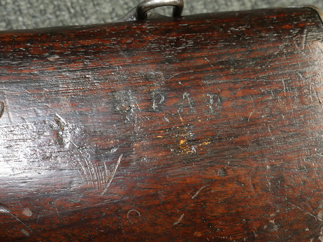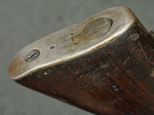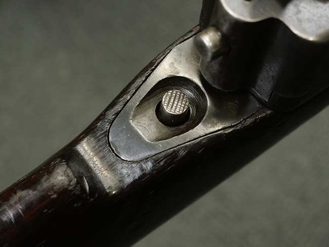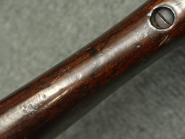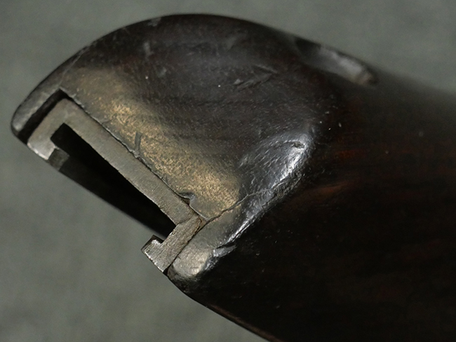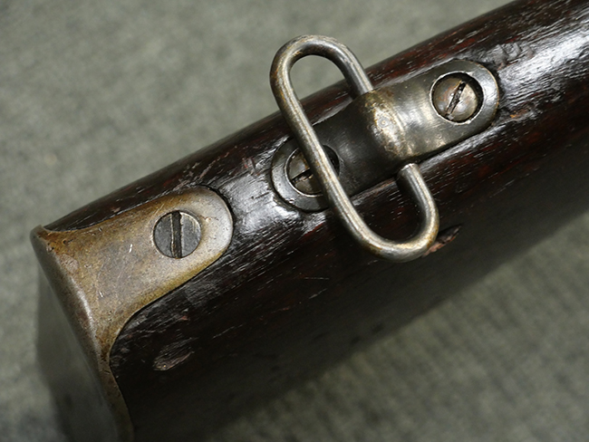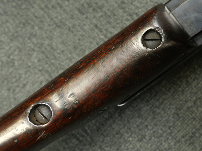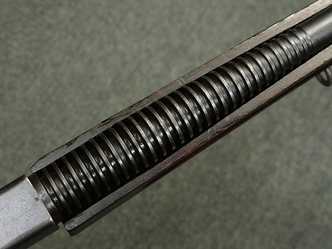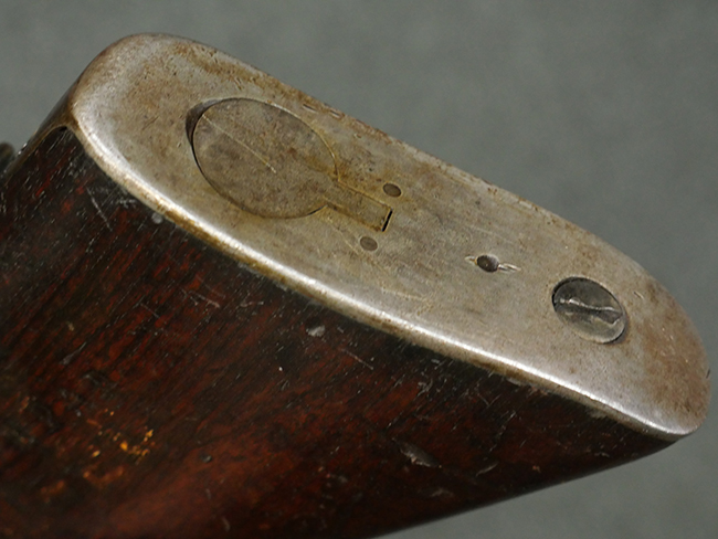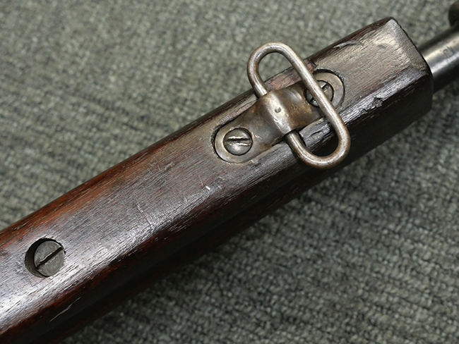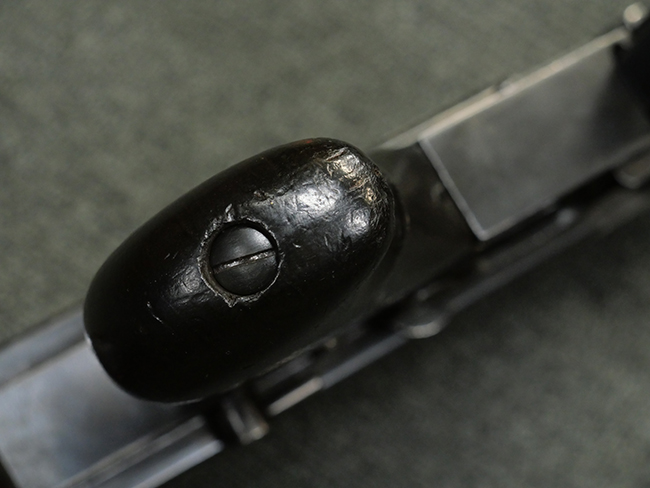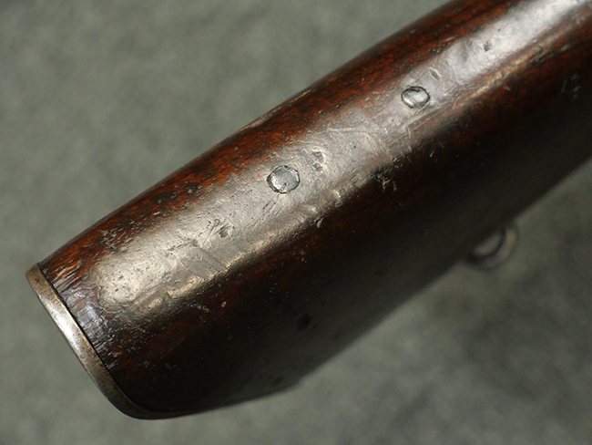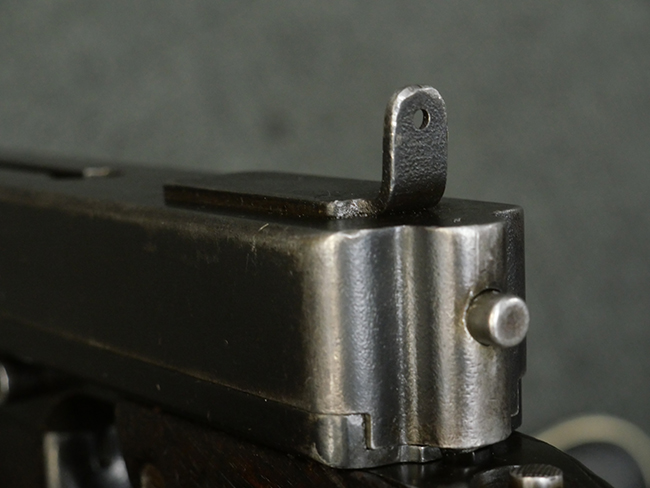 本品はシリアルがSで始まる事から、サベージ社製であることがわかります。 バレル・フィンがあり、プレス製のLyman (ライマン) 社製の固定型簡易サイトが付いた仕様です。 カッツ・コンペンセーター表面の刻印について薄くなっており判読できない状態です。 セレクターは削り出しタイプ、セーフティーはピンタイプが取り付けられています。 尚、ハンドガード後端にはサベージ製を示す「S」の刻印が見られます。 また、ストックのスリング・スイベルはバット・ストック上面に移設されており、元のスイベル取り付け部は木栓で埋められているなど、英軍で使用されたトンプソンに見られる仕様となっています。