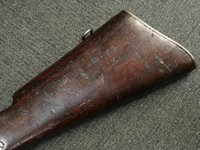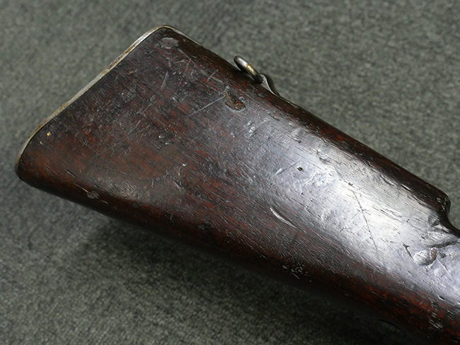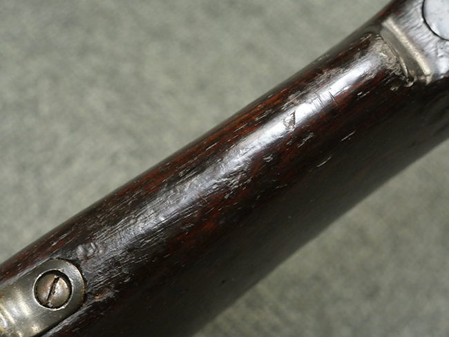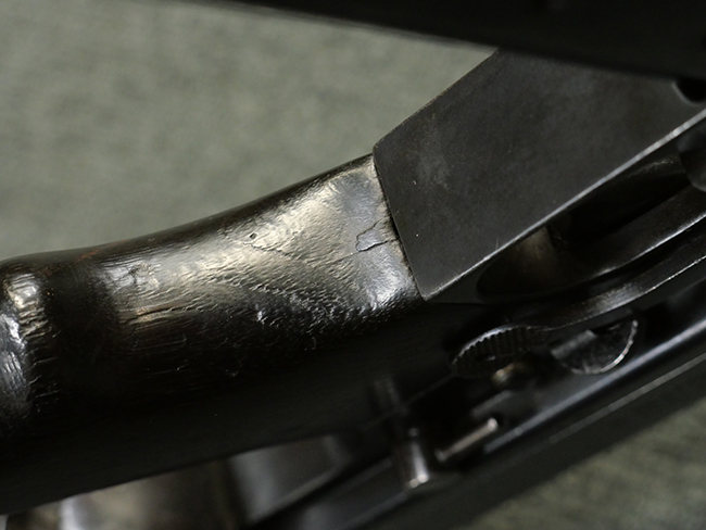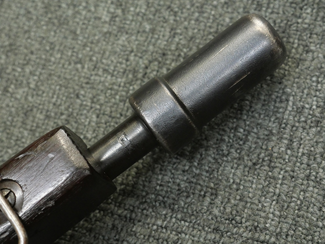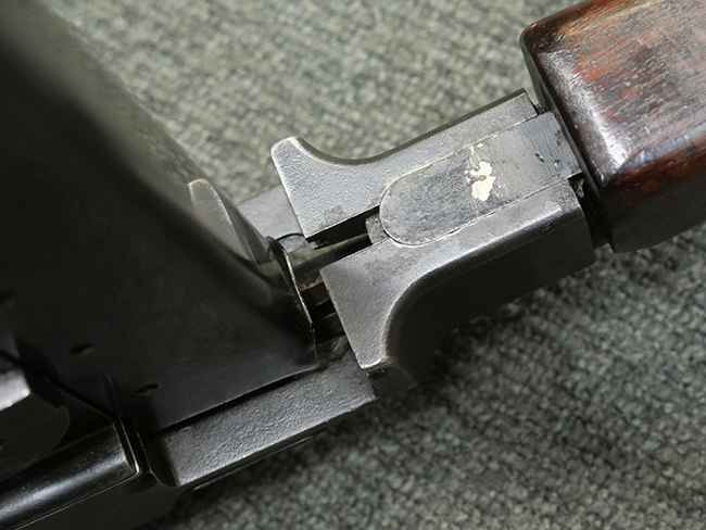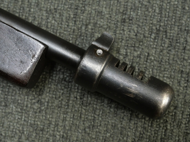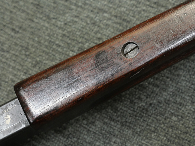 本品は全体に使用感が見受けられ、レシーバーや銃身といった金属部については、全体的に細かな朽ち込み錆痕が見られる他、角部などに仕上げが薄くなり金属の地肌が表れている箇所が見受けられるものの、全体に目立った欠損等は見られず、概ねしっかりとした状態が保たれています。 木製のハンドガード及びバット・ストックは、木部には若干の打ち傷やが見られるものの、概ねしっかりした状態が保たれています。 ハンドガード右面上部に強度に影響のない程度の小さなクラックが見られますが、。 木部の色味に関しては、ハンドガードがグリップやバット・ストックに比べて若干明るめの色合いとなっていますが、大きな違和感のない程度のもので、銃本体との取り付けにガタつきもなくしっかりとしています。 ハンドガードには左側面上部と下面のスイベル金具付近に一部欠けが見られます。 グリップには細かな打ち傷が見られるものの、クラック等は見られず取り付けにガタつきも見られません。 バット・ストックには若干の打ち傷が見られる他、ストック基部金具左右からクラックが見られます。 バット・ストック左側面の根元部には割れ留めと思われるネジが2本打たれています。 バット・ストックの取り付けは、若干の遊びが見られますが十分許容レベルで、着脱もスムーズに行えます。 バット・プレート部は、全体に表面仕上げが落ちて地の金属色となっている他、若干の打ち傷見られるものの、目立った変形等は見られず、ストック内コンパートメントの蓋の開閉についても問題なく行う事が可能です。 マガジンの着脱やリア・サイトの起倒・調整についても問題なく行う事が可能です。 セレクター・レバーの切り替えは加工によりシングルポジションには入らなくなっています。 セーフティ・レバーの切り替えは可能です。