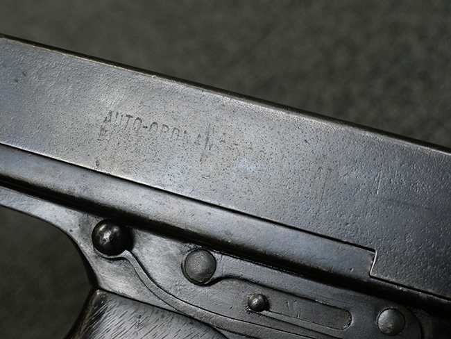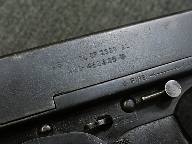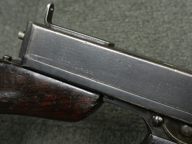 本品のレシーバー左側面にはシリアルNo.S-453339で、 レシーバー左側面には一部刻印が薄くなっていますが、「U.S. MODEL 1928 A1」及び「THOMPSON SUBMACHINE GUN CALIBRE .45 AUTOMATIC CARTRIDGE」の刻印が入っています。 レシーバー右側面の米国のパテント刻印、「AUTO-ORDNANCE」のアドレス刻印はかなり薄くなっており判読が難しくなっています。 レシーバー上面のトンプソンのロゴも輪郭を残して文字部分の判読は難しくなっています。 ロア・レシーバーのシリアルNo.はAO84414となっています。