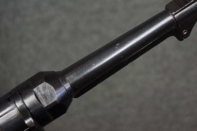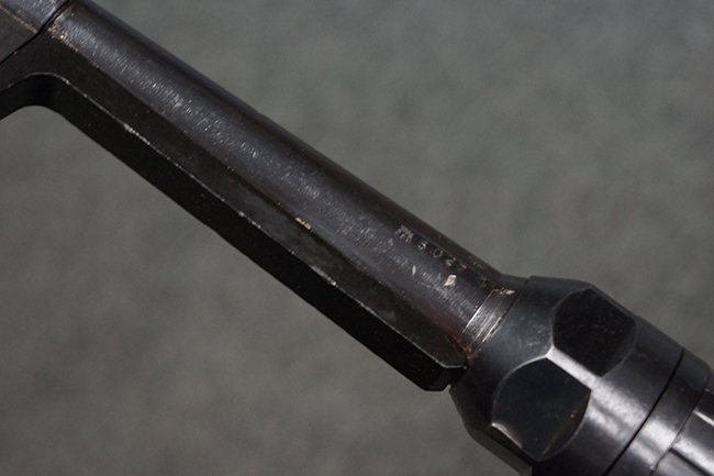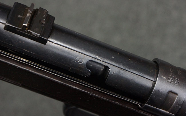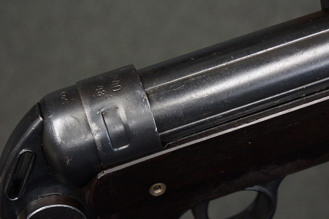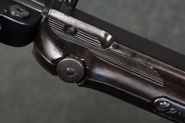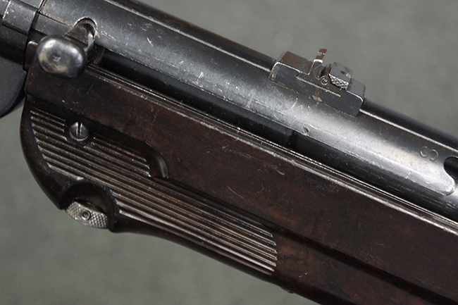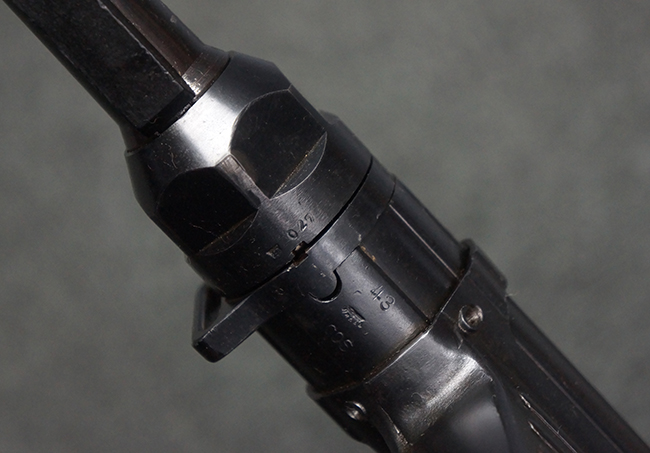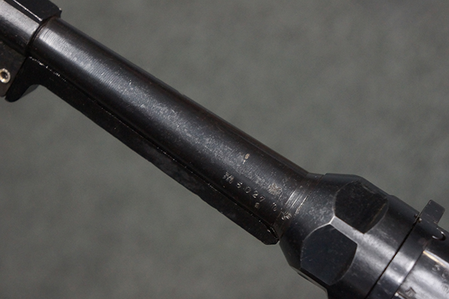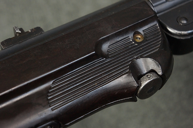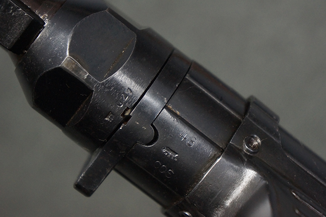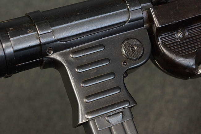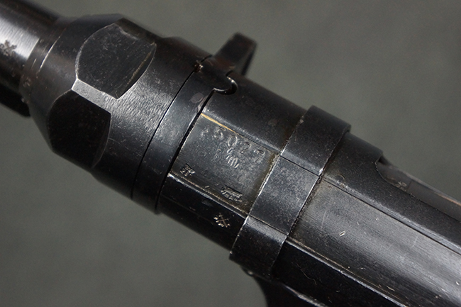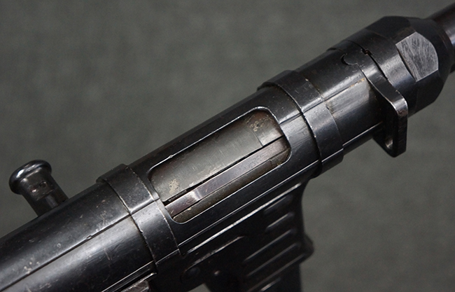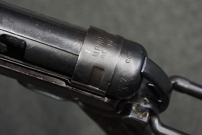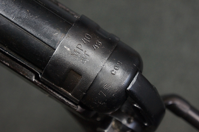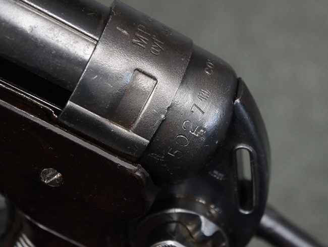 本品のレシーバー・エンド・キャップ上面には「MP40」のモデル名に加えて、1943年エルマ社 (Erfurter Maschinenfabrik Gmbh) 製を示す「ayf 43」の刻印が入っています。 アッパー・レシーバー及びレシーバー・エンド・キャップのシリアルNo.は5027mで、Merz-Werke Gebr社を示す「cos」のサブ・コントラクター刻印が打刻されています。 マガジン・ハウジングは両面に5本の強化リブが追加されたタイプとなっています。 その他のシリアルNo.については、銃身、バレル・ナット、フロント・サイト・ガード、リア・サイトが(5)027でレシーバーとマッチしており、トリガー・ガードとストックが(6)908(u)、マズル・リングが200、リコイル・スプリング・チューブが393となっています。 グリップ・フレームは前後二分割でプレス成型したものを溶接で組み合わせた初期のタイプで、マズル・リングは後期型の中央に溝のあるH型、バレル・ナットは六角型のタイプ、バレル・レストは樹脂製となっており、コッキング・ハンドルは1942年半ば以降に本格的に導入されたボルト・セーフティ機能を備えた2ピース・タイプが装備されています。