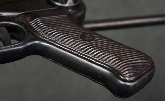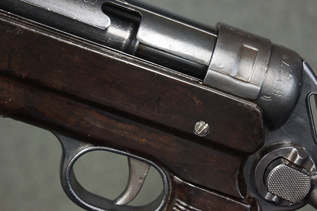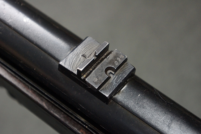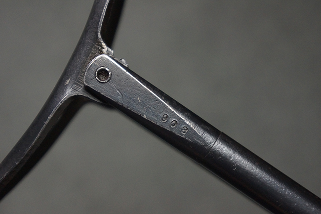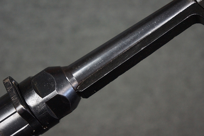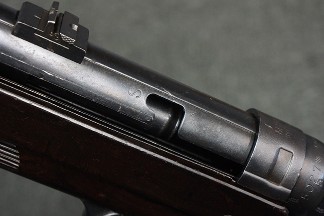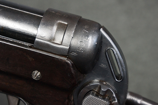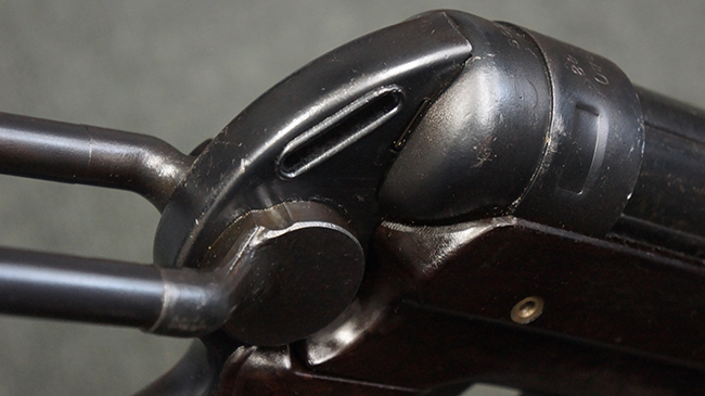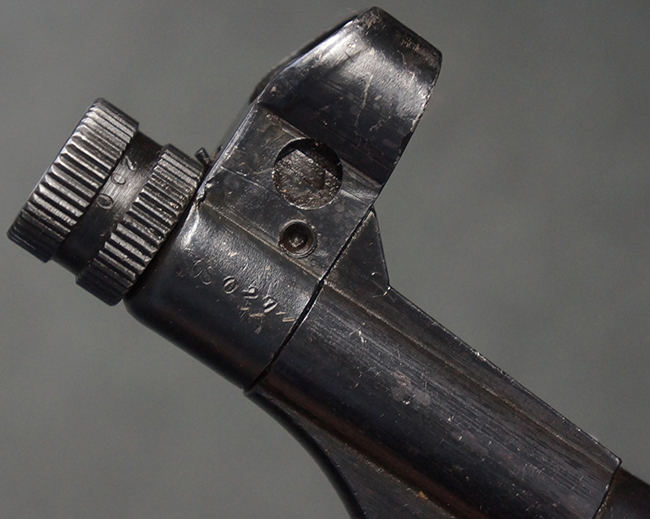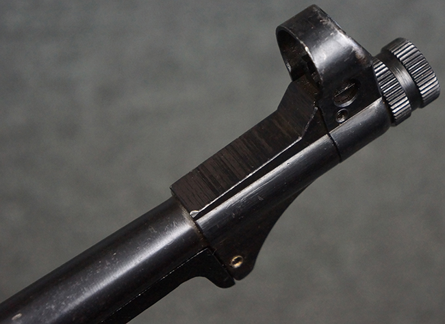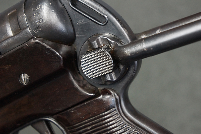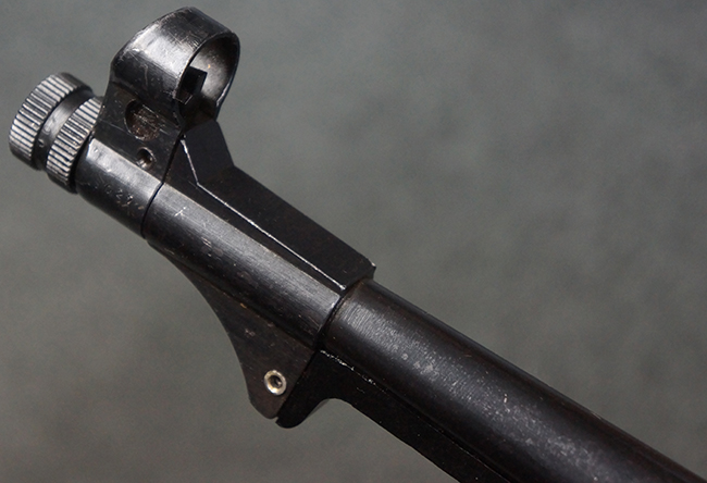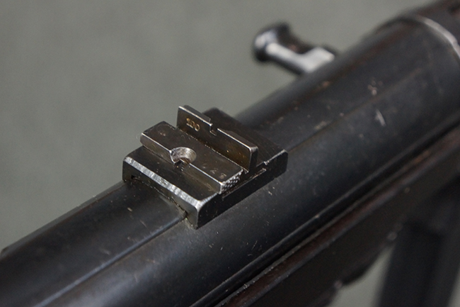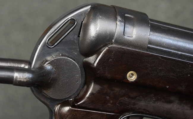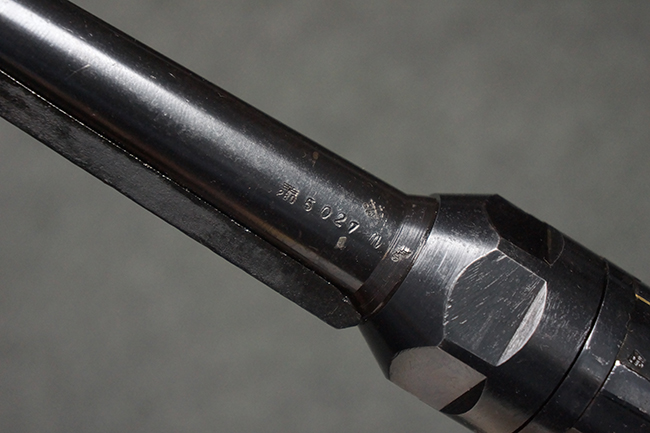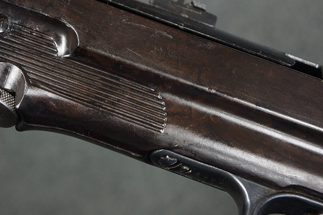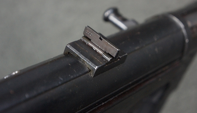本品のレシーバー・エンド・キャップ上面には「MP40」のモデル名に加えて、1943年エルマ社 (Erfurter Maschinenfabrik Gmbh) 製を示す「ayf 43」の刻印が入っています。 アッパー・レシーバー及びレシーバー・エンド・キャップのシリアルNo.は5027mで、Merz-Werke Gebr社を示す「cos」のサブ・コントラクター刻印が打刻されています。 マガジン・ハウジングは両面に5本の強化リブが追加されたタイプとなっています。 その他のシリアルNo.については、銃身、バレル・ナット、フロント・サイト・ガード、リア・サイトが(5)027でレシーバーとマッチしており、トリガー・ガードとストックが(6)908(u)、マズル・リングが200、リコイル・スプリング・チューブが393となっています。 グリップ・フレームは前後二分割でプレス成型したものを溶接で組み合わせた初期のタイプで、マズル・リングは後期型の中央に溝のあるH型、バレル・ナットは六角型のタイプ、バレル・レストは樹脂製となっており、コッキング・ハンドルは1942年半ば以降に本格的に導入されたボルト・セーフティ機能を備えた2ピース・タイプが装備されています。