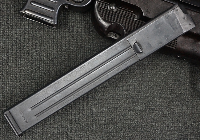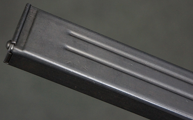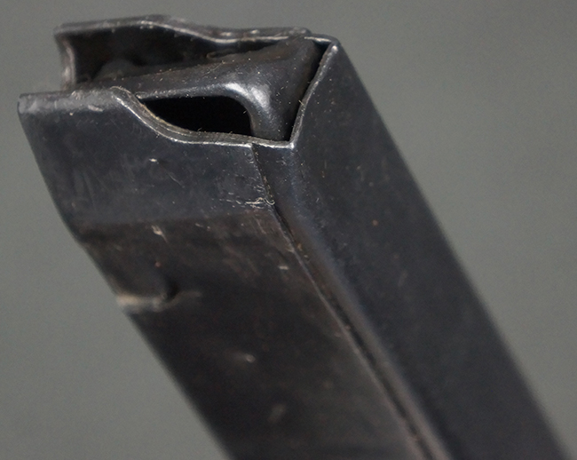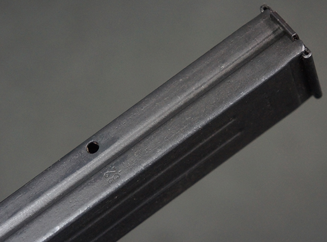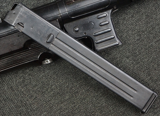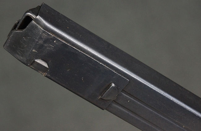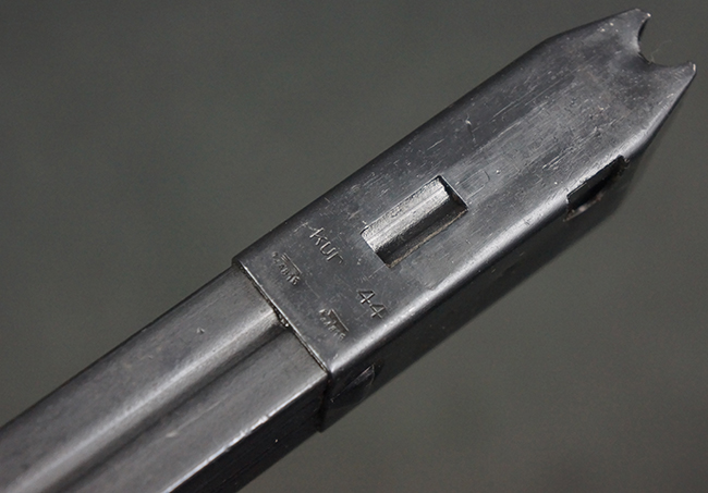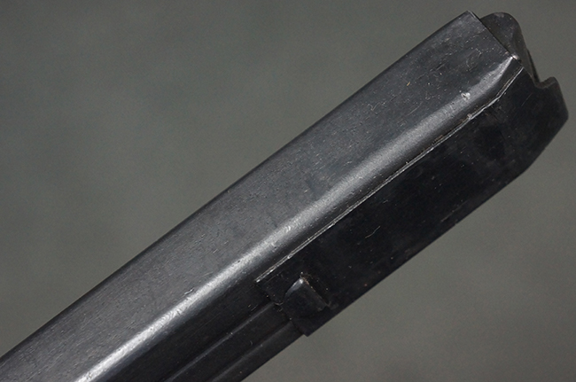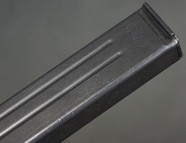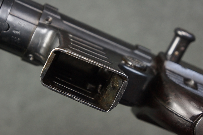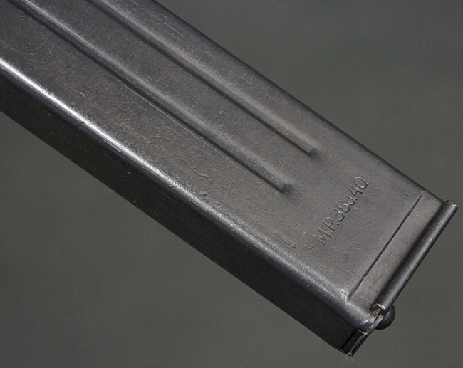 本品の機関部や銃身といった金属部は、やや打ち傷や擦れ、経年による褪色の他、一部に表面錆痕や仕上げが落ちて金属の地肌が表れている箇所が見られるものの、現状目立った欠損等は見受けられず、オリジナルのブルー仕上げも比較的残っています。 樹脂製のハンドガードやグリップ・パネル、バレル・レストについても、やや打ち傷や線傷等は見られるものの、大きな破損等は見られず、比較的良好な状態が保たれています。 アッパー・レシーバーとロア・レシーバーの取り付けにはやや遊びが見られます。 マガジンの着脱やリア・サイトの切り替え、ストックの展開・折り畳み操作については問題なく行う事が可能です。 前部スリング取り付け金具にやや遊びが見られます。 マガジンは取り付け時に前後にやや遊びが見られますが、固定自体はしっかりとしています。 ストックは折り畳み時に若干の遊びが見られますが、MP40としては平均的なレベルです。 付属のマガジンには「M.P.38 u 40」及び1944年ステアー社製を示す「kur 44」の刻印が入っており、やや打ち傷や表面錆痕が見られるものの、大きな凹みや変形は見られず、概ねしっかりとした状態が保たれています。 尚、マガジン・スプリングは入っています。