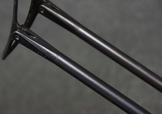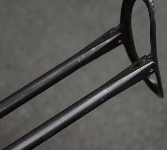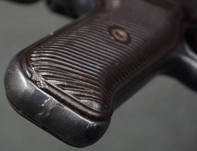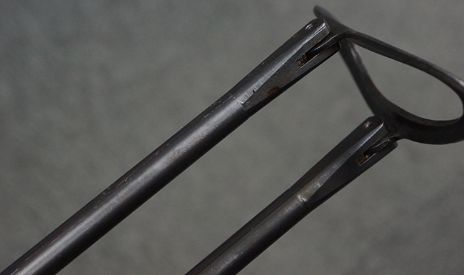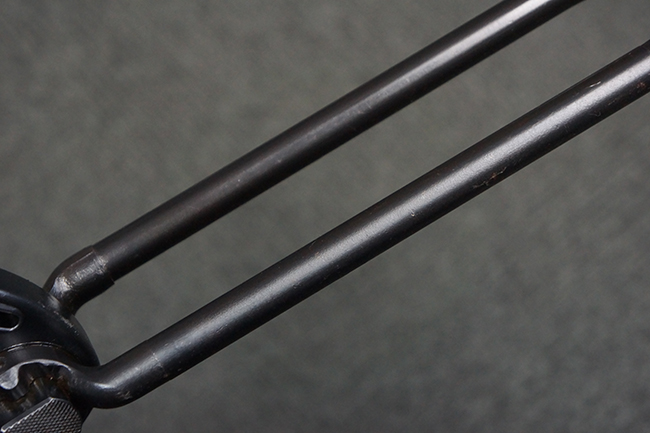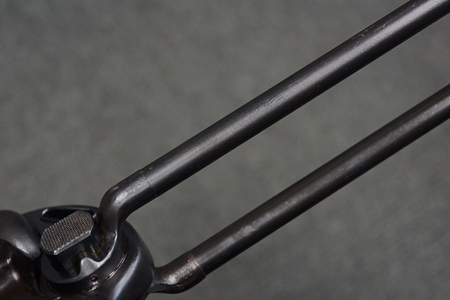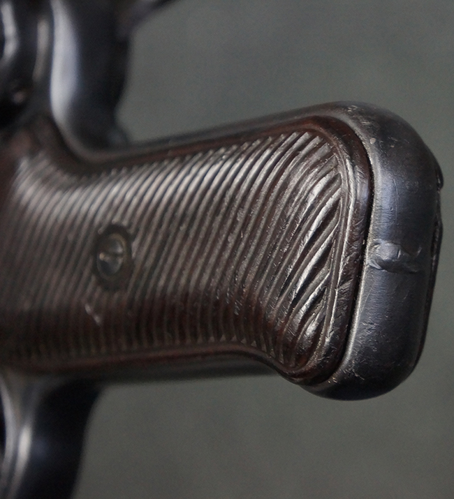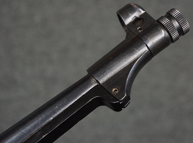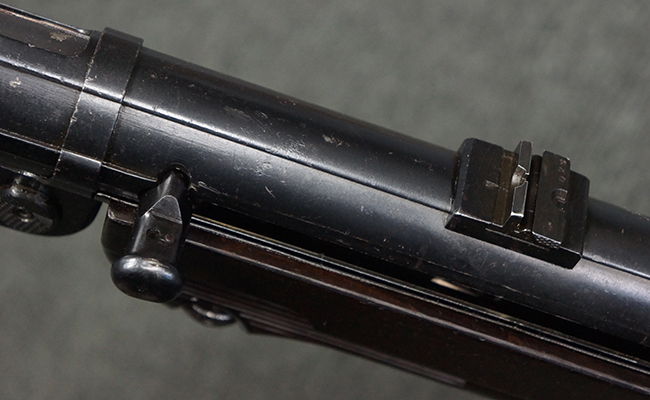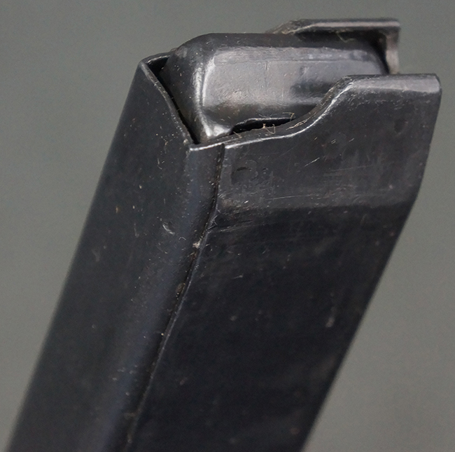 本品の機関部や銃身といった金属部は、やや打ち傷や擦れ、経年による褪色の他、一部に表面錆痕や仕上げが落ちて金属の地肌が表れている箇所が見られるものの、現状目立った欠損等は見受けられず、オリジナルのブルー仕上げも比較的残っています。 樹脂製のハンドガードやグリップ・パネル、バレル・レストについても、やや打ち傷や線傷等は見られるものの、大きな破損等は見られず、比較的良好な状態が保たれています。 アッパー・レシーバーとロア・レシーバーの取り付けにはやや遊びが見られます。 マガジンの着脱やリア・サイトの切り替え、ストックの展開・折り畳み操作については問題なく行う事が可能です。 前部スリング取り付け金具にやや遊びが見られます。 マガジンは取り付け時に前後にやや遊びが見られますが、固定自体はしっかりとしています。 ストックは折り畳み時に若干の遊びが見られますが、MP40としては平均的なレベルです。 付属のマガジンには「M.P.38 u 40」及び1944年ステアー社製を示す「kur 44」の刻印が入っており、やや打ち傷や表面錆痕が見られるものの、大きな凹みや変形は見られず、概ねしっかりとした状態が保たれています。 尚、マガジン・スプリングは入っています。