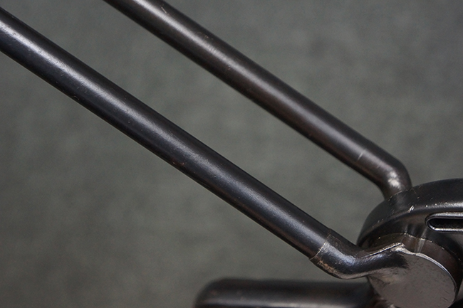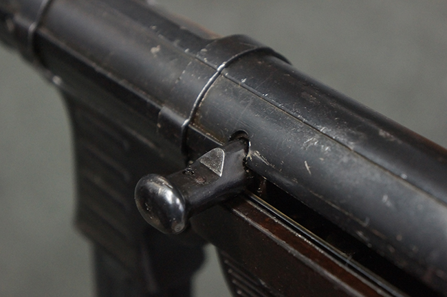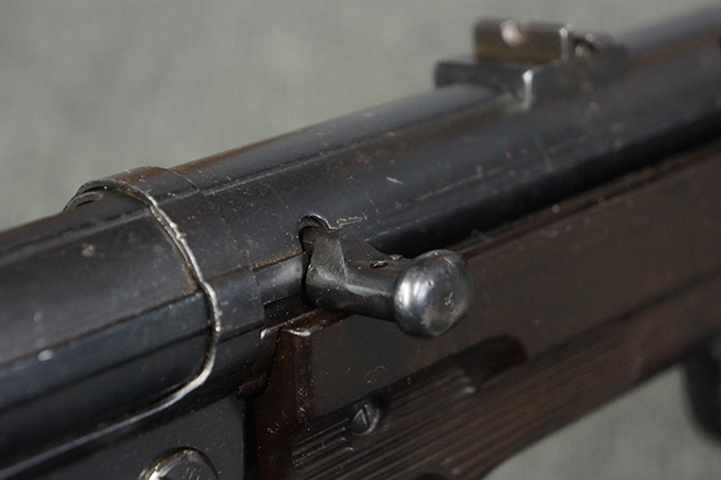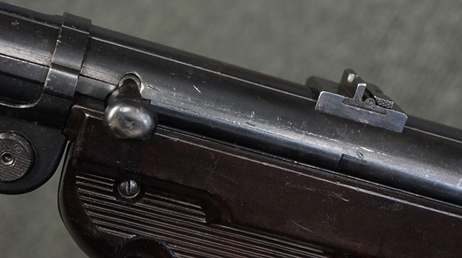 MP38ではレシーバーを無垢の鉄材からの削り出しで製作していた他、グリップ・フレームが鋳造アルミ合金製でしたが、MP40では生産性を向上させるためにレシーバー及びグリップ・フレームに鋼板プレス加工を採用しました。 これにより製造工程が簡略化された他、ドイツ国内で調達が難しかったアルミニウムの節約にも繋がりました。 また、MP38ではマガジンに弾薬を装填した状態で銃を後部から落下させた際に、ボルトが前進位置から跳ね上がって暴発する危険性がありましたが、1940年後半にドイツの銃器設計者ヒューゴ・シュマイザーによってコッキング・ハンドルを内側に押し込む事によりボルトを閉鎖位置で固定するフォワード・ロック・セーフティが開発されました。 このセーフティ機能を備えた新たな2ピース型のコッキング・ハンドルは、1942年半ば以降に製造されたMP40から本格的に装備されるようになりました。