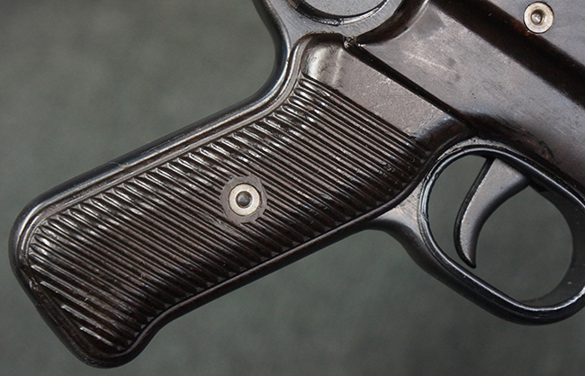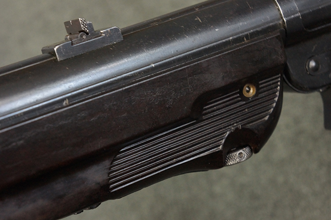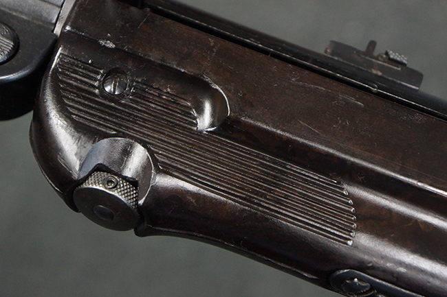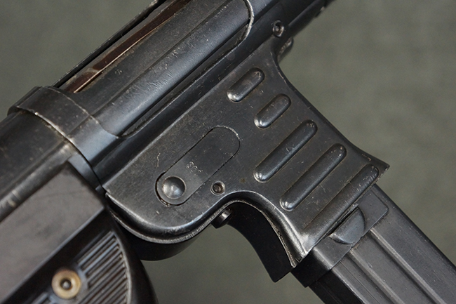 MP40のバリエーションの内、1941~1942年頃にエルマ社、ステアー社、ハーネル社で製造されたタイプは、マガジン・ハウジングの両側面に5本の強化リブが追加されているのが特徴で、これ以降に製造されたタイプでは全てマガジン・ハウジング表面にリブが追加されるようになりました。 グリップ・フレームは初期型と同様に前後二分割でプレス成型したものを溶接で組み合わせて製造されています。コッキング・ハンドルについては、1942年6月以降フォワード・ロック・セーフティ機能を備えたタイプの生産が本格的に開始された為、セーフティ機能付きのコッキング・ハンドルが付いた個体と初期型のフック型コッキング・ハンドルが付いた個体の両方が存在します。