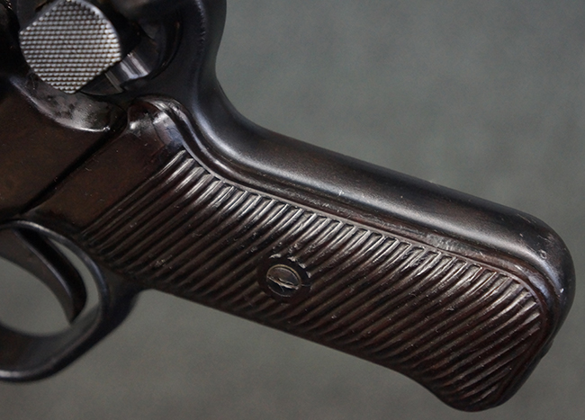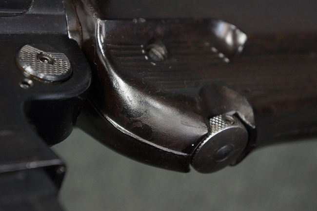 1943年頃にエルマ社で製造された第3のバリエーションではコッキング・ハンドルがボルト・セーフティ機能付の2ピース型のみとなり、これ以降に製造されたMP40でも全てこの2ピース型が装備されるようになりました。 このバリエーションではバレル・ナットのレンチを組み合わせる平面部分が2箇所のみのタイプが取り付けられており、バレル・レストもプレス製となっているのが特徴です。 マガジン・ハウジングは両面に5本の強化リブが付いたタイプで、グリップ・フレームは二分割でプレス成型したものを溶接で組み合わせて製造されています。 同じく1943年頃にステアー社で製造されたMP40では、グリップ・フレームがプレス製で一体製造したものを左右貼り合わせたタイプに変更され、トリガー・ガードも従来型と比べてより厚みのある形状となったのが特徴です。 このタイプでは樹脂製のバレル・レストが装備されています。