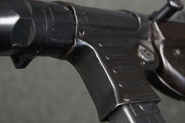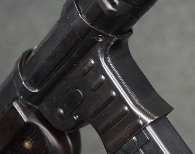 1943~1944年頃にステアー社で製造されたMP40短機関銃の最終型では、レシーバー・エンド・キャップとロア・レシーバーをプレスにより一体成型しているのが特徴です。 このタイプでは、プレスにより鋼板を折り込む方法でロア・レシーバー全体を成形しており、エンド・キャップ上面からロア・レシーバーの外縁部にかけて補強板のように見える板状の継ぎ目が見られます。 バレル・レストは1943年にエルマ社で製造されたタイプと同様にプレス製となっています。