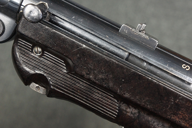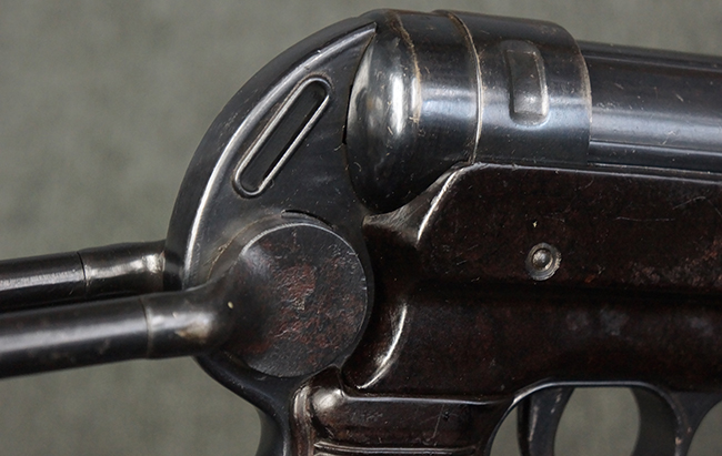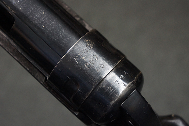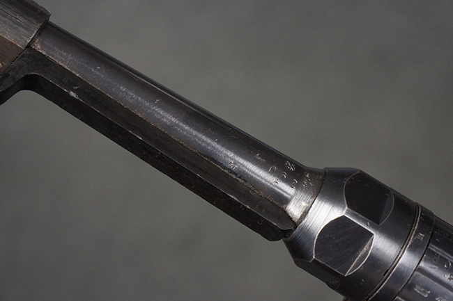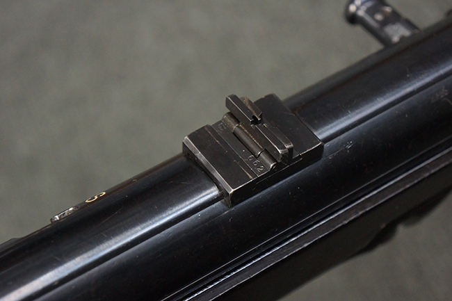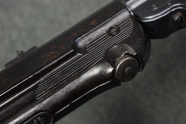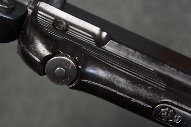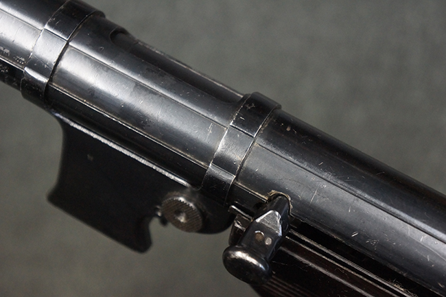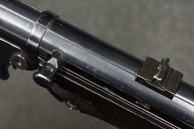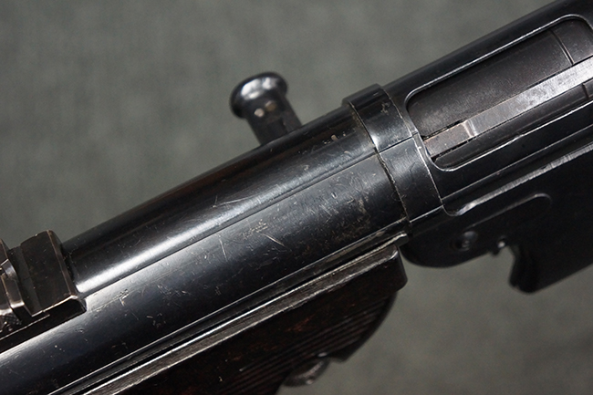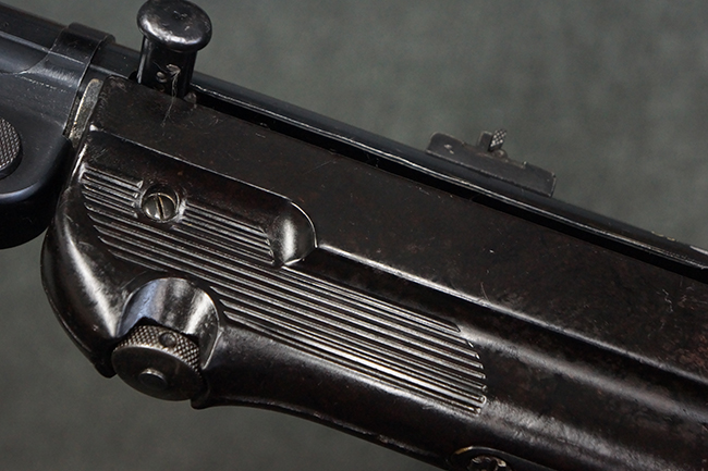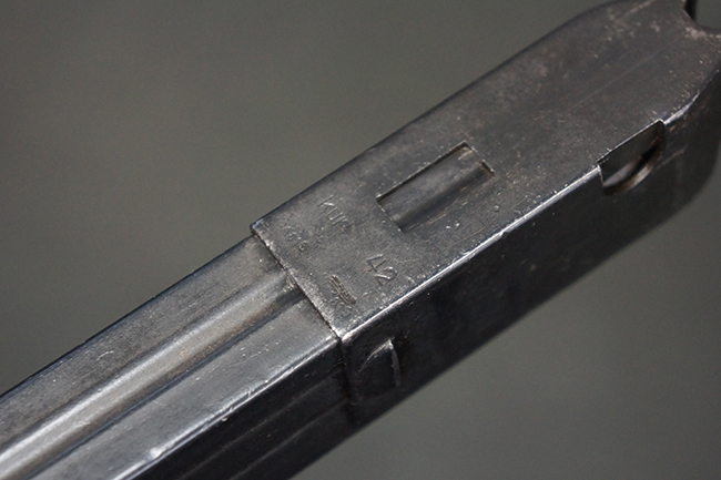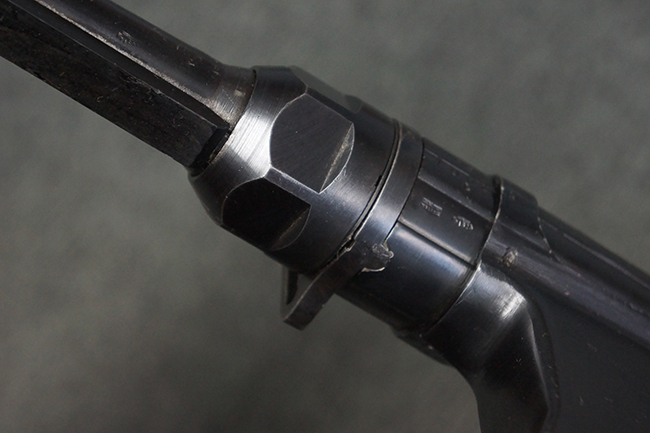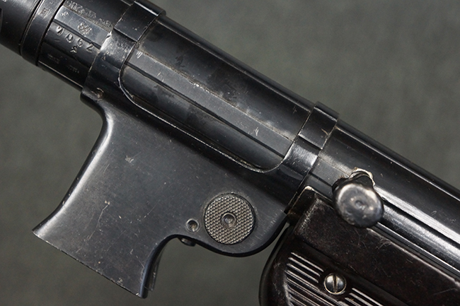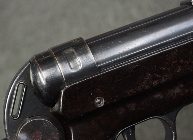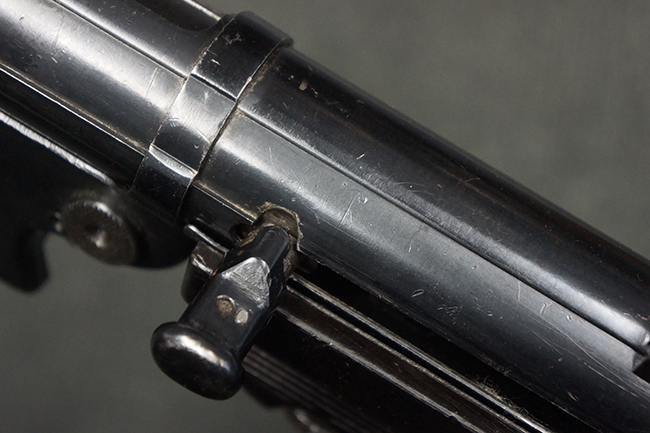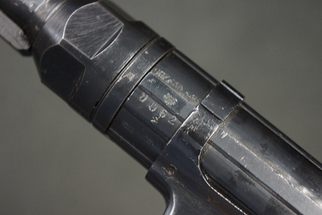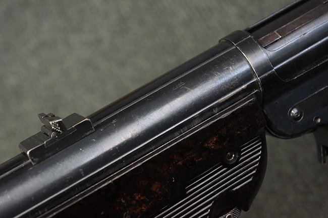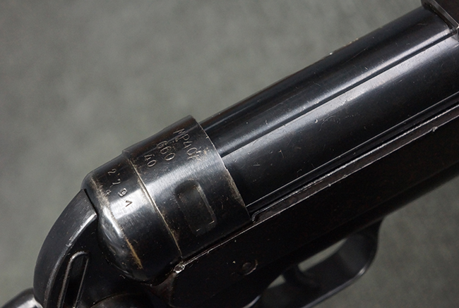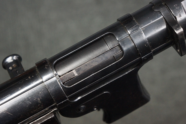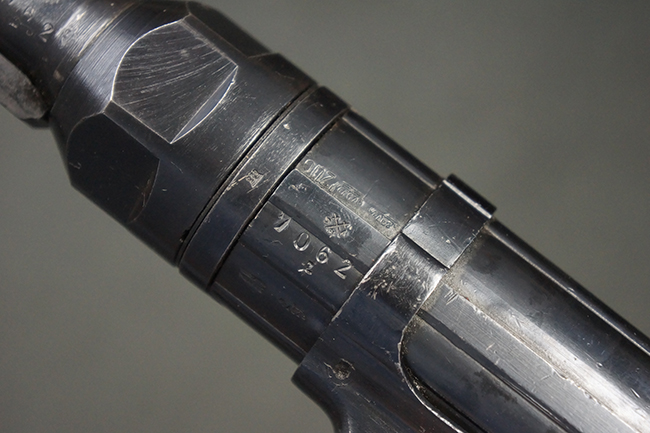 本品のレシーバー・エンド・キャップ上面には「MP40」のモデル名に加えて、1940年ステアー社製を示す「660 40」の刻印が入っています。 レシーバー・エンド・キャップのシリアルNo.は2791g、アッパー・レシーバーのシリアルNo.は7062fで、アッパー・レシーバーにもステアー社製を示す「bnz」の刻印が入っています。 マガジン・ハウジングは両面に強化リブのないタイプとなっています。 その他のシリアルNo.については、銃身、バレル・ナット、リア・サイトが(7)062(f)でアッパー・レシーバーとマッチしており、フロント・サイト・ガードが052、トリガー・ガードが366f、ストックが145、リコイル・スプリング・チューブが589となっています。 グリップ・フレームは下部の溶接がない一体成形でトリガー・ガードは従来と同様のタイプ、フロント・サイト・ガードの前方には金属製のマズル・プロテクター用の突起が付いており、マズル・リングは中央に溝のない初期のタイプが取り付けられています。 バレル・ナットは六角型のタイプ、バレル・レストは樹脂製となっており、コッキング・ハンドルは1942年半ば以降に本格的に導入されたボルト・セーフティ機能を備えた2ピース・タイプが装備されています。