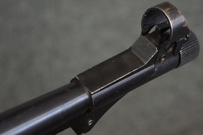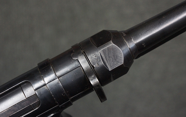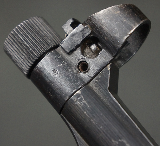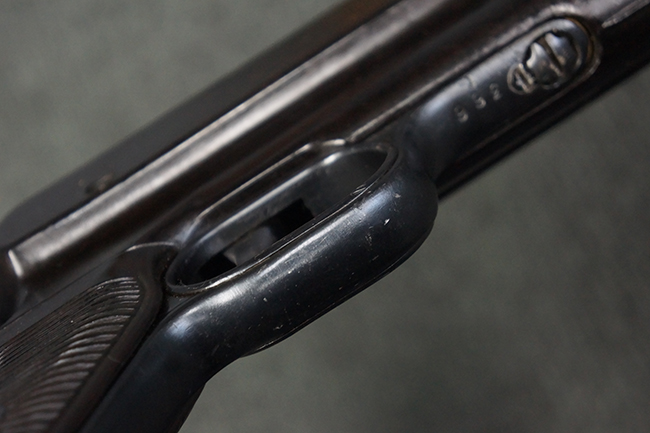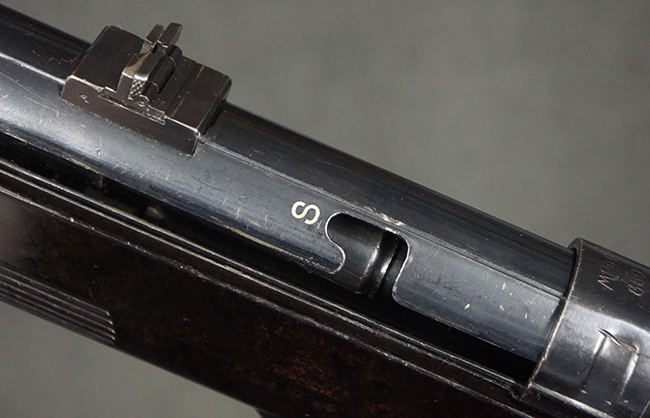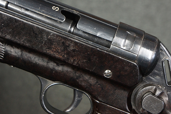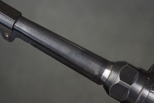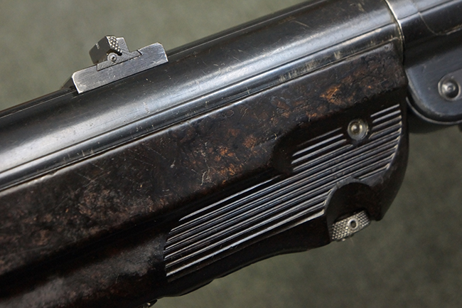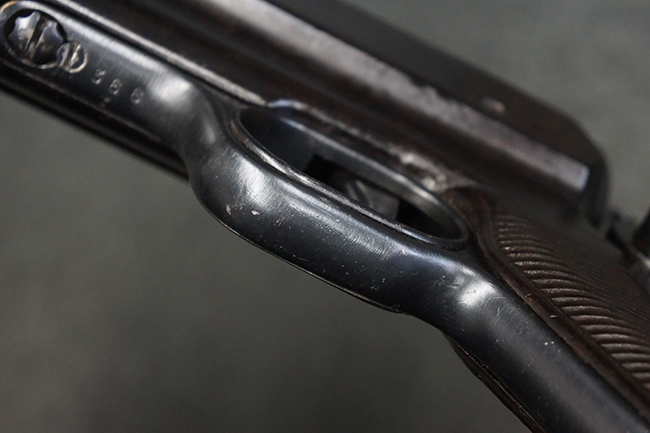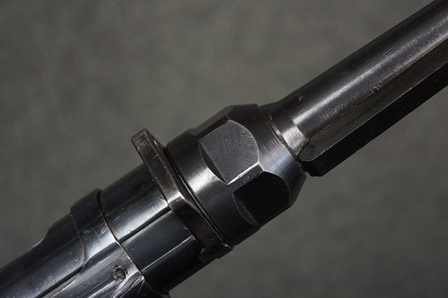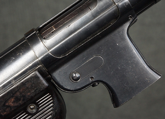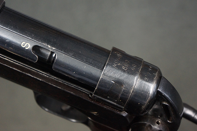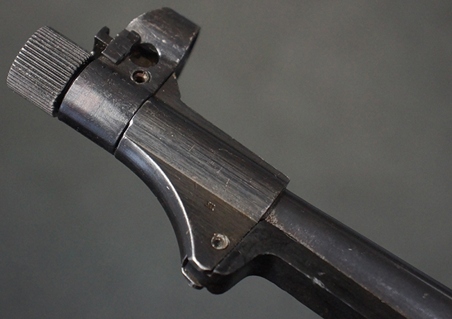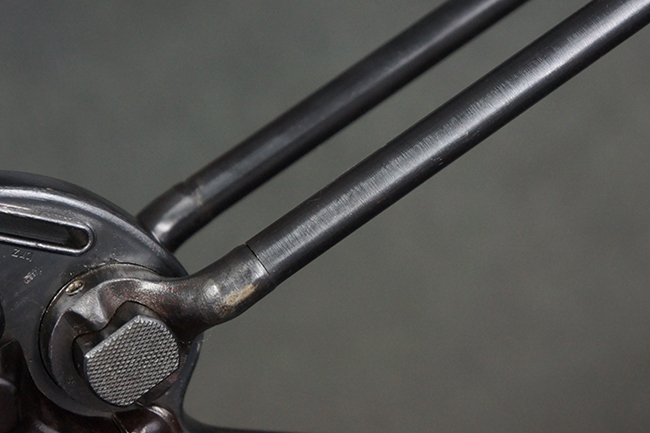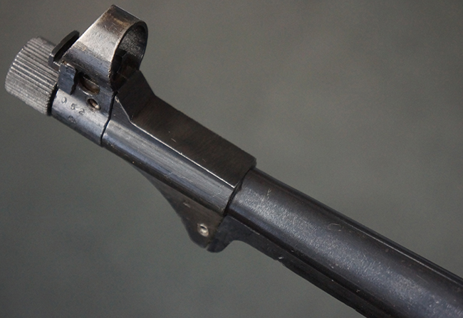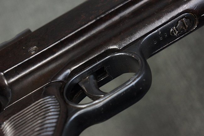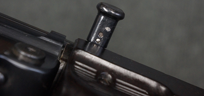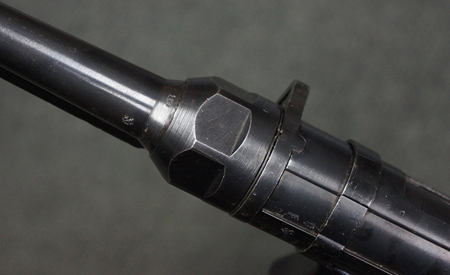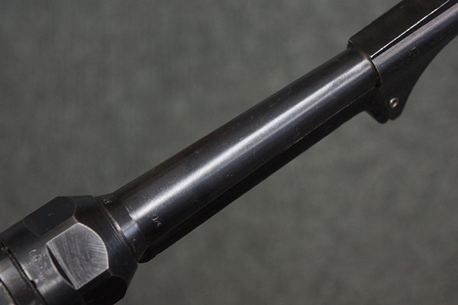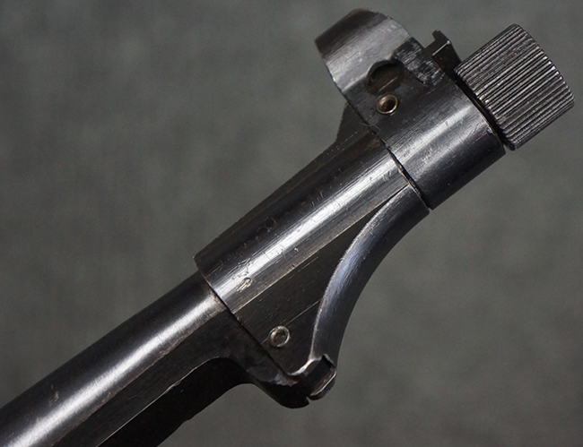 本品のレシーバー・エンド・キャップ上面には「MP40」のモデル名に加えて、1940年ステアー社製を示す「660 40」の刻印が入っています。 レシーバー・エンド・キャップのシリアルNo.は2791g、アッパー・レシーバーのシリアルNo.は7062fで、アッパー・レシーバーにもステアー社製を示す「bnz」の刻印が入っています。 マガジン・ハウジングは両面に強化リブのないタイプとなっています。 その他のシリアルNo.については、銃身、バレル・ナット、リア・サイトが(7)062(f)でアッパー・レシーバーとマッチしており、フロント・サイト・ガードが052、トリガー・ガードが366f、ストックが145、リコイル・スプリング・チューブが589となっています。 グリップ・フレームは下部の溶接がない一体成形でトリガー・ガードは従来と同様のタイプ、フロント・サイト・ガードの前方には金属製のマズル・プロテクター用の突起が付いており、マズル・リングは中央に溝のない初期のタイプが取り付けられています。 バレル・ナットは六角型のタイプ、バレル・レストは樹脂製となっており、コッキング・ハンドルは1942年半ば以降に本格的に導入されたボルト・セーフティ機能を備えた2ピース・タイプが装備されています。