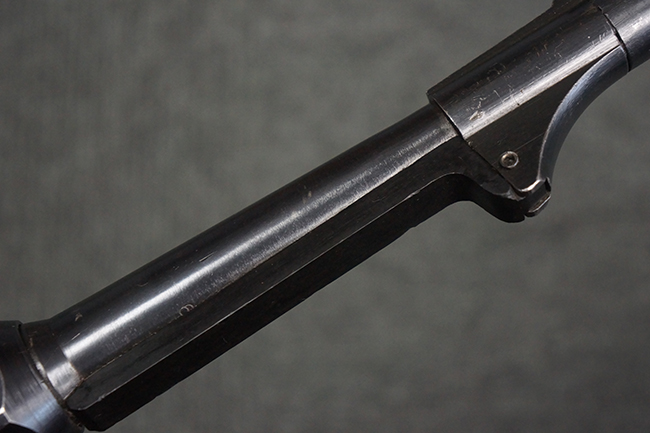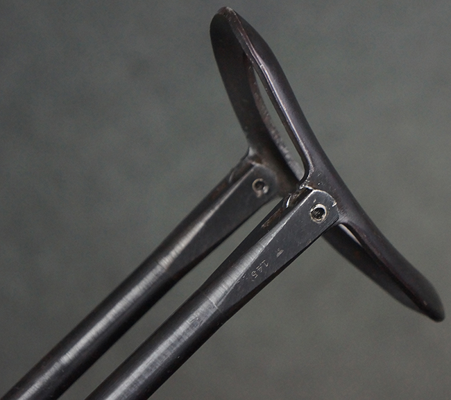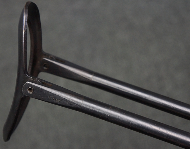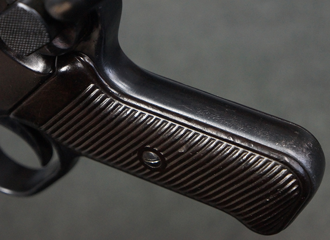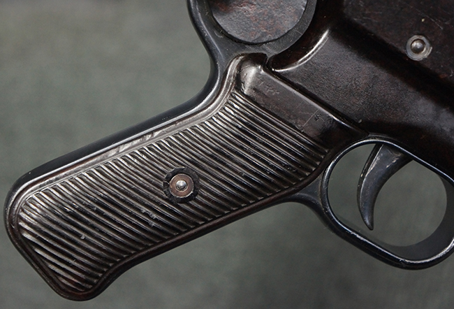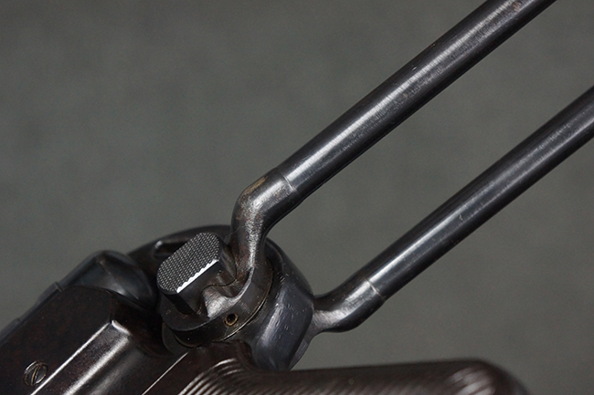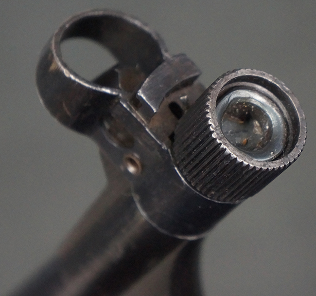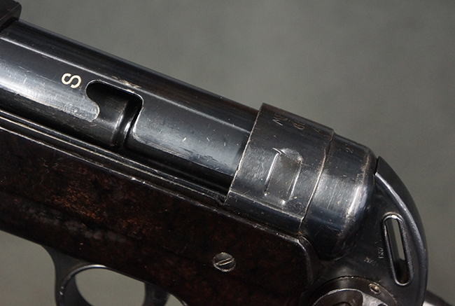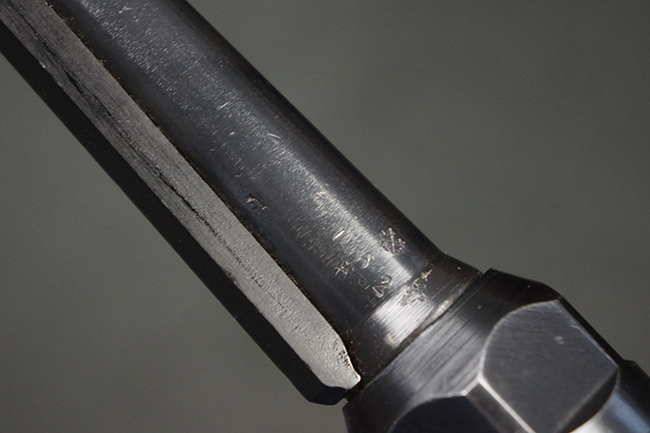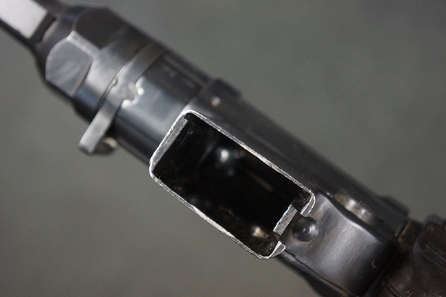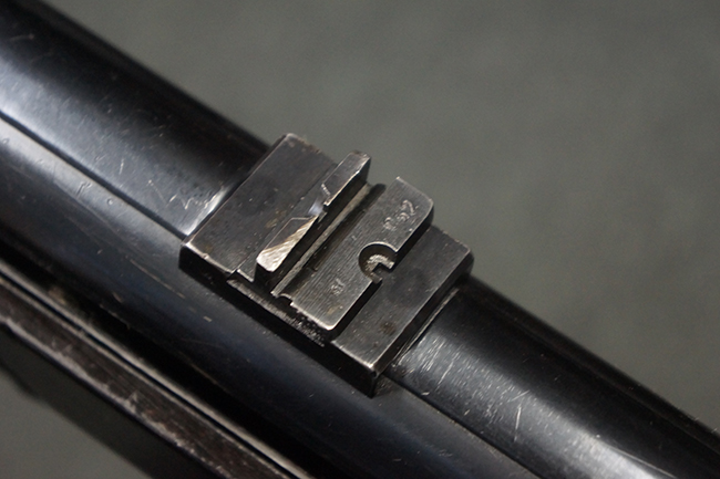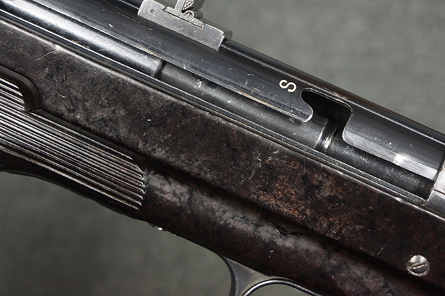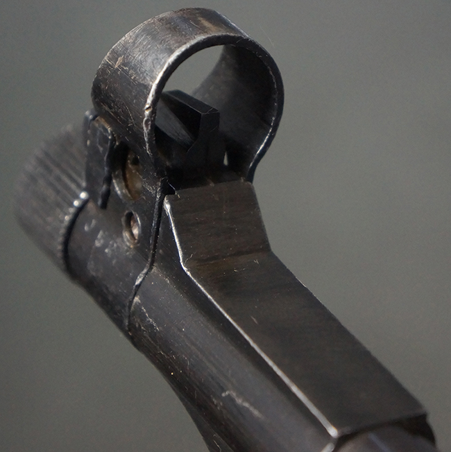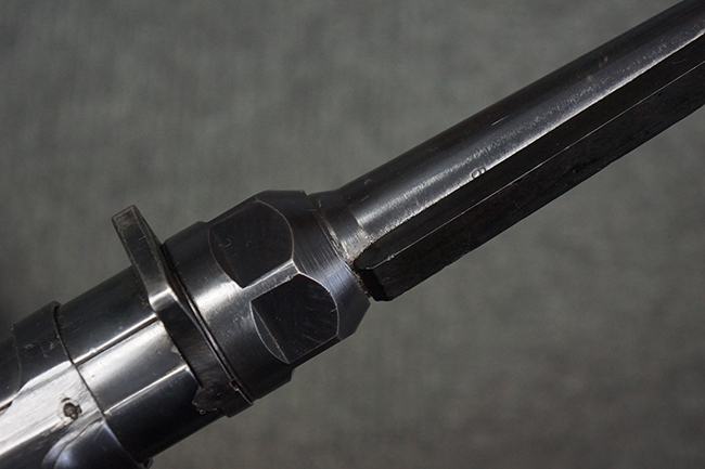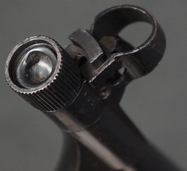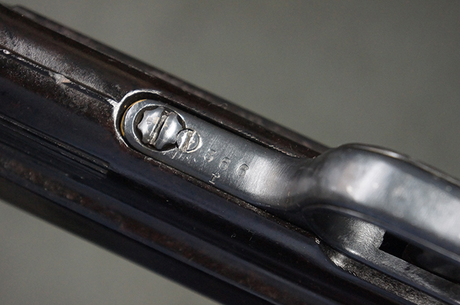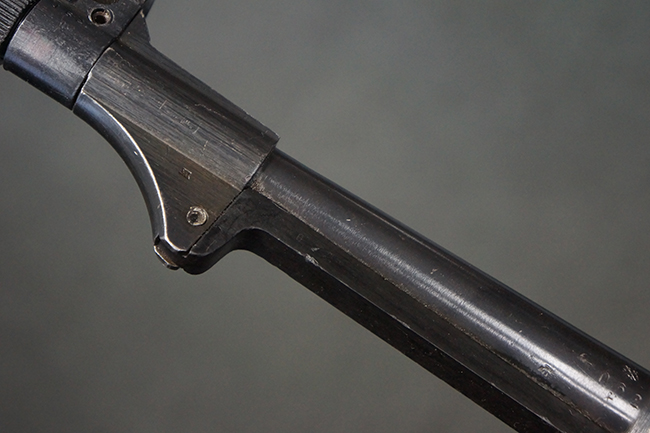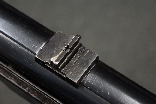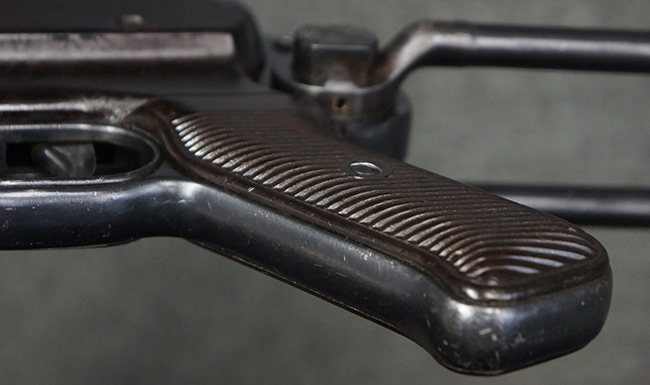 本品のレシーバー・エンド・キャップ上面には「MP40」のモデル名に加えて、1940年ステアー社製を示す「660 40」の刻印が入っています。 レシーバー・エンド・キャップのシリアルNo.は2791g、アッパー・レシーバーのシリアルNo.は7062fで、アッパー・レシーバーにもステアー社製を示す「bnz」の刻印が入っています。 マガジン・ハウジングは両面に強化リブのないタイプとなっています。 その他のシリアルNo.については、銃身、バレル・ナット、リア・サイトが(7)062(f)でアッパー・レシーバーとマッチしており、フロント・サイト・ガードが052、トリガー・ガードが366f、ストックが145、リコイル・スプリング・チューブが589となっています。 グリップ・フレームは下部の溶接がない一体成形でトリガー・ガードは従来と同様のタイプ、フロント・サイト・ガードの前方には金属製のマズル・プロテクター用の突起が付いており、マズル・リングは中央に溝のない初期のタイプが取り付けられています。 バレル・ナットは六角型のタイプ、バレル・レストは樹脂製となっており、コッキング・ハンドルは1942年半ば以降に本格的に導入されたボルト・セーフティ機能を備えた2ピース・タイプが装備されています。