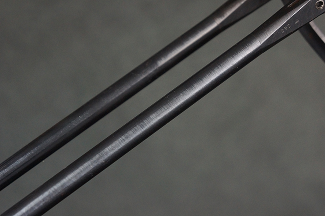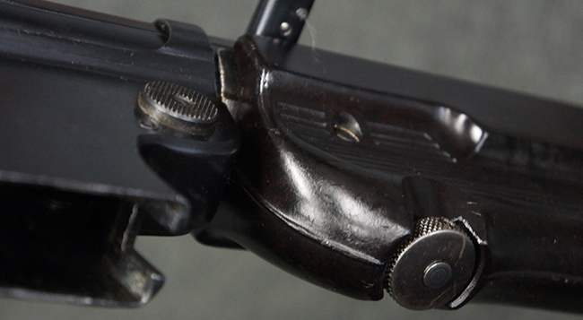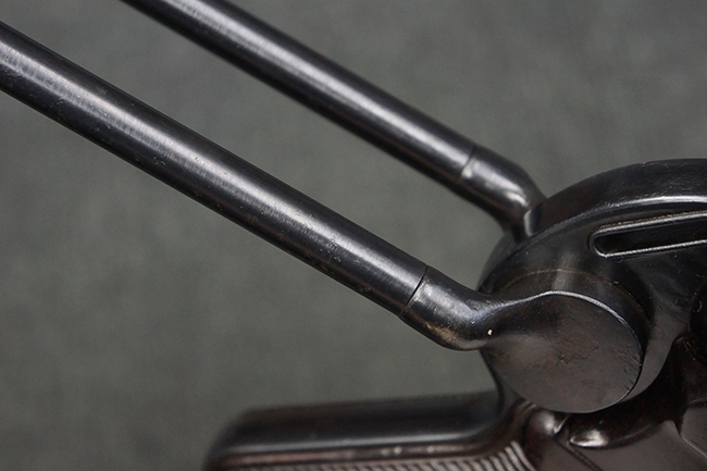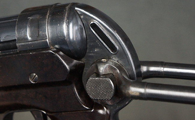 MP38ではレシーバーを無垢の鉄材からの削り出しで製作していた他、グリップ・フレームが鋳造アルミ合金製でしたが、MP40では生産性を向上させるためにレシーバー及びグリップ・フレームに鋼板プレス加工を採用しました。 これにより製造工程が簡略化された他、ドイツ国内で調達が難しかったアルミニウムの節約にも繋がりました。 また、MP38ではマガジンに弾薬を装填した状態で銃を後部から落下させた際に、ボルトが前進位置から跳ね上がって暴発する危険性がありましたが、1940年後半にドイツの銃器設計者ヒューゴ・シュマイザーによってコッキング・ハンドルを内側に押し込む事によりボルトを閉鎖位置で固定するフォワード・ロック・セーフティが開発されました。 このセーフティ機能を備えた新たな2ピース型のコッキング・ハンドルは、1942年半ば以降に製造されたMP40から本格的に装備されるようになりました。