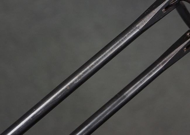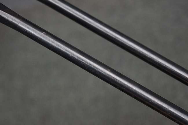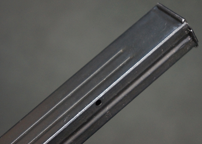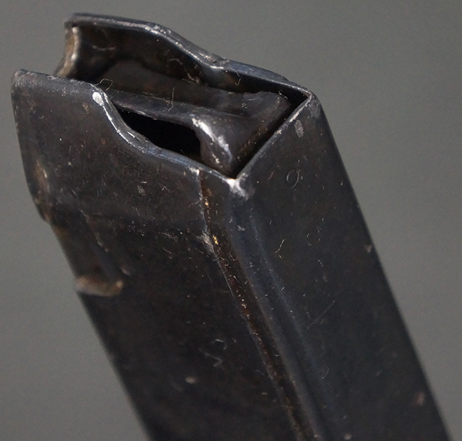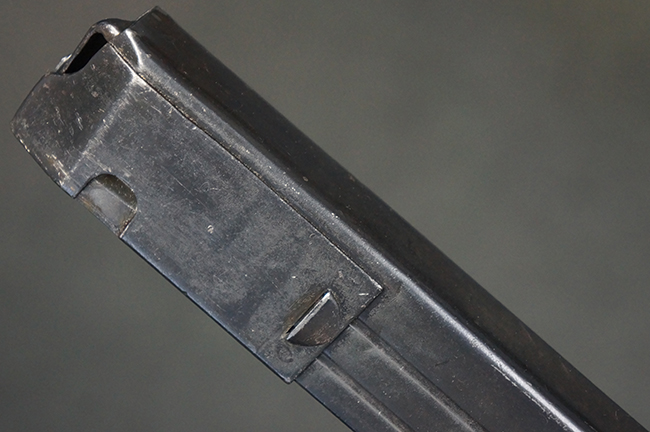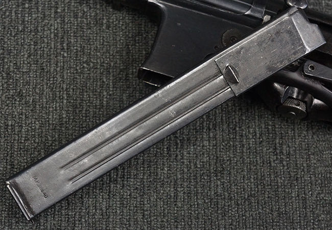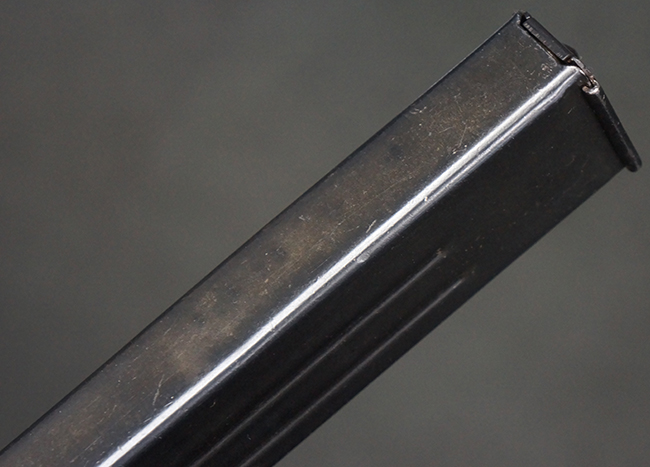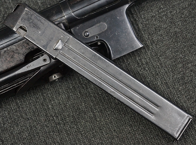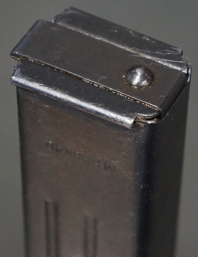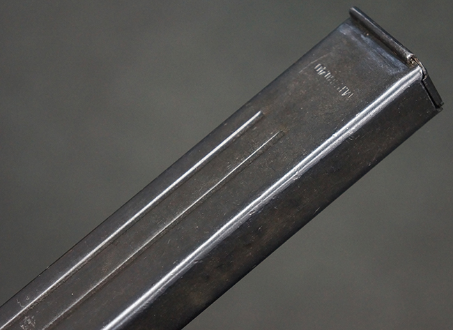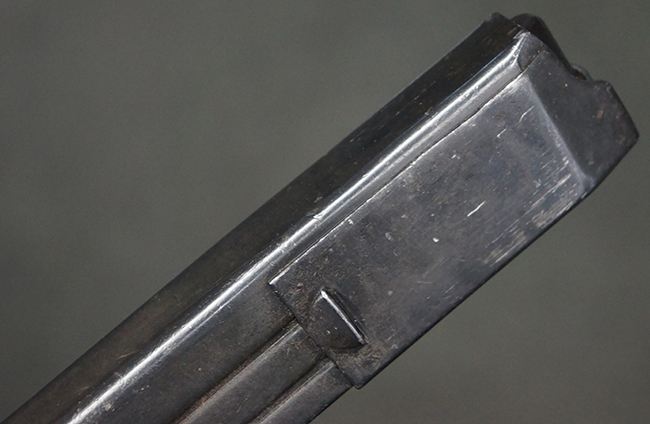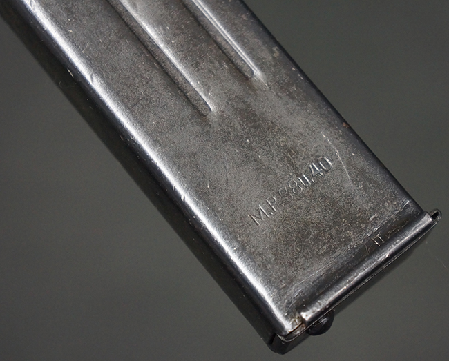 本品の機関部や銃身といった金属部は、やや打ち傷や擦れ、経年による褪色の他、一部に表面錆痕や仕上げが落ちて金属の地肌が表れている箇所が見られるものの、現状目立った欠損等は見受けられず、オリジナルのブルー仕上げも比較的残っています。 樹脂製のハンドガードやグリップ・パネル、バレル・レストについても、やや打ち傷や線傷等は見られるものの、大きな破損等は見られず、比較的良好な状態が保たれています。 アッパー・レシーバーとロア・レシーバーの取り付けには僅かに遊びが見られますが、殆ど気にならないレベルのものです。 マガジンの着脱やリア・サイトの切り替え、ストックの展開・折り畳み操作については問題なく行う事が可能です。 マガジンは取り付け時に前後にやや遊びが見られますが、固定自体はしっかりとしています。 ストックは展開時及び折り畳み時のがたつきも殆ど見られません。 付属のマガジンには「M.P.38 u 40」及び1942年ステアー社製を示す「kur 42」の刻印が入っており、やや打ち傷や擦れ、表面錆痕が見られるものの、大きな凹みや変形は見られず、概ねしっかりとした状態が保たれています。 尚、マガジン・スプリングは入っています。