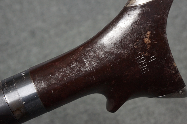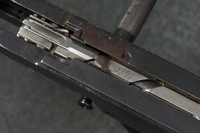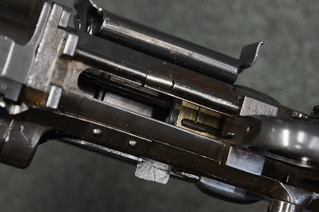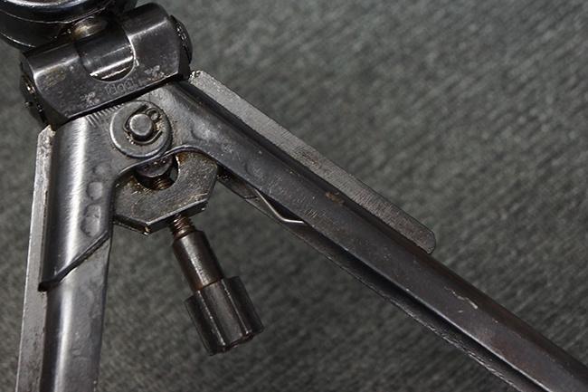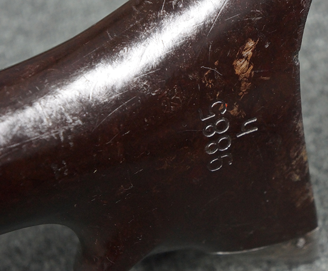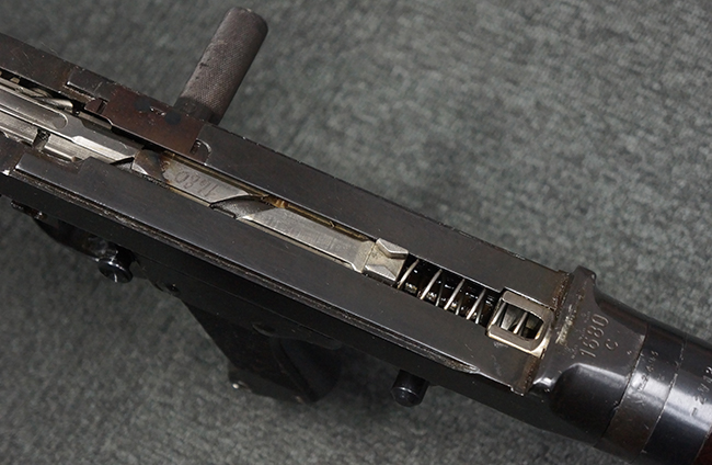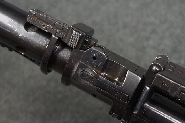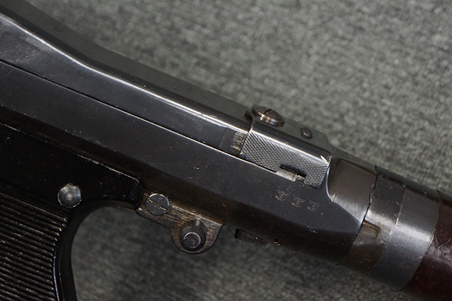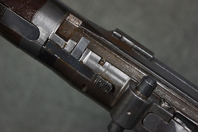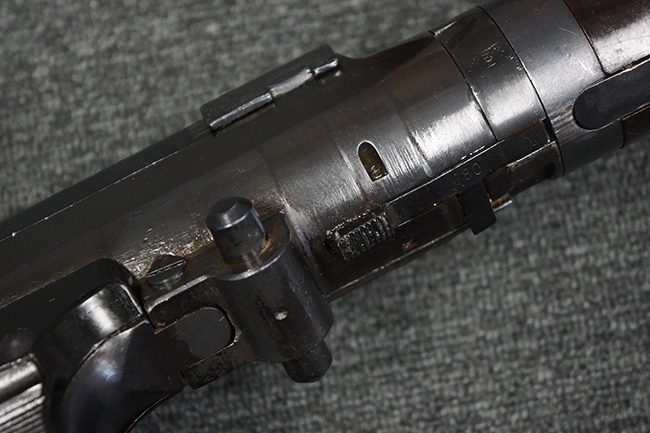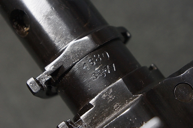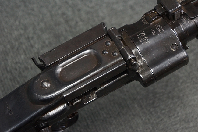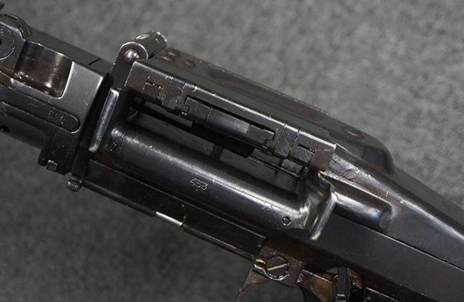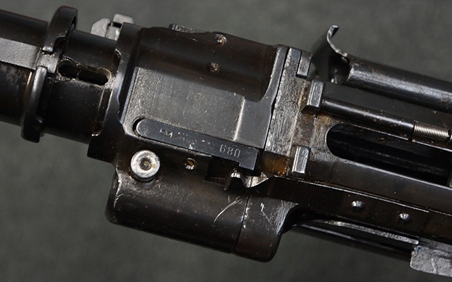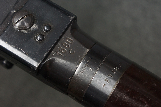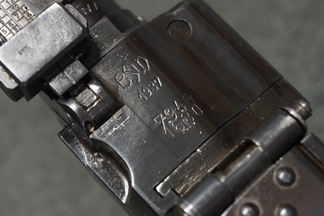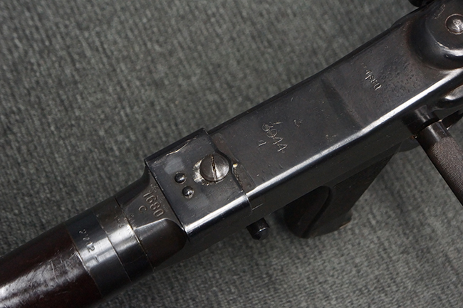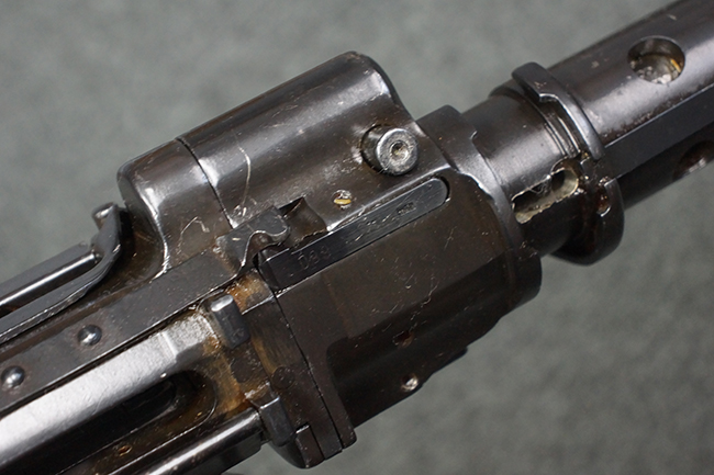 本品の薬室上面には、Berlin-Suhler Waffen- und Fahrzeugwerke社製を示す「BSW」のメーカー刻印や製造年を示す「1937」の刻印が入っています。 レシーバーのシリアルNo.は1680cで、薬室上部、バレル・ジャケット基部、フィード・カバーが打ち直しにより1680でレシーバーとマッチしている他、リア・サイトも680でマッチしています。 また、ボルトにも1680のシリアルNo.が手書きにより入っています。 その他のシリアルNo.については、トリガー・ガードが9681a、バット・ストック基部が2712、バット・ストックが9885h、二脚基部が168となっています。 尚、二脚基部にはEugen Ising社を示す「dqc」のサブ・コントラクター刻印が入っており、フィード・カバーにもメーカーは不明ですが「pem」のコードが確認出来ます。 本品のバレル・ジャケットは放熱孔の数が多い初期のタイプで、バット・ストックについても上下の角の部分に補強の金具が付いた初期タイプとなっています。 その他、各部にアムト刻印が確認出来ます。
