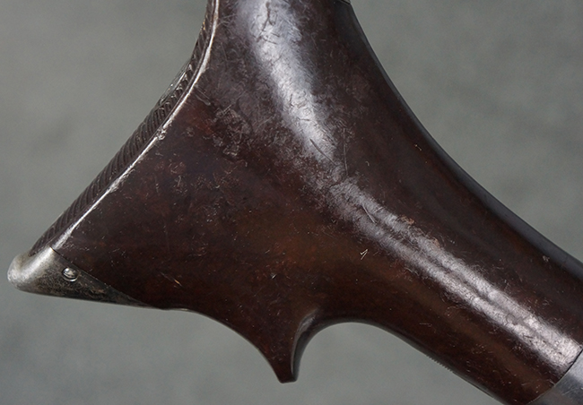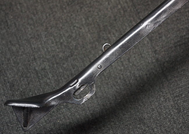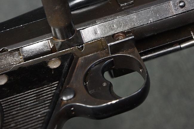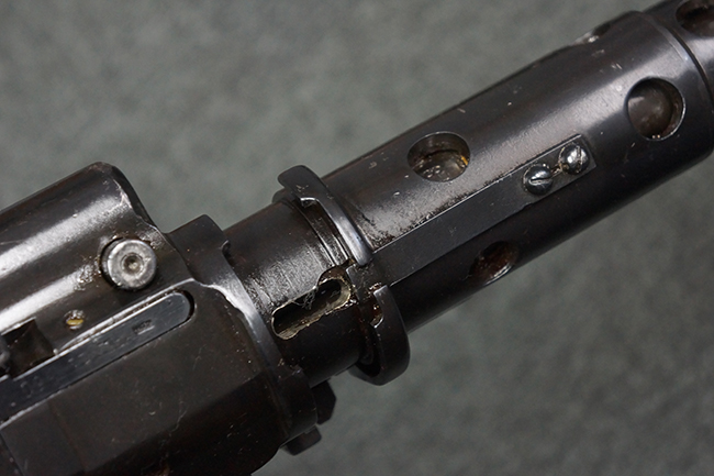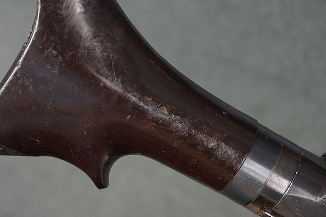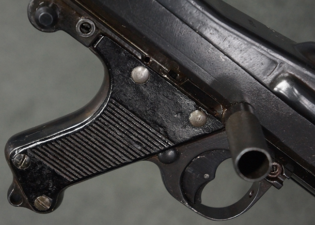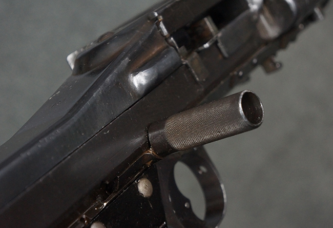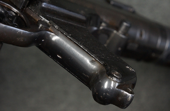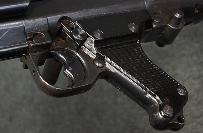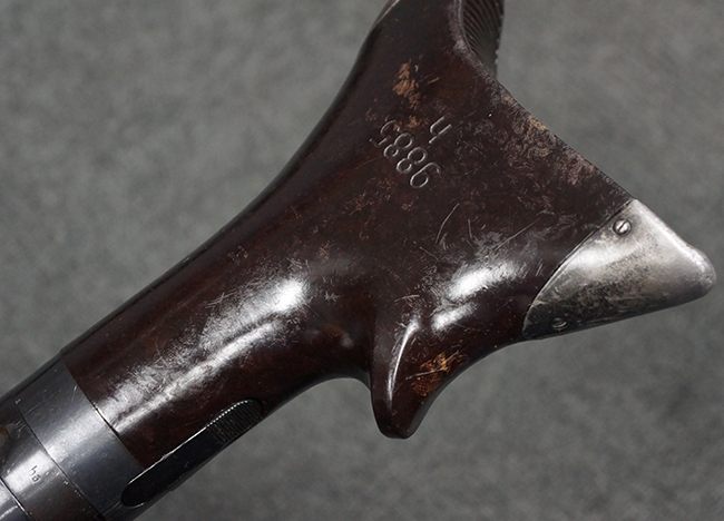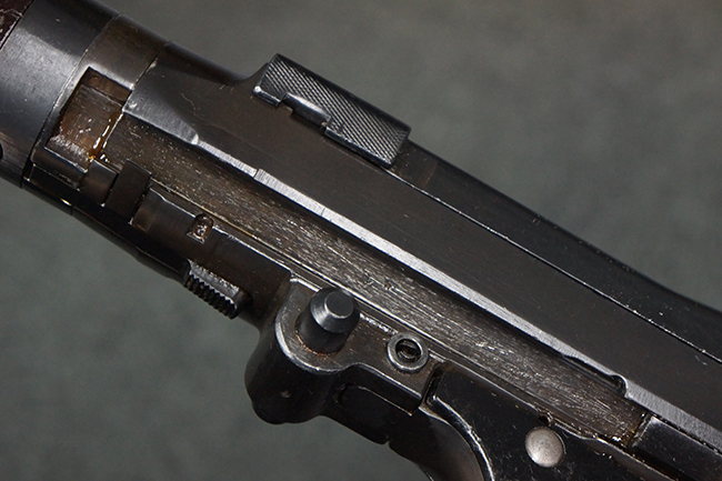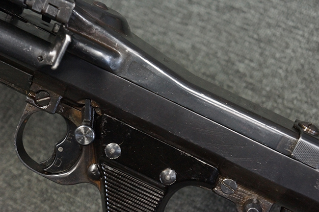 本品のレシーバーやバレル・ジャケットといった金属部は、やや打ち傷や擦れ、経年による褪色の他、一部表面錆痕が見られるものの、現状大きな欠損等は見受けられません。 黒色樹脂製のグリップ・パネルについては、左右ともに色合いはマッチしており、やや打ち傷や擦れの他、左側グリップ・パネル下部の角に僅かな欠けが見られるものの、大きな破損等は見られず、取り付けについても目立ったがたつきは見られません。 バット・ストックについては、やや打ち傷や線傷、若干の摩耗は見られますが、現状目立った割れや欠け等は見受けられず、概ねしっかりとした状態が保たれています。 バット・ストックの上部の角に取り付けられた補強金具に一部ひびが見られますが、強度的には殆ど影響のないレベルのもです。