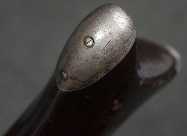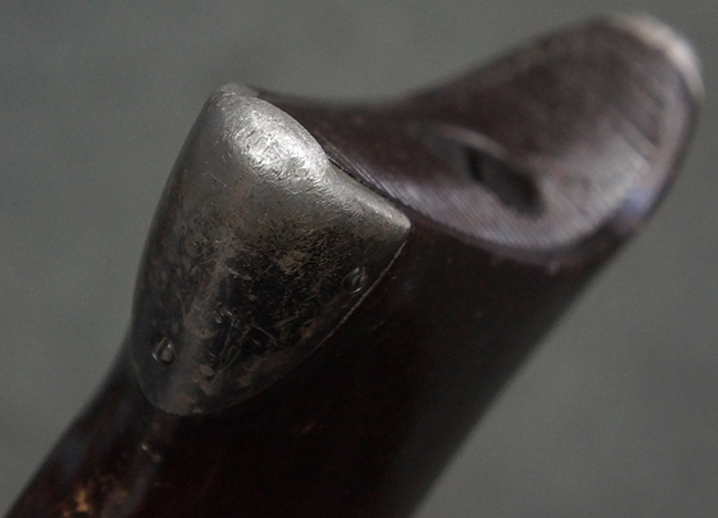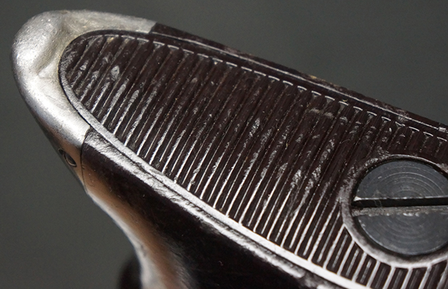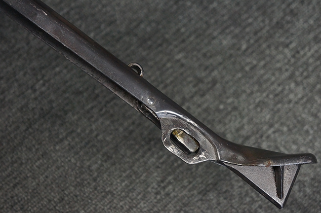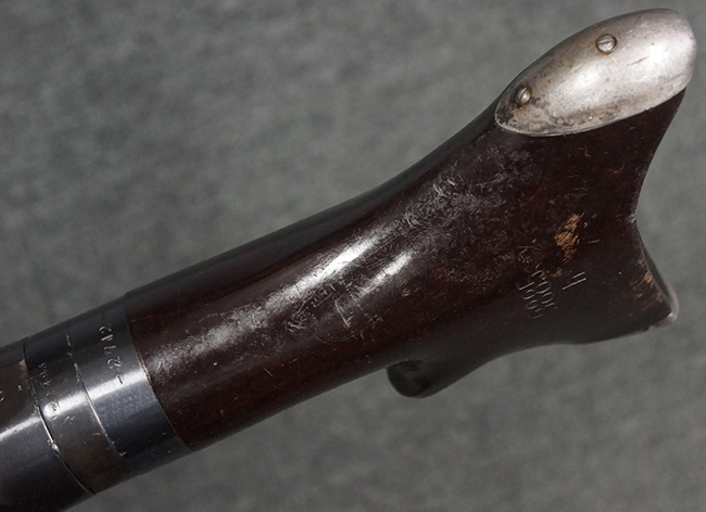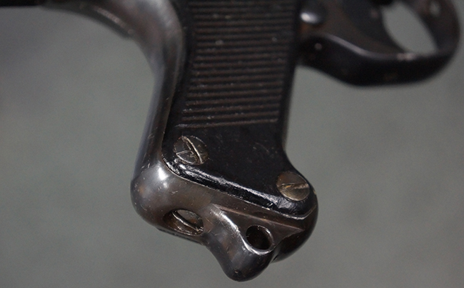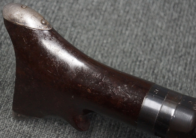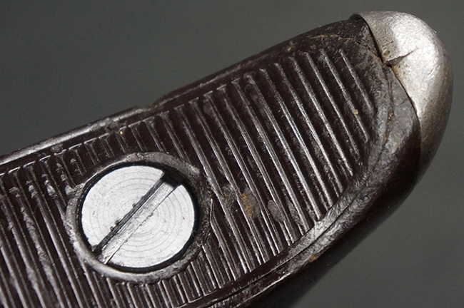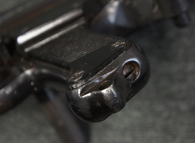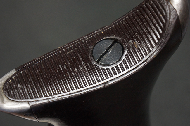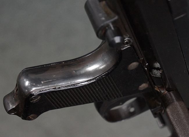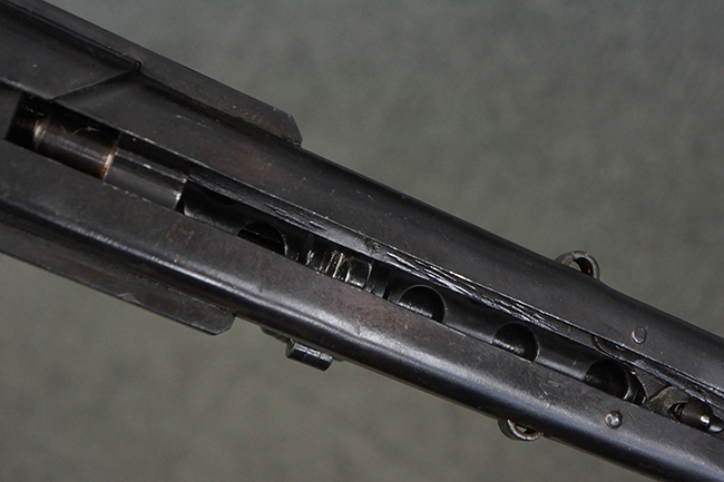 本品のレシーバーやバレル・ジャケットといった金属部は、やや打ち傷や擦れ、経年による褪色の他、一部表面錆痕が見られるものの、現状大きな欠損等は見受けられません。 黒色樹脂製のグリップ・パネルについては、左右ともに色合いはマッチしており、やや打ち傷や擦れの他、左側グリップ・パネル下部の角に僅かな欠けが見られるものの、大きな破損等は見られず、取り付けについても目立ったがたつきは見られません。 バット・ストックについては、やや打ち傷や線傷、若干の摩耗は見られますが、現状目立った割れや欠け等は見受けられず、概ねしっかりとした状態が保たれています。 バット・ストックの上部の角に取り付けられた補強金具に一部ひびが見られますが、強度的には殆ど影響のないレベルのもです。