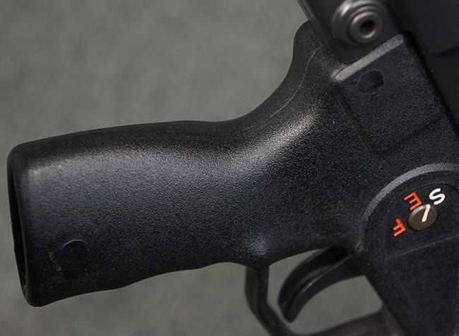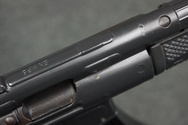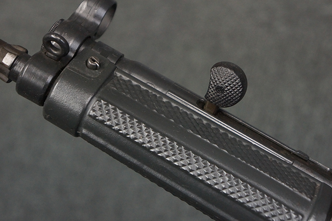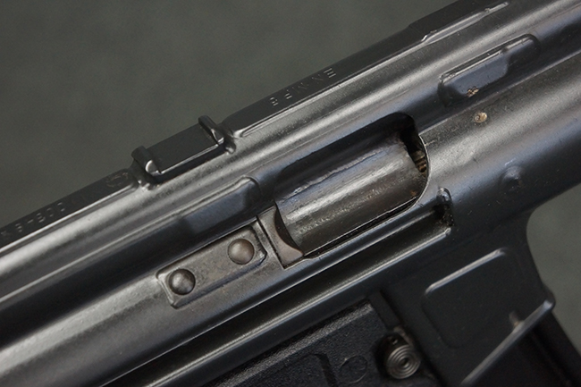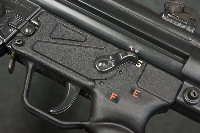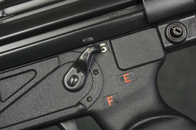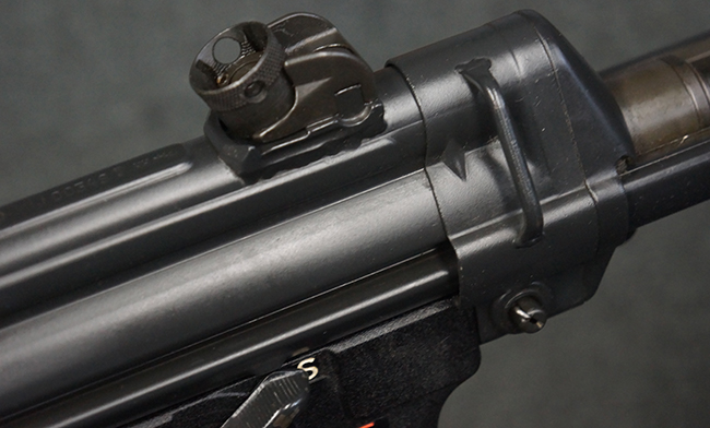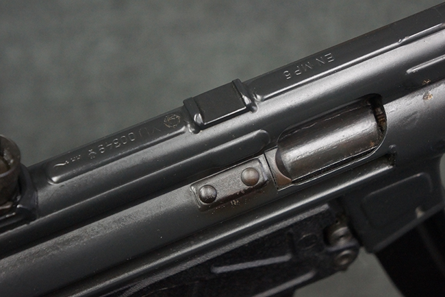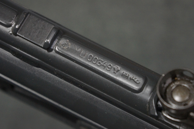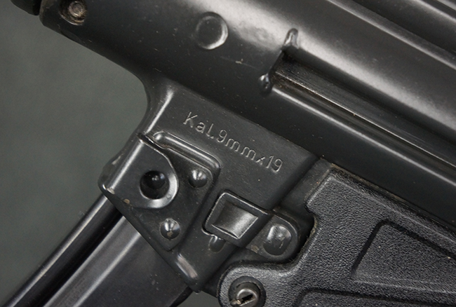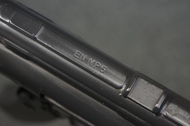 本品はHK社オリジナルのドイツ製部品を英国にて組み立てた品で、レシーバー上面には、「EN MP5」のモデル名やドイツのHK社所在地であるバーデン=ヴュルテンベルク州オーベルンドルフを管轄するウルム (バーデン=ヴュルテンベルク州南部) のプルーフ・ハウス刻印、「連邦共和国の鷲」と「N」を組み合わせた最終検査刻印、検査年を示す刻印が入っています。 本品はユーゴスラビア輸出向けに生産された品と考えられ、レシーバー上面にはユーゴスラビアの国章が打刻されている他、シリアルNo.の先頭にユーゴスラビアを示すと思われる「YU」のアルファベットが追加で打刻されています。 本品のマガジン・ハウジング左側面の口径表示は「Kal.9mm×19」のドイツ語表記となっています。 トリガー・ハウジングはセレクターが「S-E-F」のアルファベット表示で、グリップ前部にフィンガー・チャンネルの有るタイプとなっています。