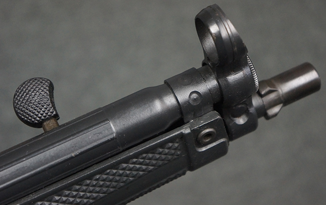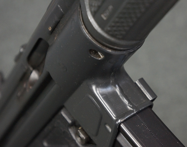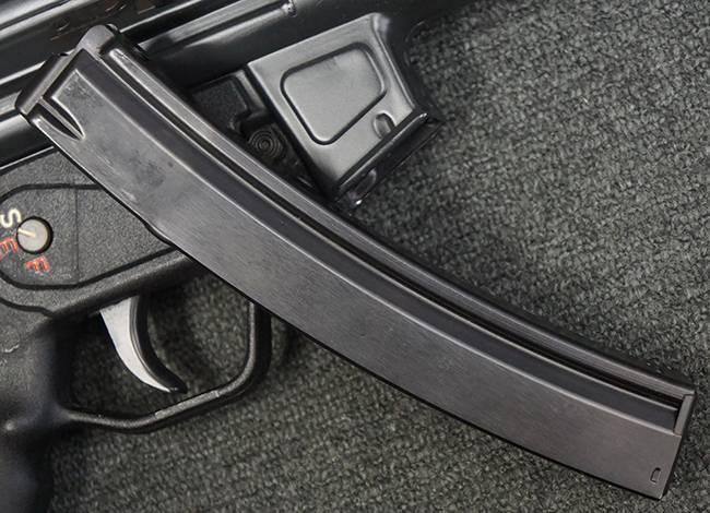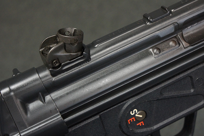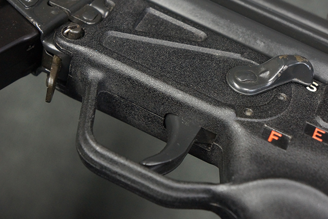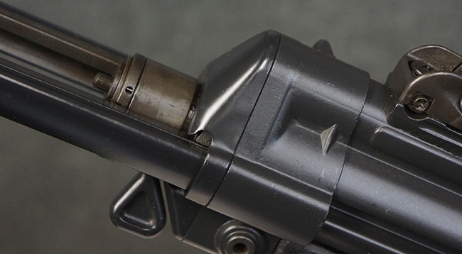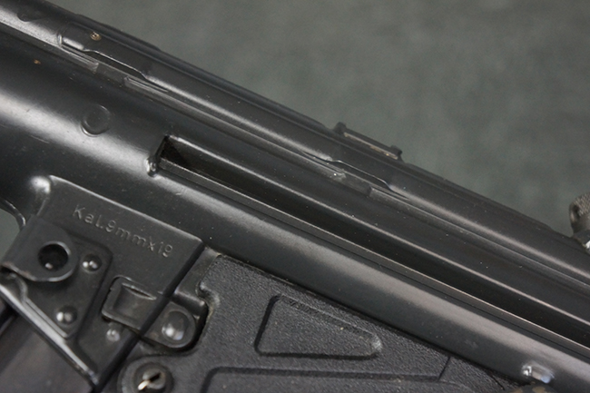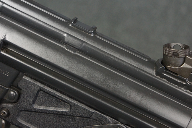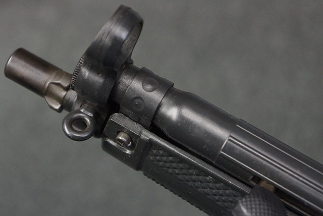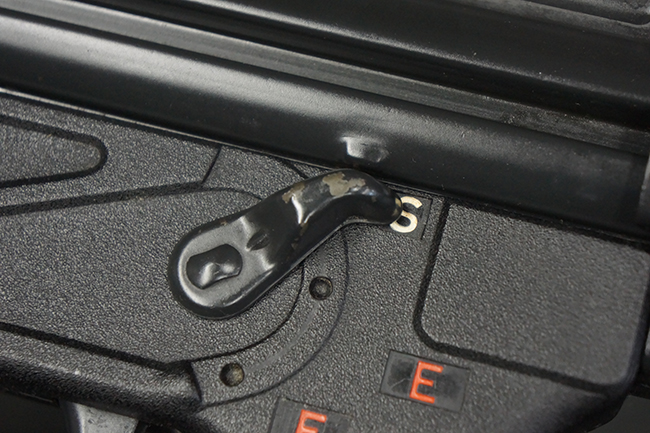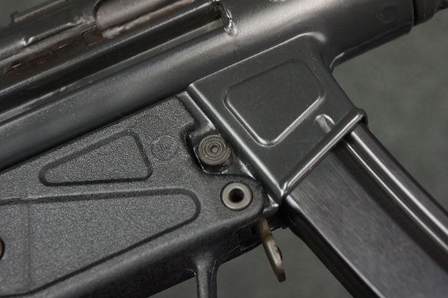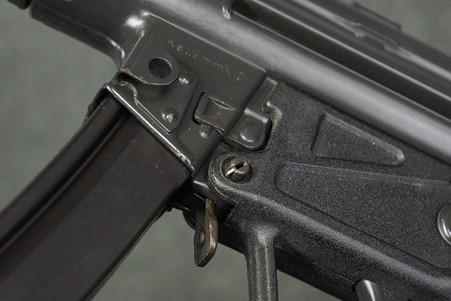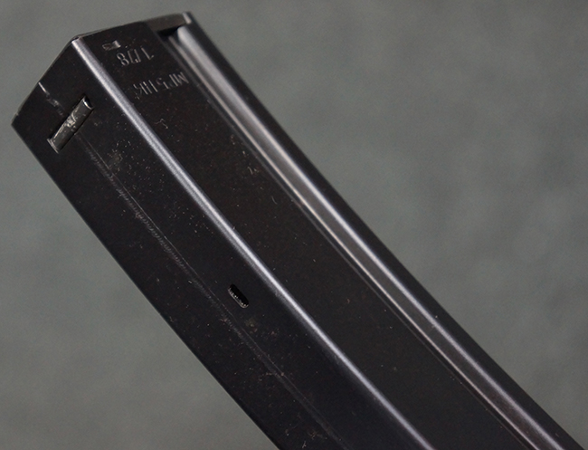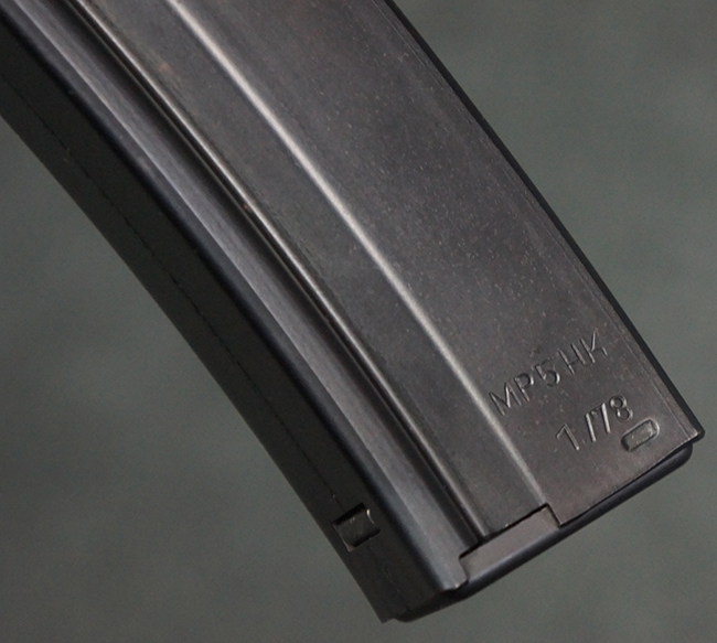 本品は使用感も比較的少なく、金属部は若干の打ち傷や擦れ、一部表面仕上げの剥落が見られるものの、目立った欠損や錆などは見受けられず、オリジナルの仕上げも大部分に残っています。 ハンドガードやトリガー・ハウジングといった樹脂部についても、若干の打ち傷や擦れは見られるものの、概ね良好な状態が保たれています。 マガジンの着脱やリア・サイトの調整、ストックの伸縮操作については問題なく行う事が可能です。 セレクターの切り替えについても問題なく、セレクター・ポジションに応じてトリガーの引きしろが変化し、安全位置でトリガーがロックされます。 付属のマガジンは「MP5 HK 1/78」の刻印が入ったHK社製で、若干の小傷や擦れを除いて目立った凹みや変形等は見受けられません。 尚、マガジン・スプリングは入っています。