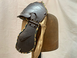 鉢金(はちがね)とは、兜の頭を覆う鉢の後ろ半分を省略した防具です。 元は兜の鉢そのものを表す俗称でした。 数枚の鉄板を鉄鋲(てつびょう)と呼ばれる金具、韋(かわ)で結び合わせる韋威(かわおどし)、鎖繋(くさりつなぎ)などで作られた物、または1枚の鉄板を打ち延ばして作る物など様々な作りの物があります。 装飾の無いシンプルな作りですが、機能性や防御力は十分にりました。 兜と同様に、額を覆う眉庇(まびさし)や正面に向けて折り返し部分の吹返(ふきかえし)、鍬形を付ける台の角本(つのもと)が付いている場合もあります。