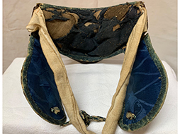 本品は鉄錆地四枚張鉢金と呼ばれるもです。 両蟀谷(こめかみ)に当たる部分に四枚のよく鍛えた鉄板を鉄鋲で重ねて留め、鉄板を弧を描くようにずらして開閉できる構造となっています。 着用時に額上部に来る、最上段の鉄板に形の良い眉庇を五個の鉄鋲で留めてあります。 目庇の両脇に、鉢金と同じ作りの鉄錆地の頬当が丈夫な蝶番によって取り付けられています。 鉢金の裏側には黒、頬当の裏側には紺の木綿の家地が取り付けられており、鉄が直接肌に触れるのを防いでいます。 頬当の付け根に、首に巻いて固定するための木綿布も縫い付けられています。 額に当たる部分の家地は破れています。