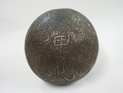 - アイテム説明昇り竜や漢字の銀象嵌があしらわれた砲丸3点です。 直径には若干の差が見られ、小が約10,3cm、中が約11,5cm、大が約12cmとなっています。 重量はそれぞれ小が約4,3kg、中が約4,5kg、大が約5,5kgとなっています。 どの砲丸にも共通して昇り竜の銀象嵌と「三保公大人元」「九?(ふ)」の文字や末端が輪になった十字架の意匠が見られます。 砲丸にはやや凹みや小穴、朽ち込み錆が見られますが、相応の時代がついており全体的にしっかりした状態が保たれています。 どのような用途で銀象嵌入りの砲弾が作られたかは判りませんが、時代があって珍しい品であることは間違いありません。