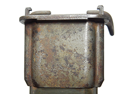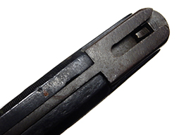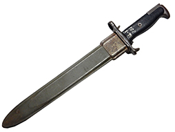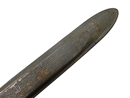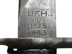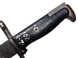 - アイテム説明M1 ガーランドで使用されるM1銃剣 (剣先無)です。 刀身は根元から約5cmほどの位置でカットされており、剣先は付属しません。 銃剣本体は擦れや僅かな表面錆が見られるものの、全体的に良好な状態です。 剣身根元には鮮明な打刻でU.F.H.(Union Fork and Hoe社) USとあり、製造年の1943の刻印も確認できます。管理のペイントが施された樹脂製グリップ・パネルには小傷や磨耗が散見されるものの、大きな割れ等もなくしっかりと取り付けられています。 着剣装置のロック金具に関してもしっかりとテンションが残っています。 付属のM7スキャバードは金属部に表面錆が見られ、鞘には擦れや打ち傷など経年感が見られますが、大きな打ち傷や欠けは見られず概ね良好な状態が保たれています。 (AW)