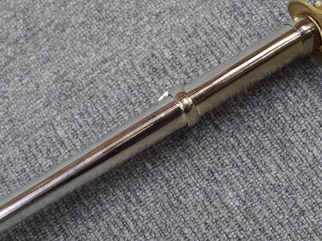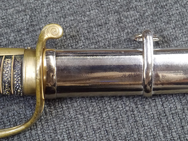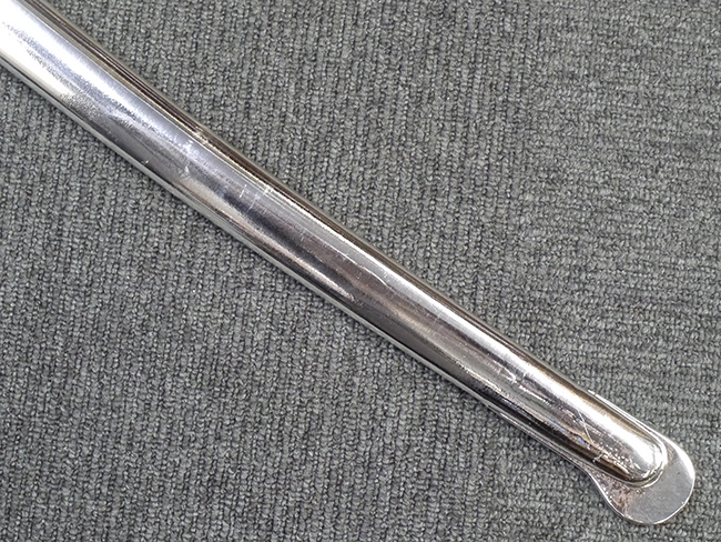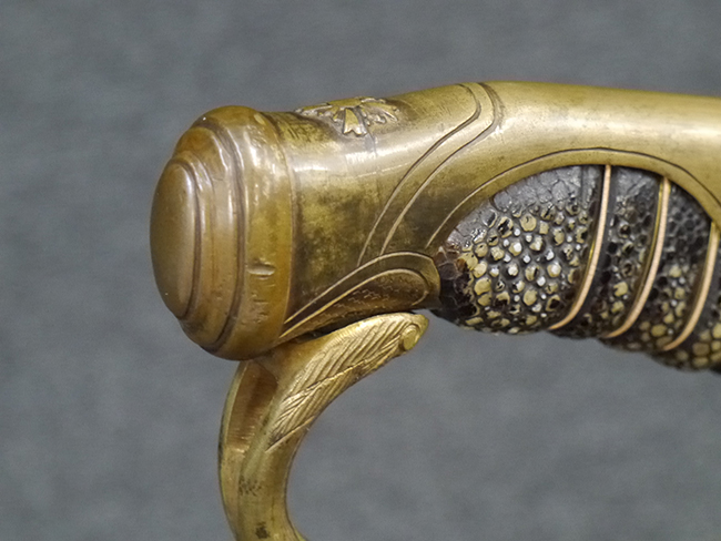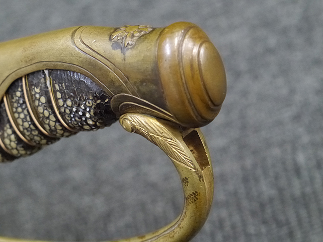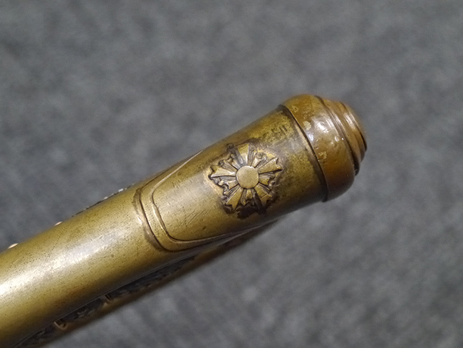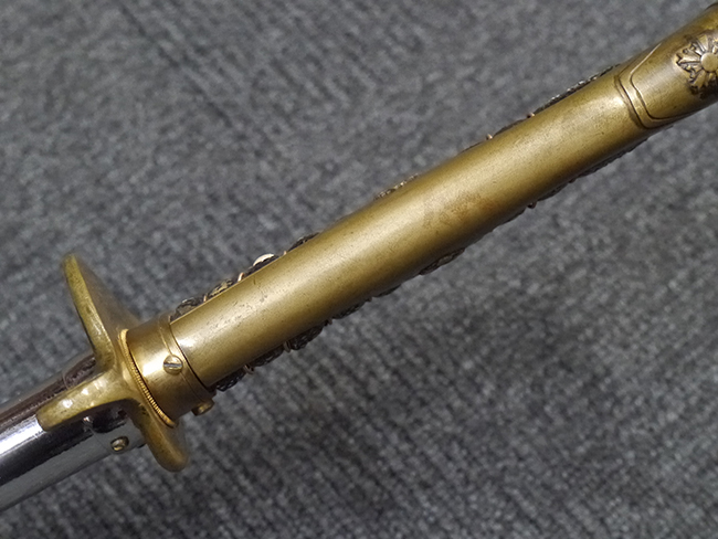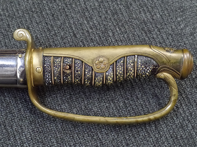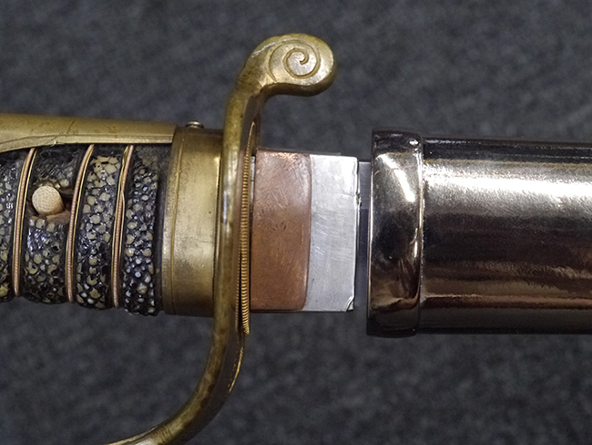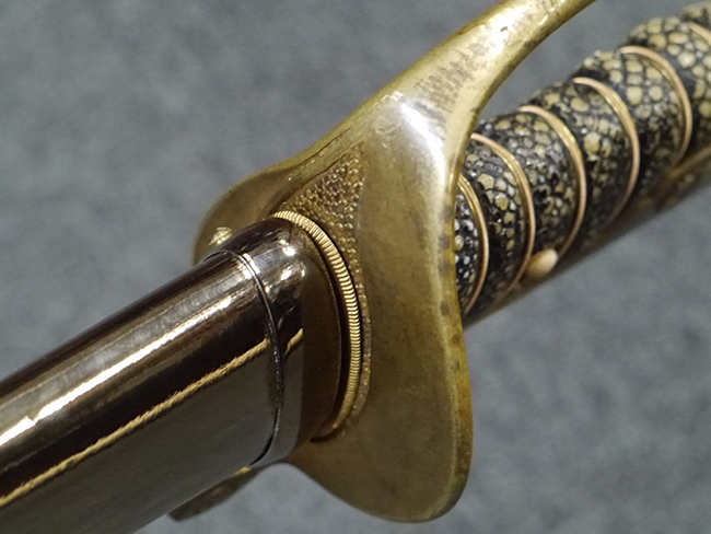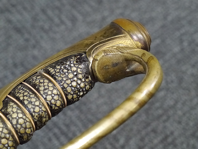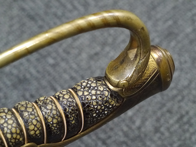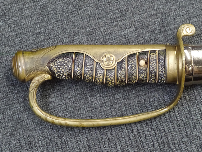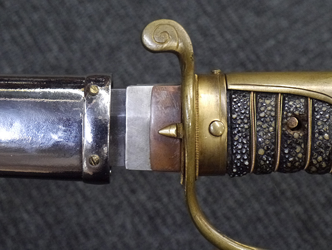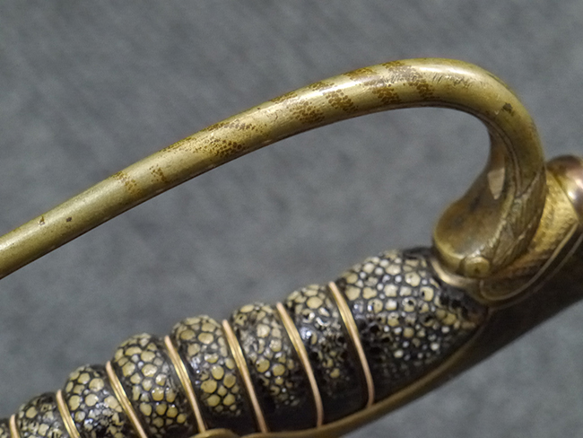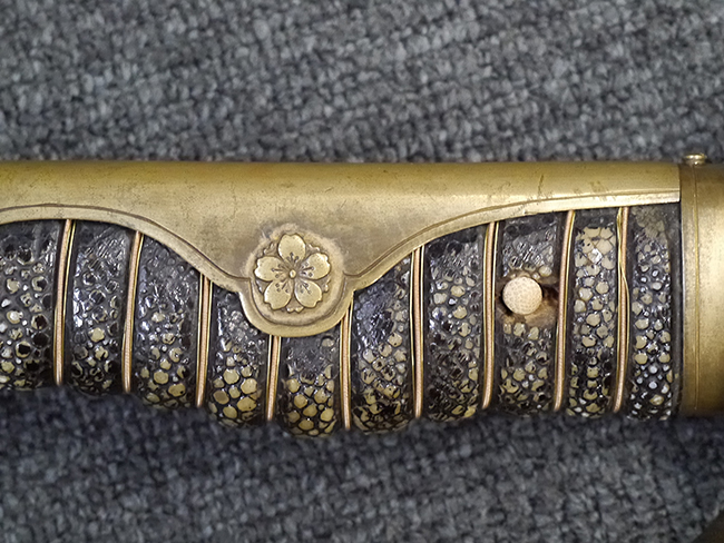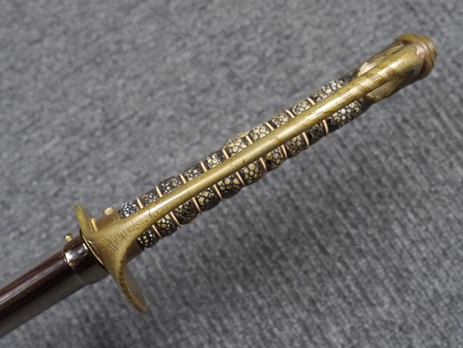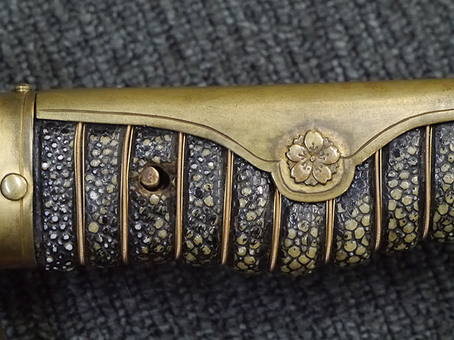 片手握り用の柄は黒鮫で柄巻にはやや使用感が見られるものの、目立った剥落や破損はありません。 三重金線(太1本、細2本)は一部切れや緩みが見られます。 ◇に内河?と小さく彫られた護拳には経年による退色や擦れなどは見られるものの、こちらもしっかりとしており背金終端には警察を象徴する旭日章が見られます。 駐爪の発条(バネ)も若干のがたはあるものの、しっかりと効いて掛かり作動もスムーズです、切羽は2枚(無刻印)となっていて目釘は一か所となっています。 若干遊びが見られるはばきは銅製で2つ重ねる構造となっています。 鞘は一部に擦れは見られるもののきれいに再鍍金が施されており、佩鐶などにも変形は見られません。