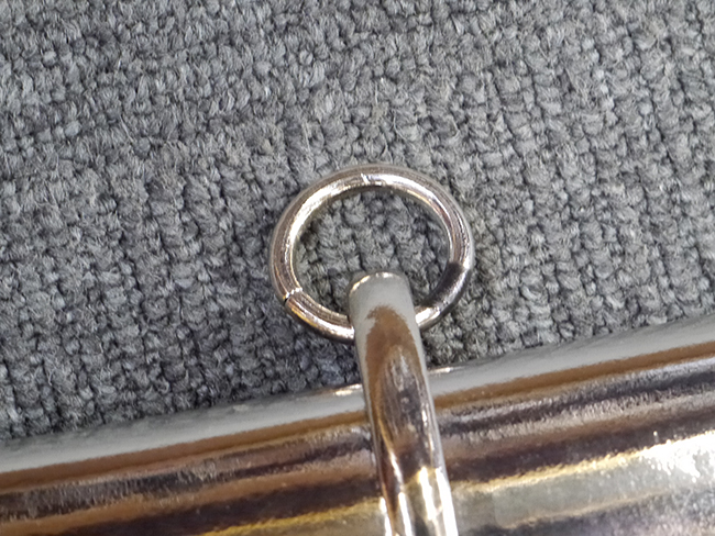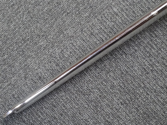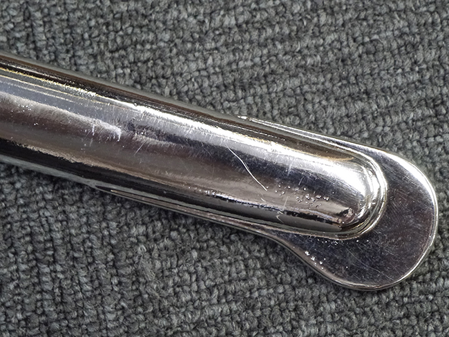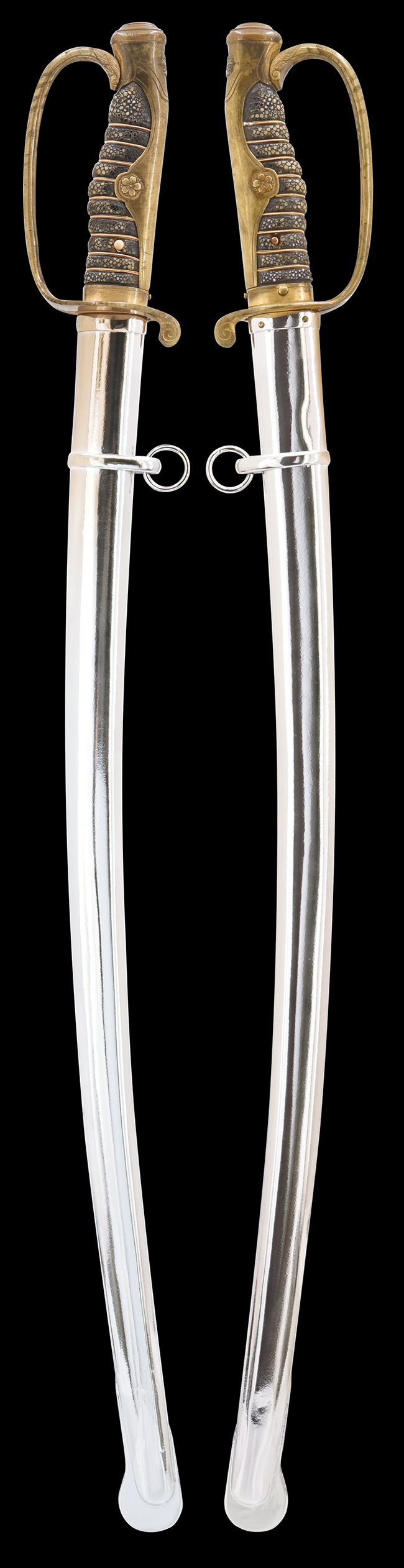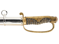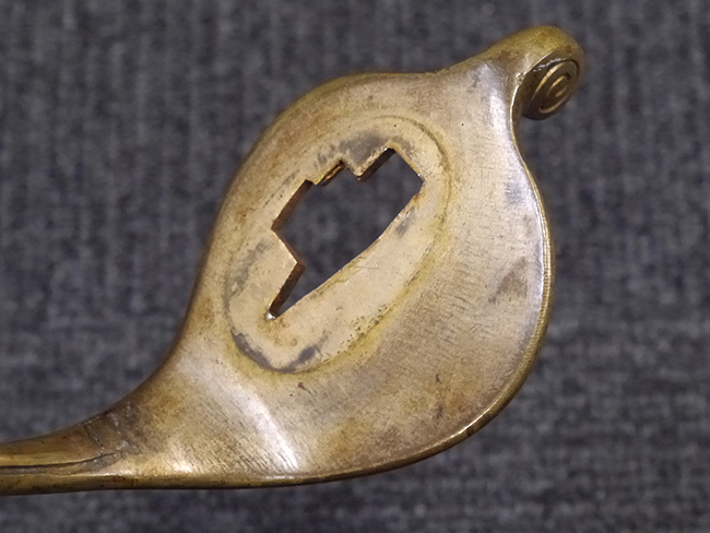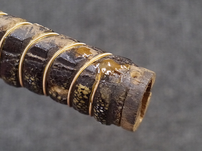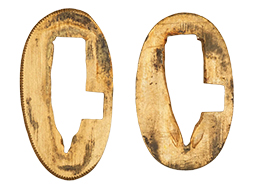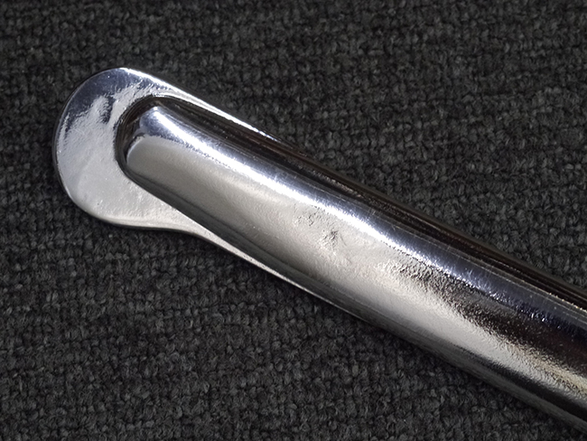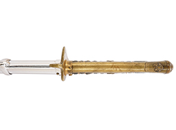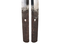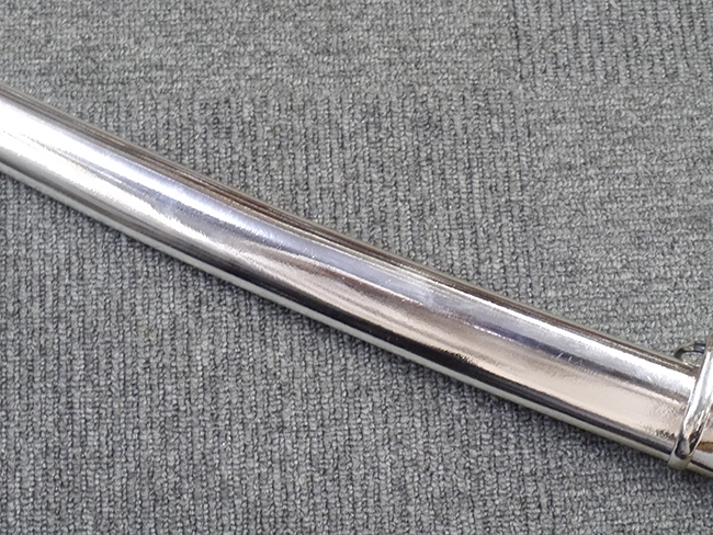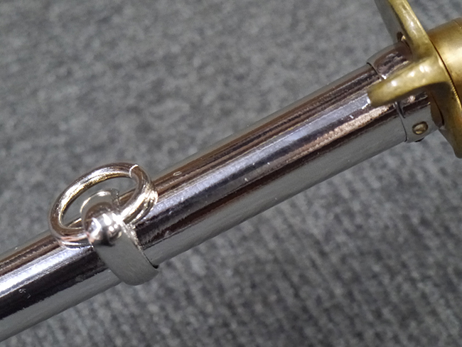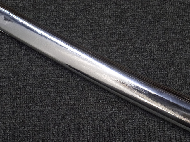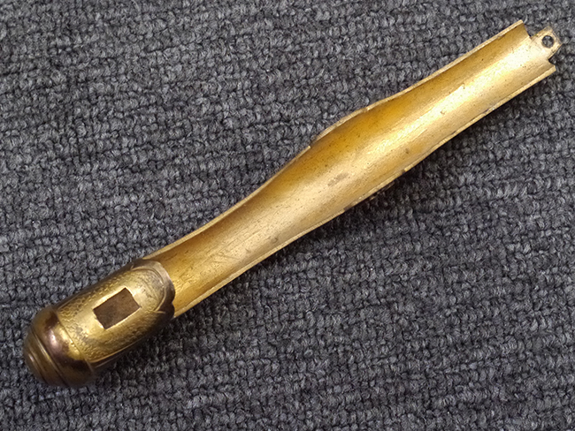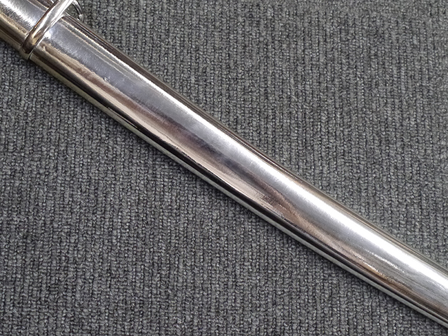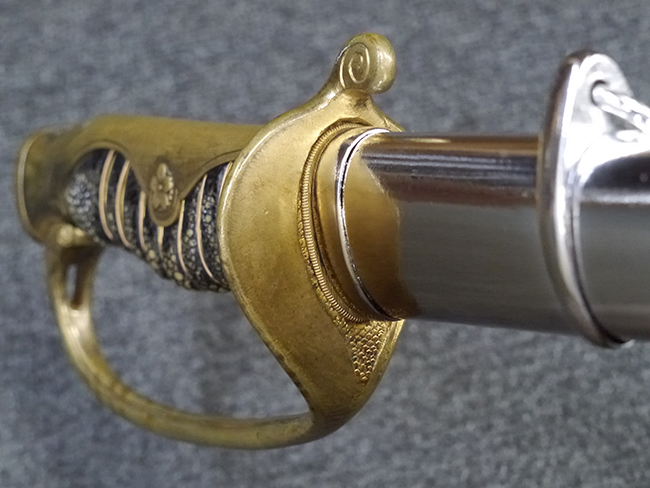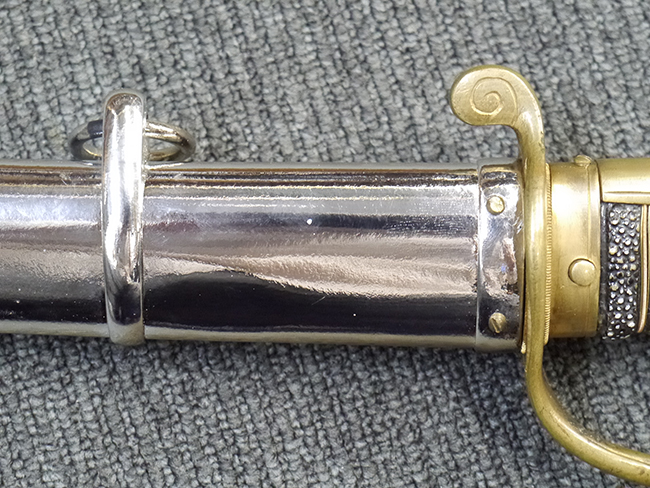 片手握り用の柄は黒鮫で柄巻にはやや使用感が見られるものの、目立った剥落や破損はありません。 三重金線(太1本、細2本)は一部切れや緩みが見られます。 ◇に内河?と小さく彫られた護拳には経年による退色や擦れなどは見られるものの、こちらもしっかりとしており背金終端には警察を象徴する旭日章が見られます。 駐爪の発条(バネ)も若干のがたはあるものの、しっかりと効いて掛かり作動もスムーズです、切羽は2枚(無刻印)となっていて目釘は一か所となっています。 若干遊びが見られるはばきは銅製で2つ重ねる構造となっています。 鞘は一部に擦れは見られるもののきれいに再鍍金が施されており、佩鐶などにも変形は見られません。