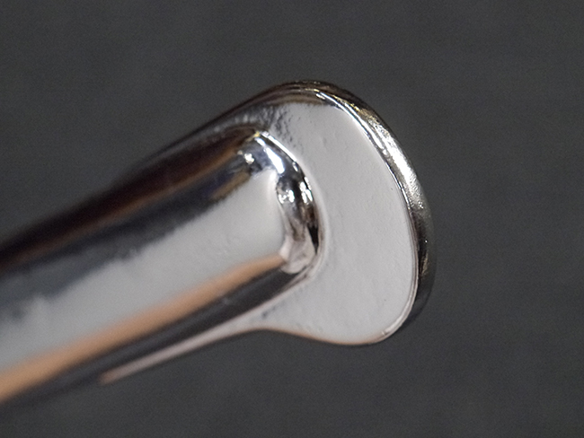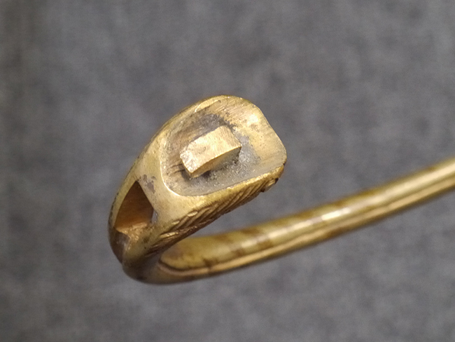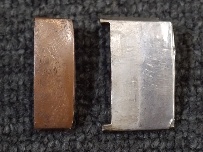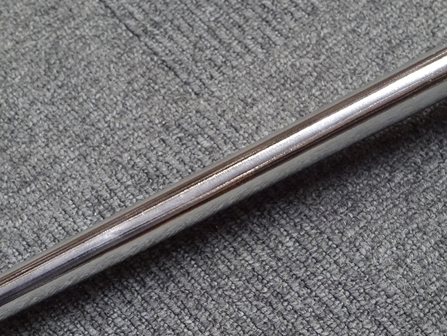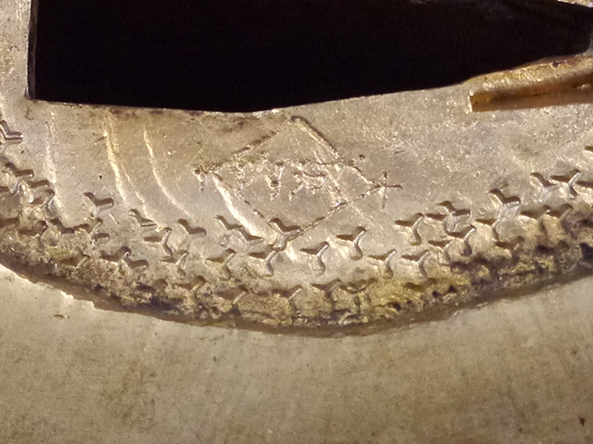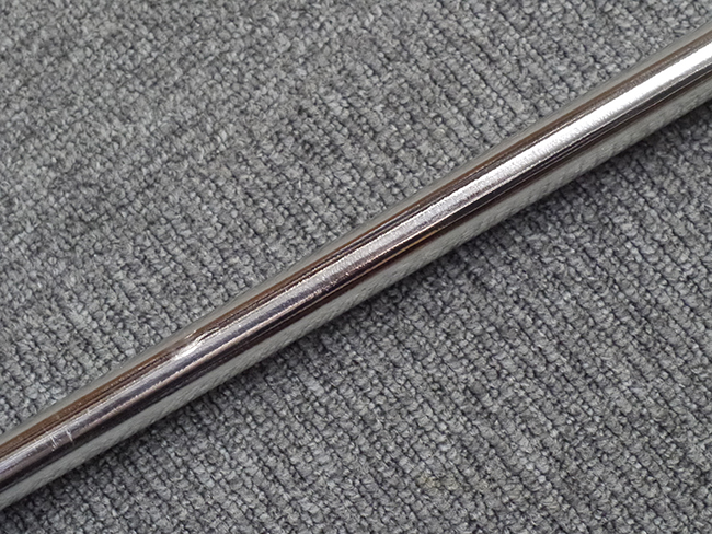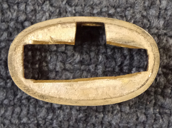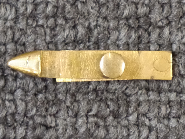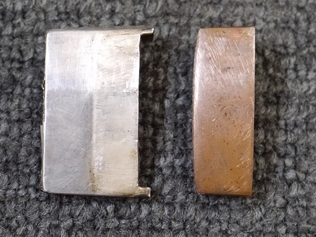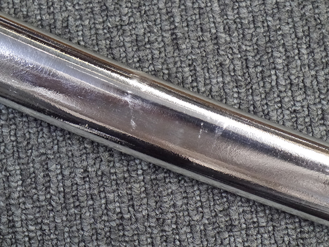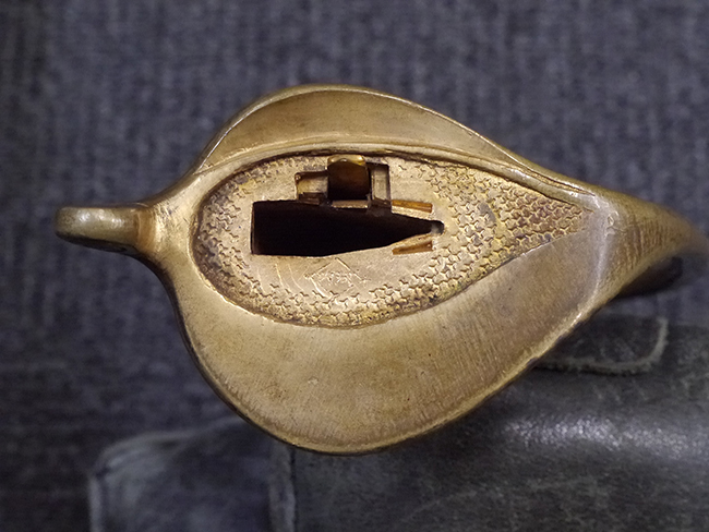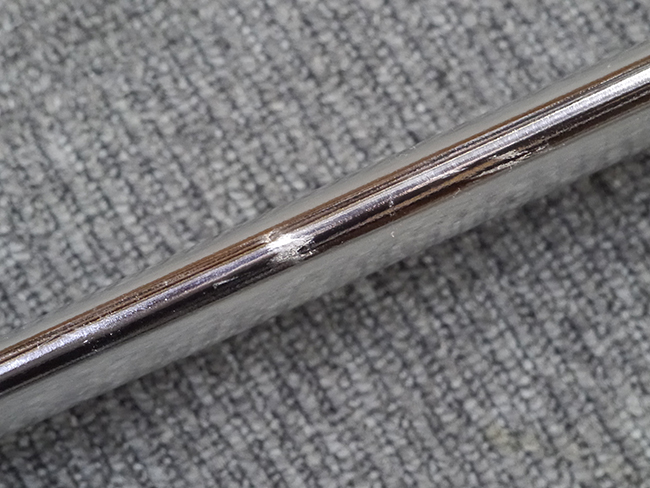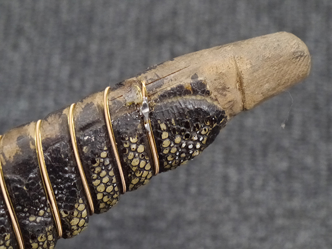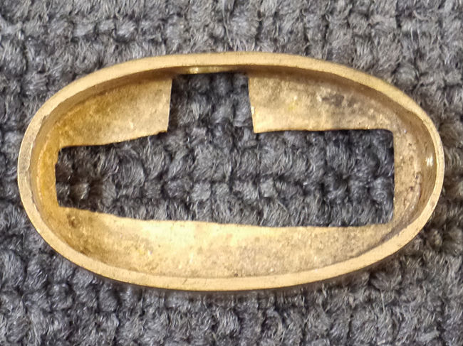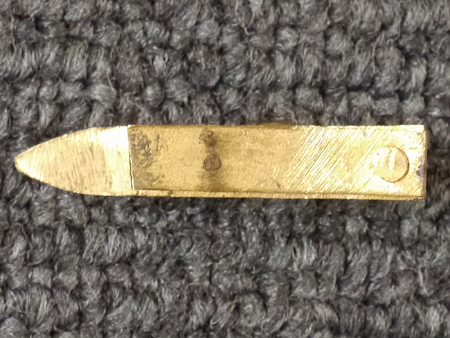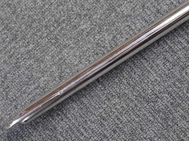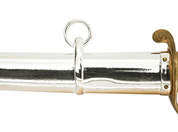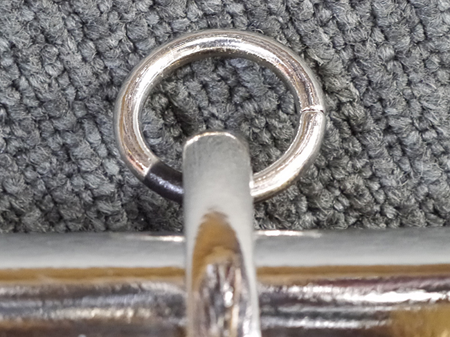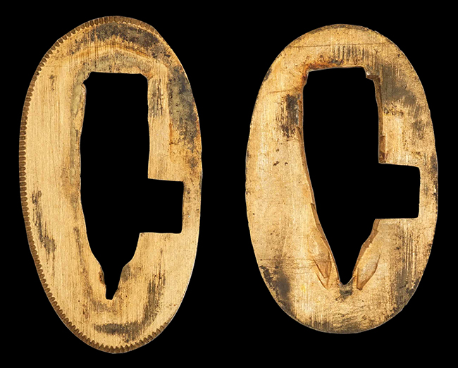 片手握り用の柄は黒鮫で柄巻にはやや使用感が見られるものの、目立った剥落や破損はありません。 三重金線(太1本、細2本)は一部切れや緩みが見られます。 ◇に内河?と小さく彫られた護拳には経年による退色や擦れなどは見られるものの、こちらもしっかりとしており背金終端には警察を象徴する旭日章が見られます。 駐爪の発条(バネ)も若干のがたはあるものの、しっかりと効いて掛かり作動もスムーズです、切羽は2枚(無刻印)となっていて目釘は一か所となっています。 若干遊びが見られるはばきは銅製で2つ重ねる構造となっています。 鞘は一部に擦れは見られるもののきれいに再鍍金が施されており、佩鐶などにも変形は見られません。