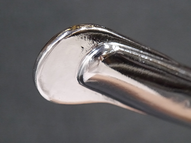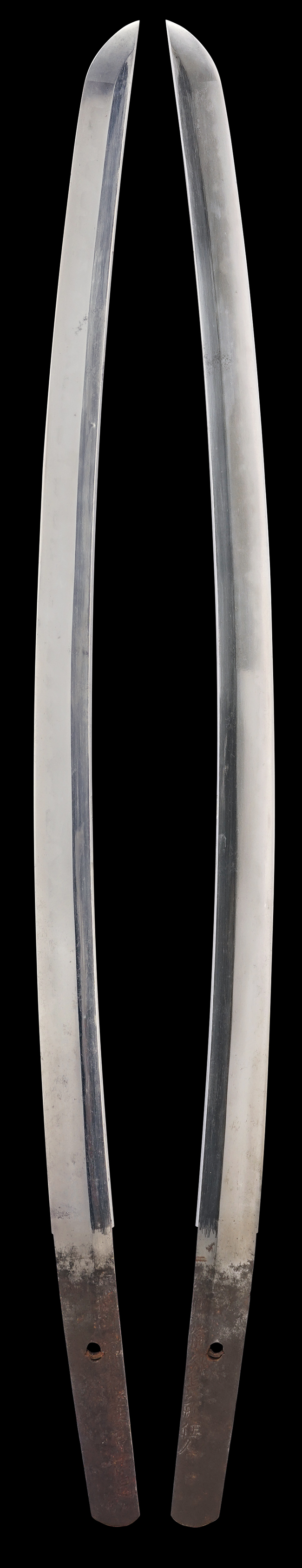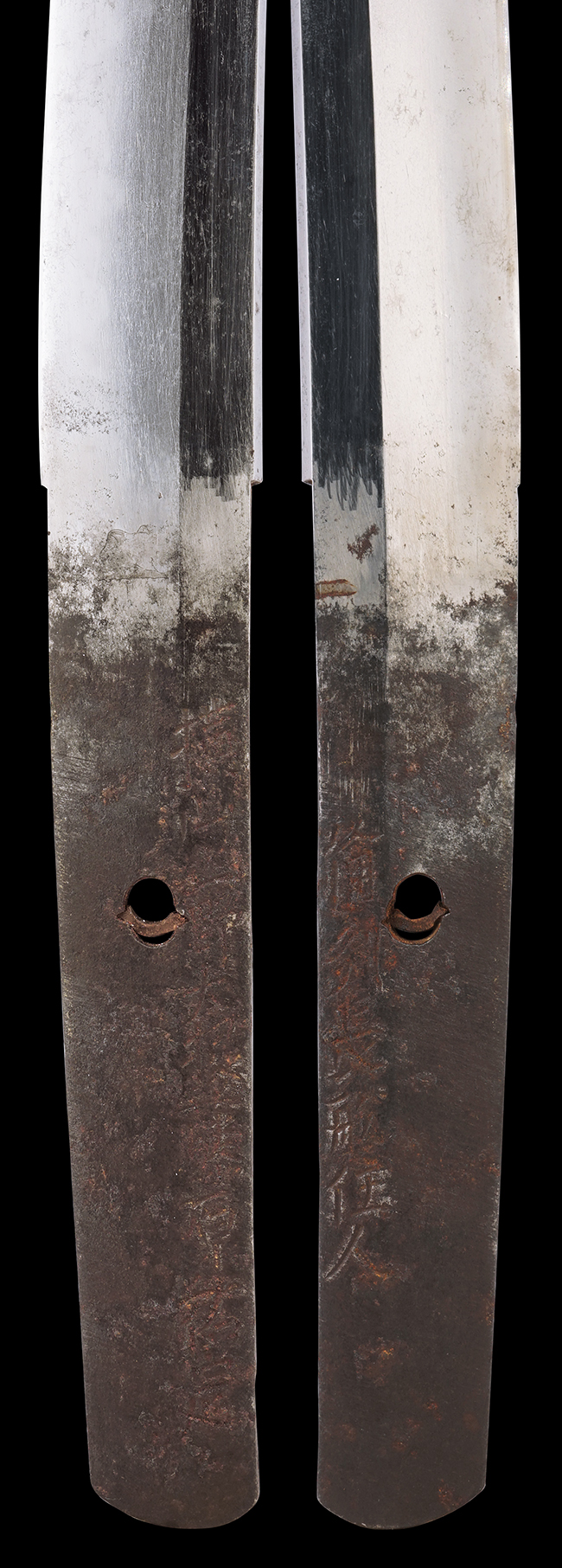 刀身は脇差でやや小振りな印象で、前方の物打には小さな刃こぼれが見られ、鎬地には一箇所ふくれが見られますが、全体にしっかりとした造りをしています。 銘の打たれた茎は黒錆に覆われています。